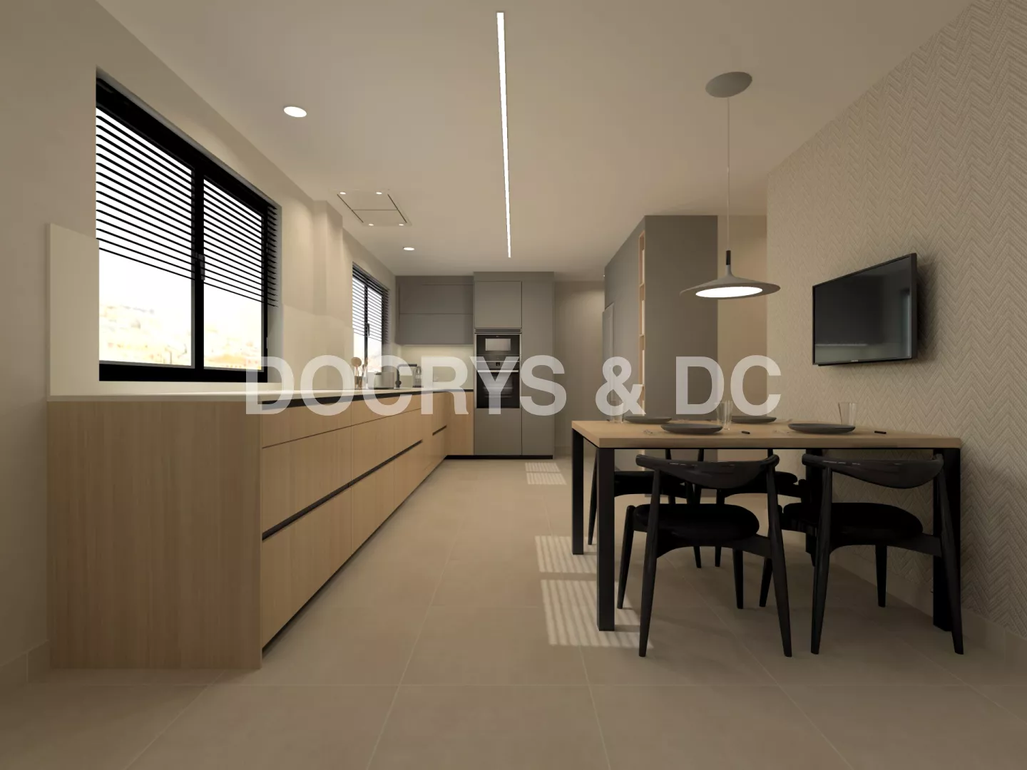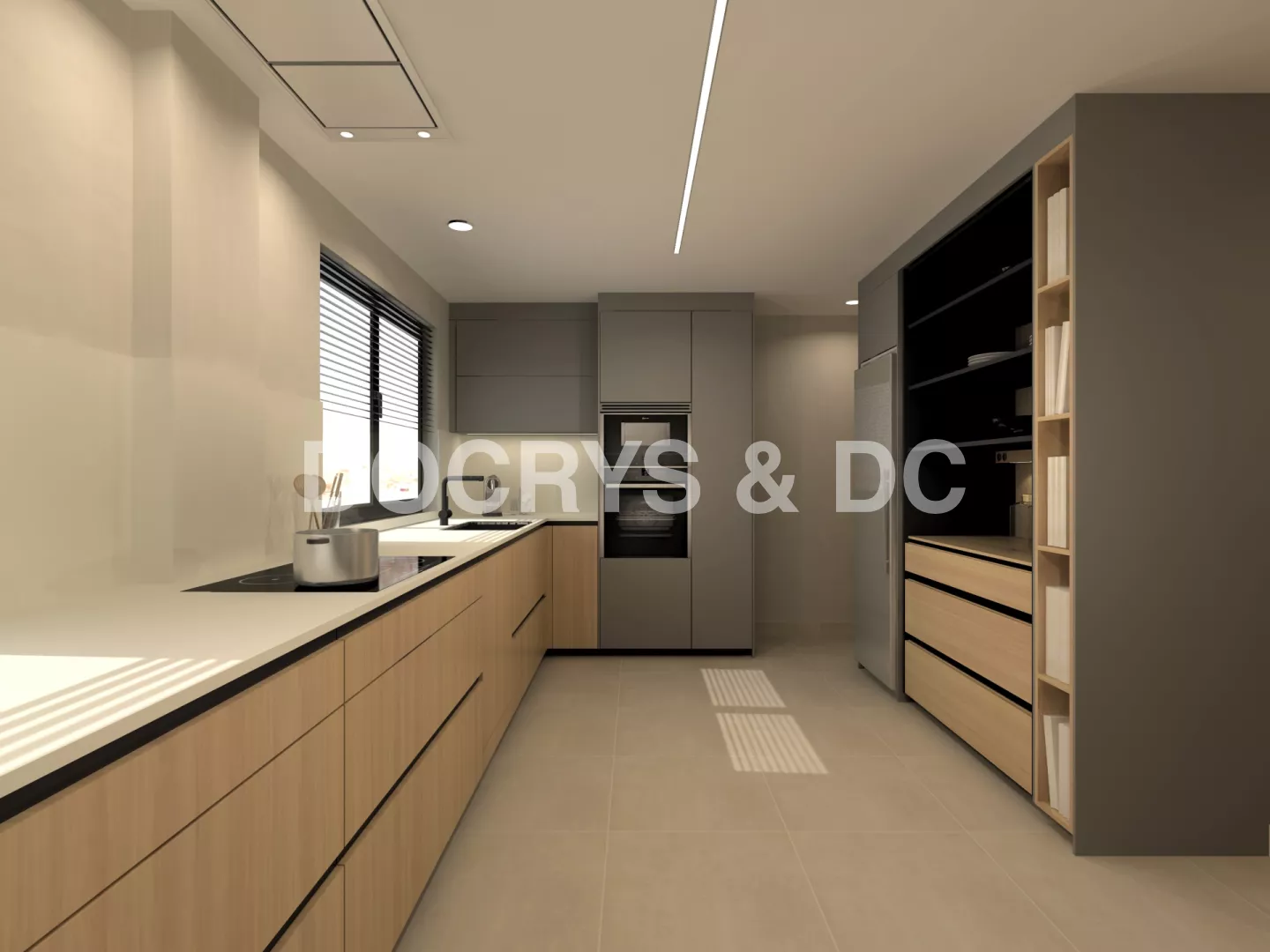 Cocina Santos en color Olmo claro y Gris visón con material Laminado madera y estratificado y encimera de Neolith en color Artic white en acabado Silk.