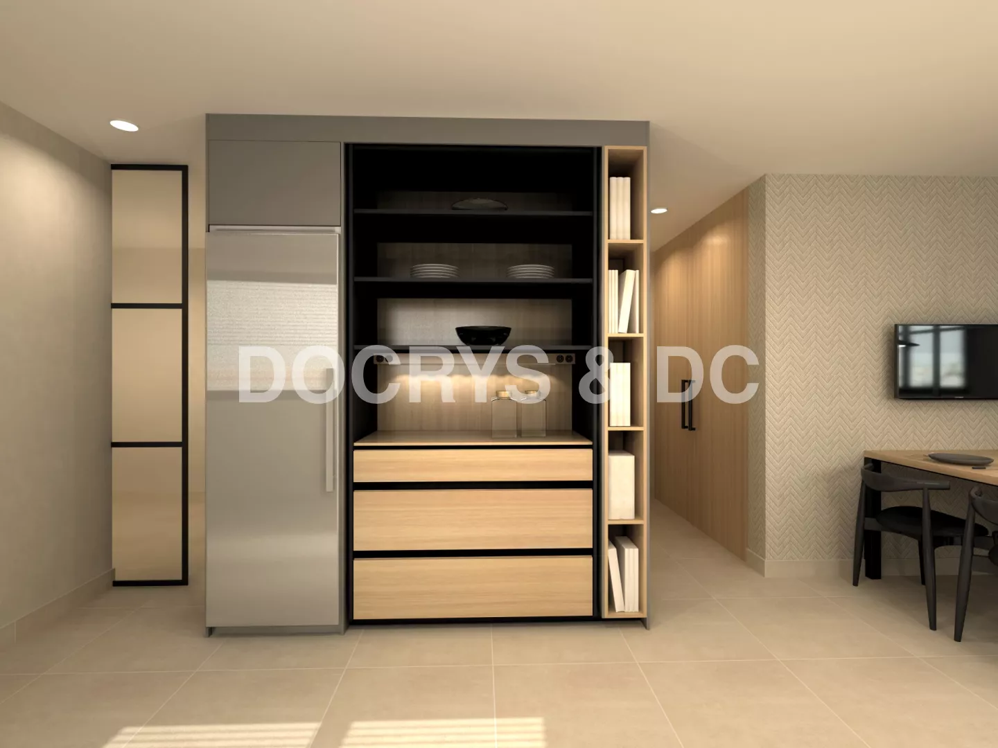 En el otro frente está compuesto por columnas, donde se ubican los grandes electrodomésticos, además de un desayunador.