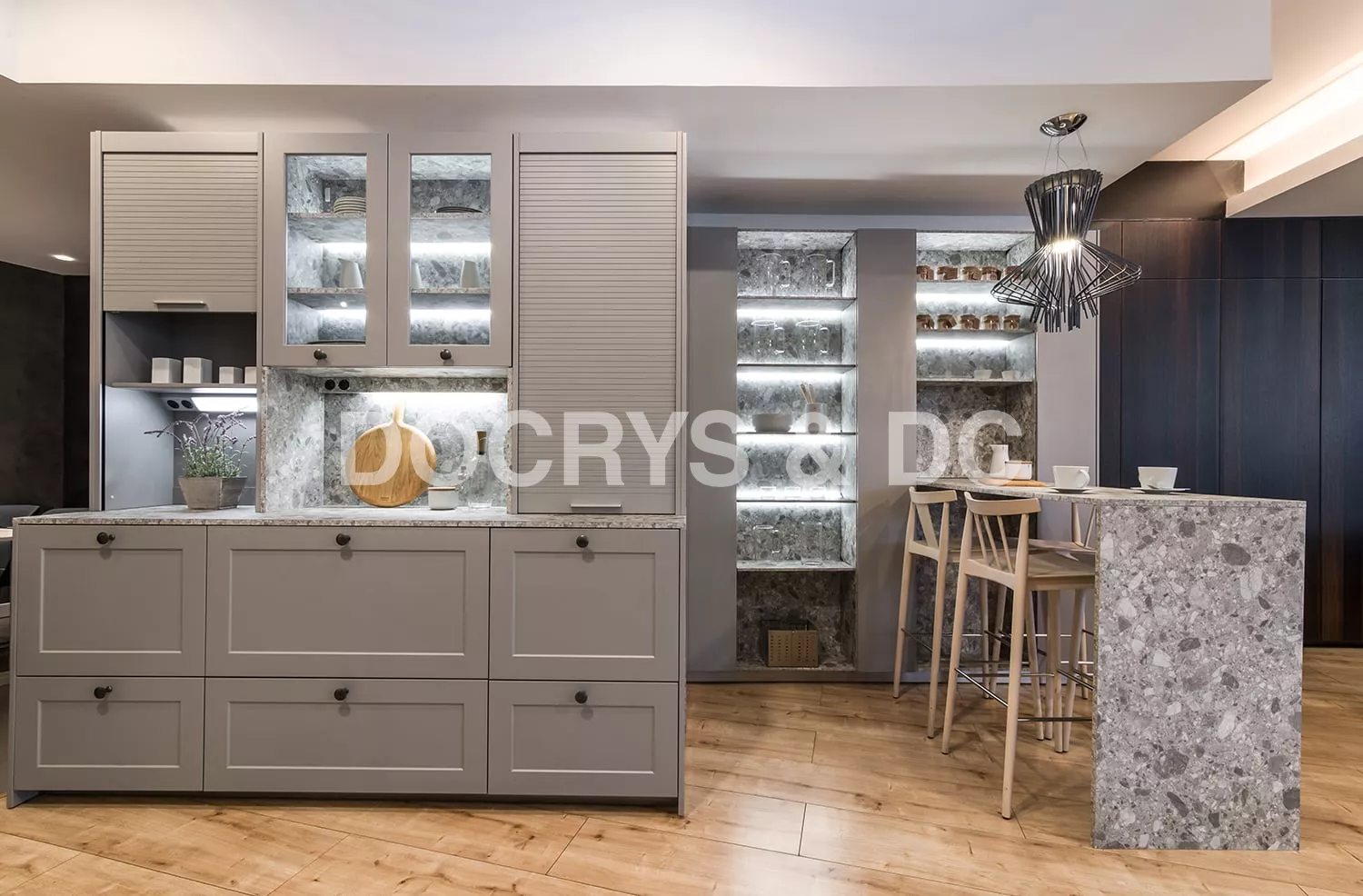 El diseño de esta cocina, está compuesto por un frente con una encimera como zona de trabajo, una vitrina con dos puertas y dos muebles persianeros.Por otro lado, hay una gran estantería retroiluminada de la que sale una barra para cuatro comensales, iluminada con una lámpara de Foscarini.