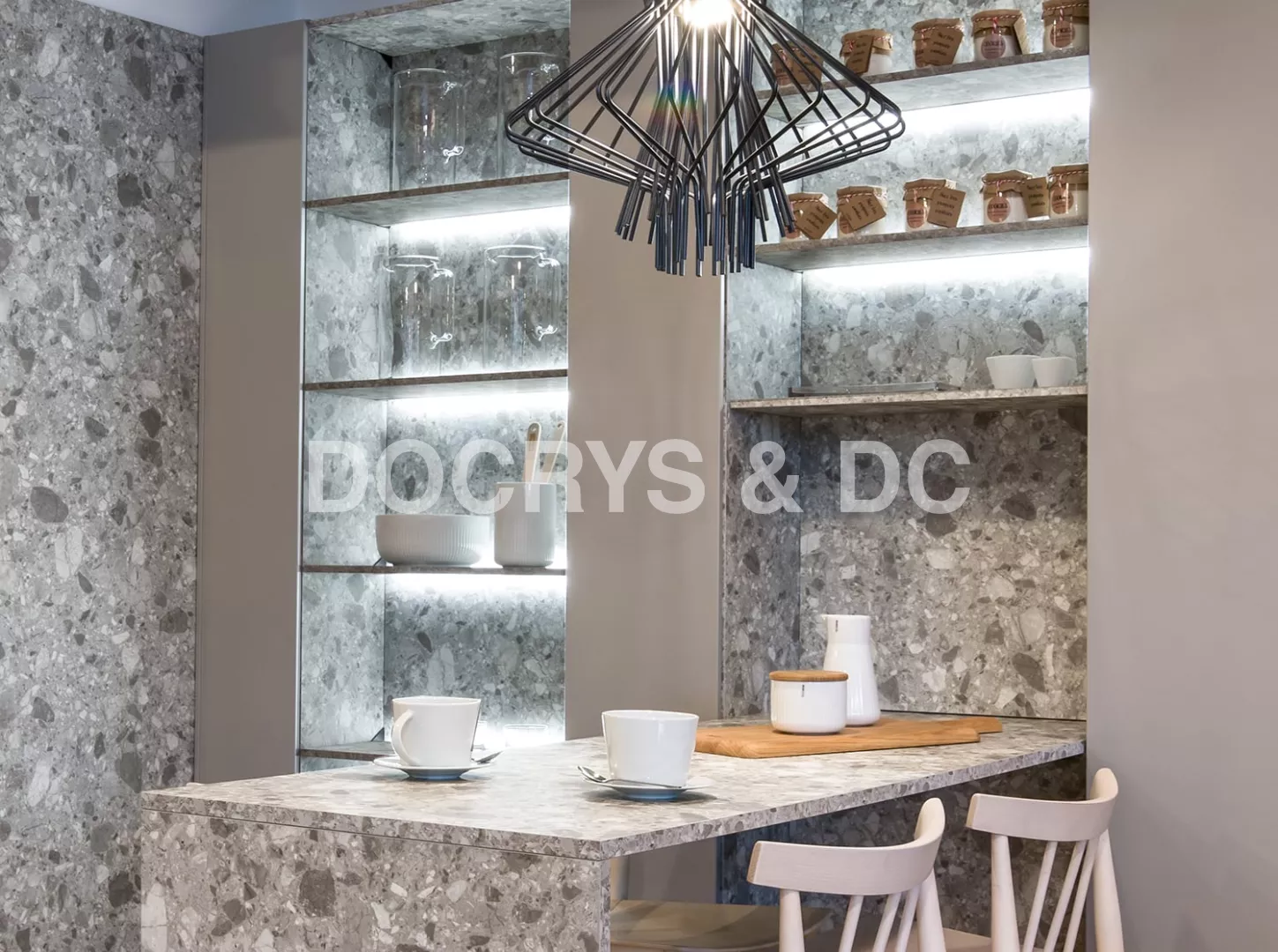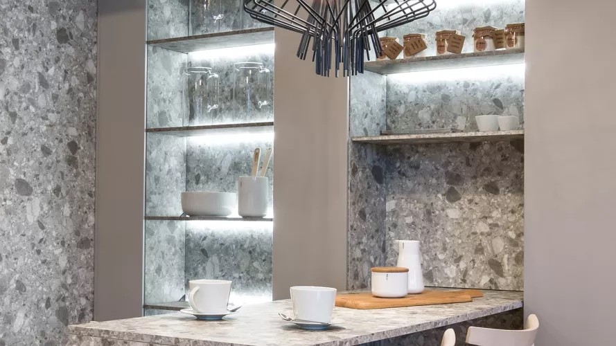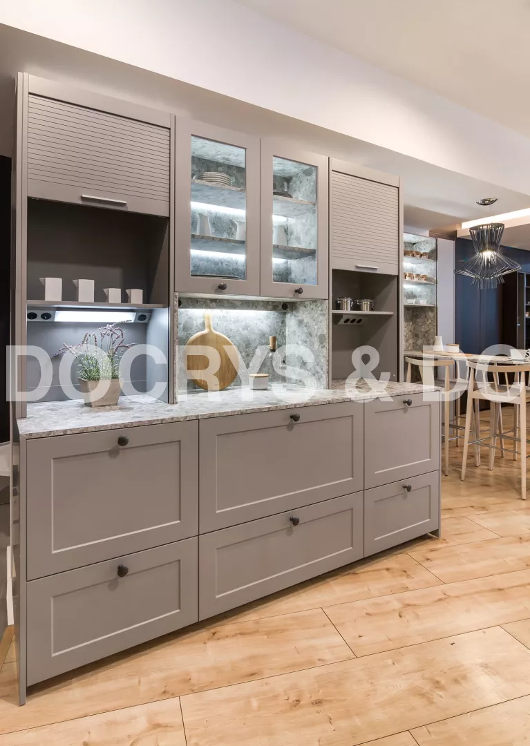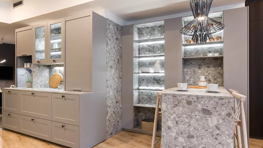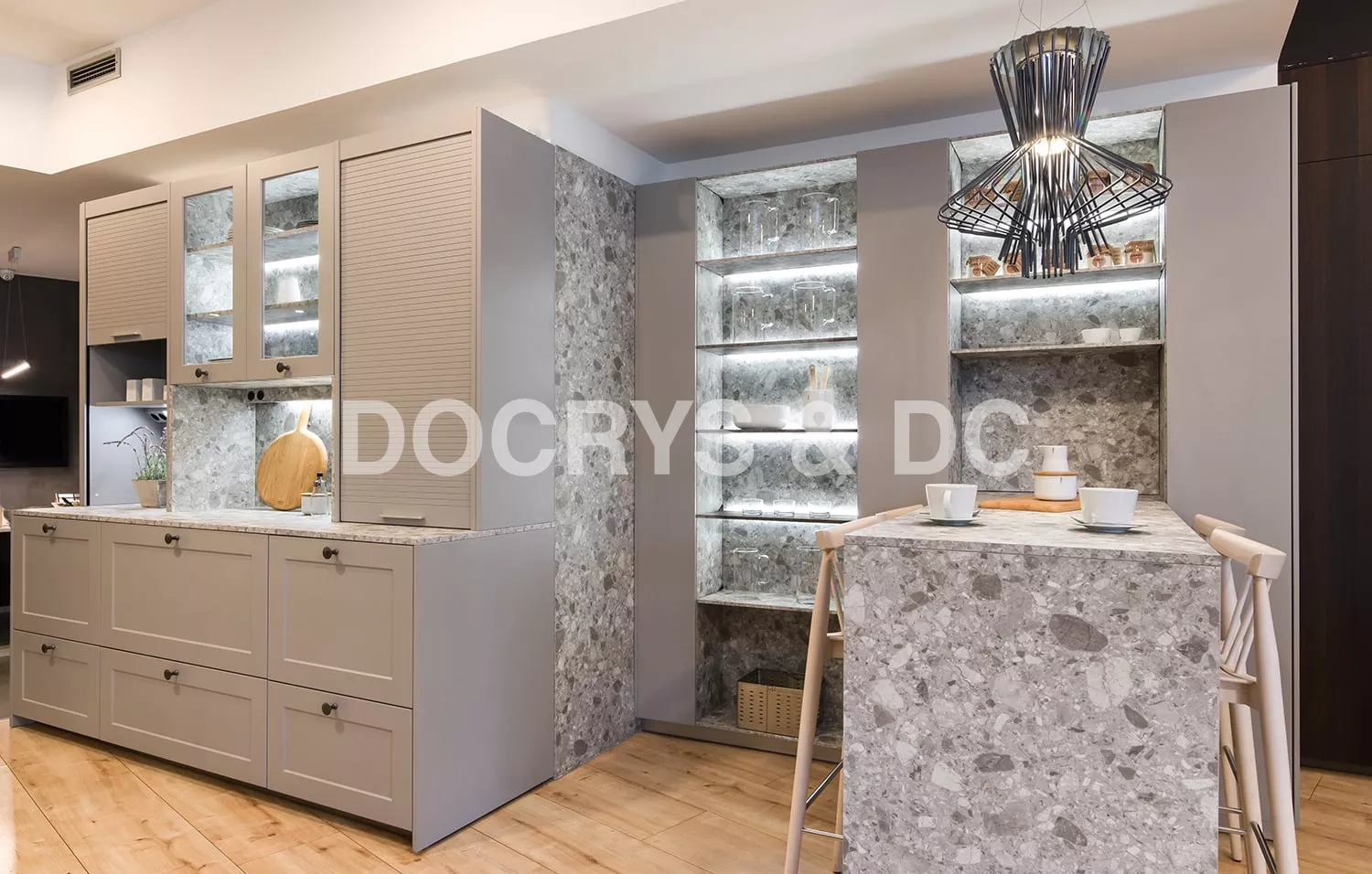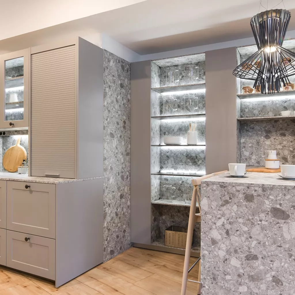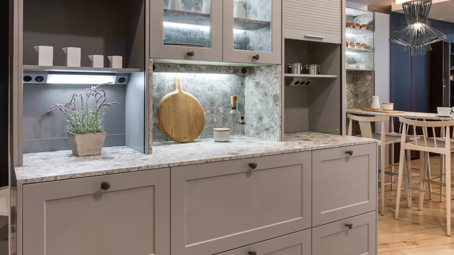 Cocina Santos en color Gris piedra con material lacado y encimera de Santos en color Ceppo de Gré.