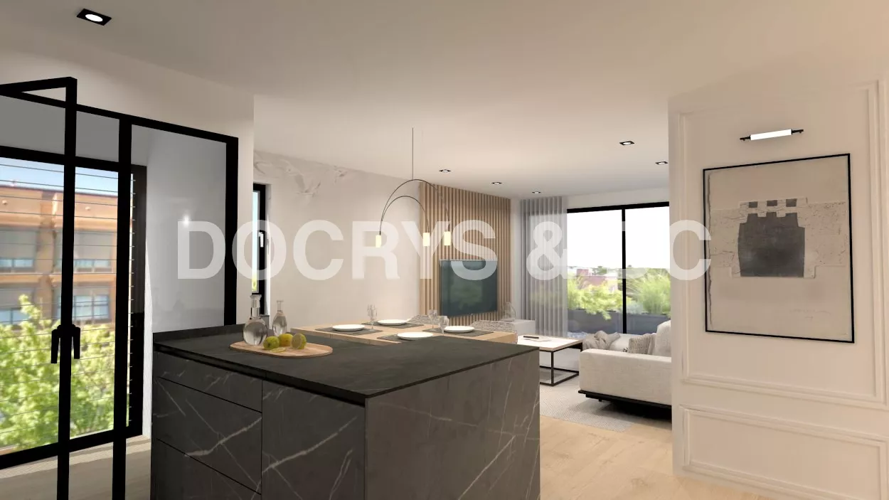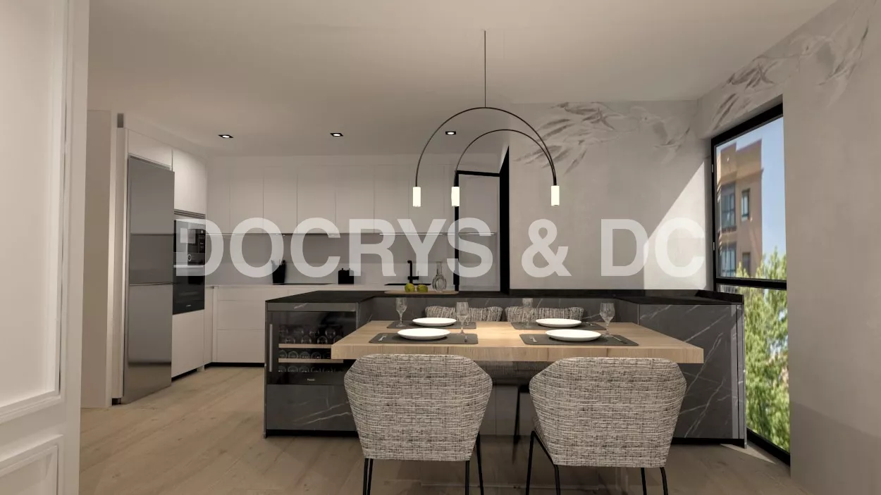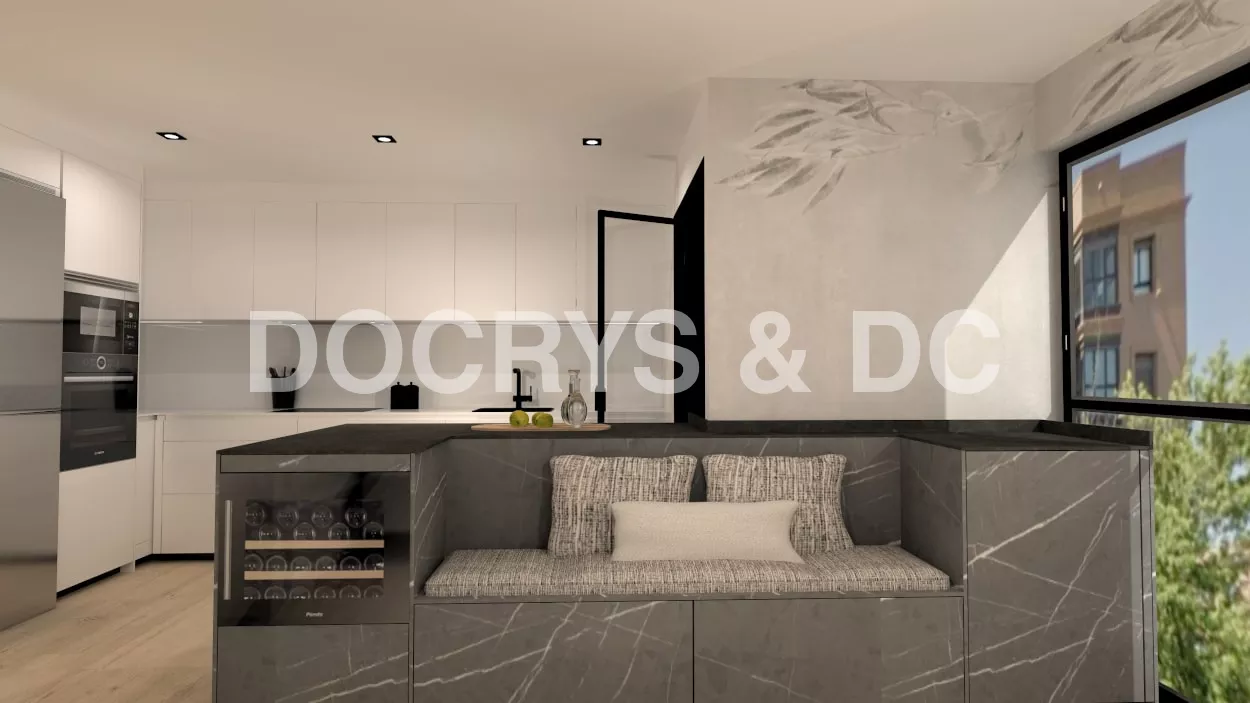 Por otro lado, una isla central polivalente que hace de zona de trabajo, zona de almacenamiento y al mismo tiempo de banco para la mesa de office.