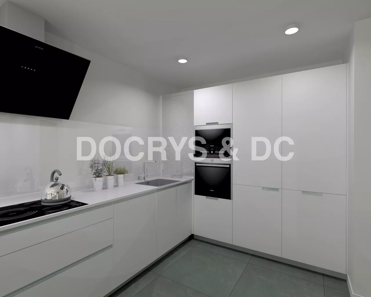 Cocina Santos | Modelo Line L 053 Minos Laminado Blanco Nieve | Encimera Silestone Blanco Zeus y Trasera Cristal Extra Claro