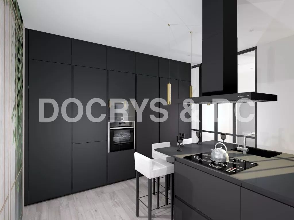 Cocina Santos en color negro, con una península y un gran frente con columnas.