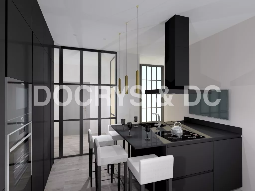 Esta cocina, cuenta con unas grandes vidrieras que dejan entrar luz natural.