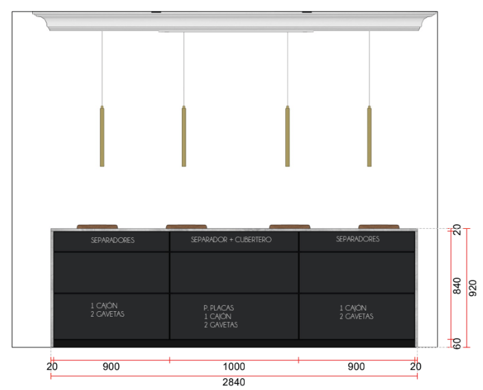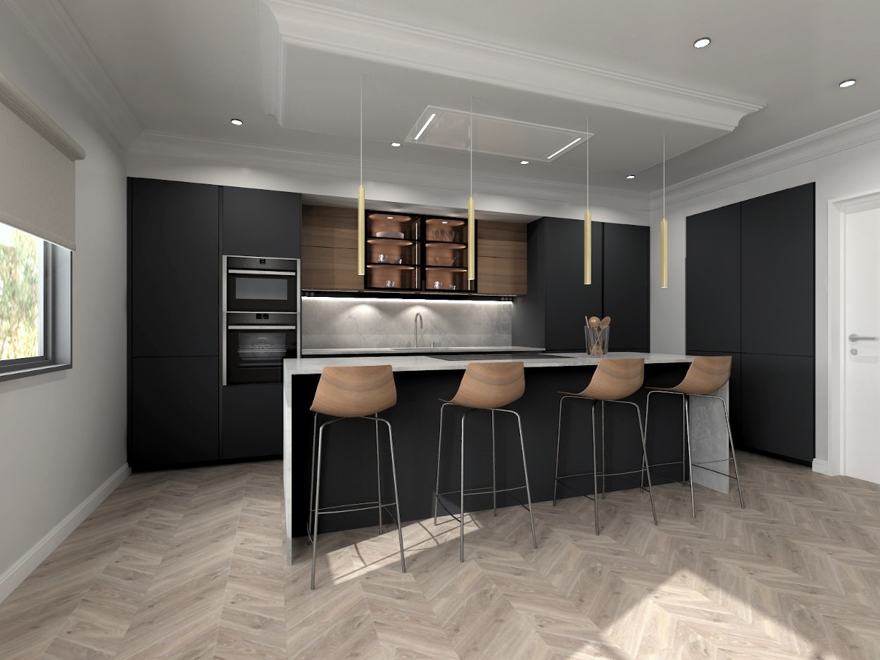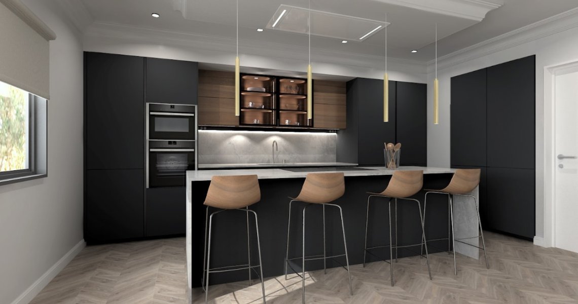 El mobiliario de líneas modernas y sencillas, en color negro y nogal, se integran a la perfección en el espacio y su distribución junto con la isla central, crea un espacio cómodo y acogedor.