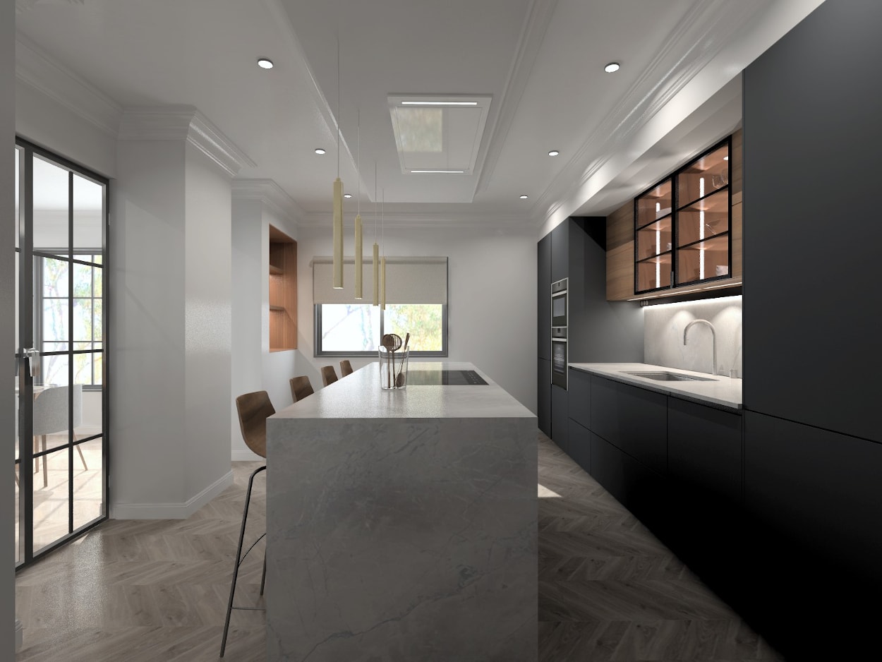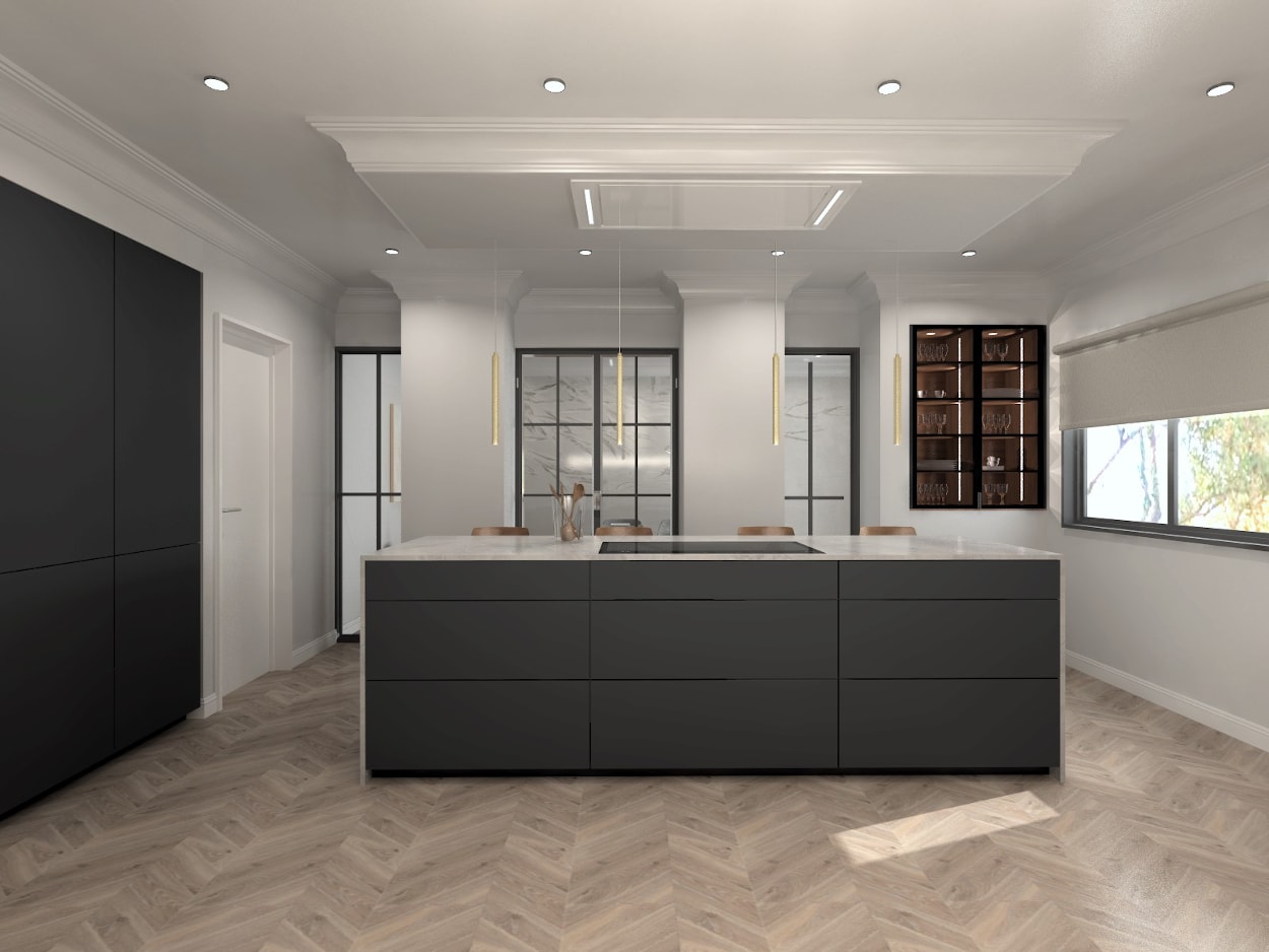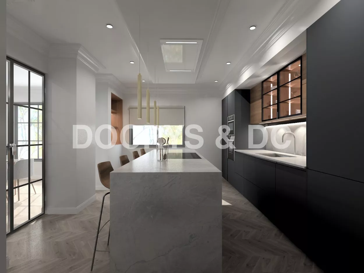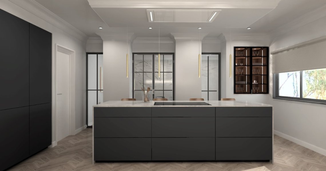 Esta cocina también cuenta con unas puertas correderas de cristal y aluminio negro, teniendo la opción de mantener la cocina abierta o cerrada según la ocasión.