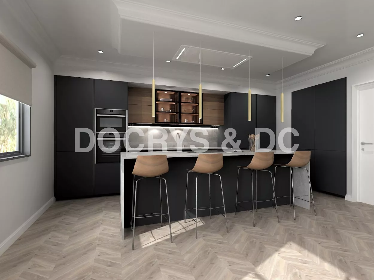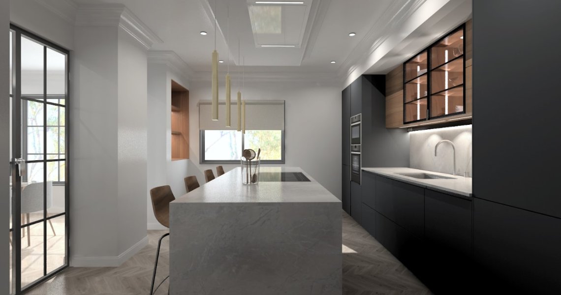 Esta cocina abierta semi abierta al salón, forma parte del centro de la vivienda, sofisticada, elegante y luminosa.