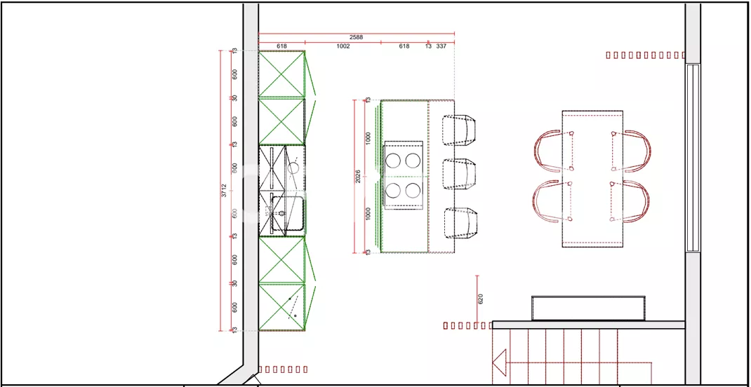 El frente está compuesto por muebles altos, muebles bajos y varias columnas, esta zona acoge la zona de aguas y los grandes electrodomésticos.