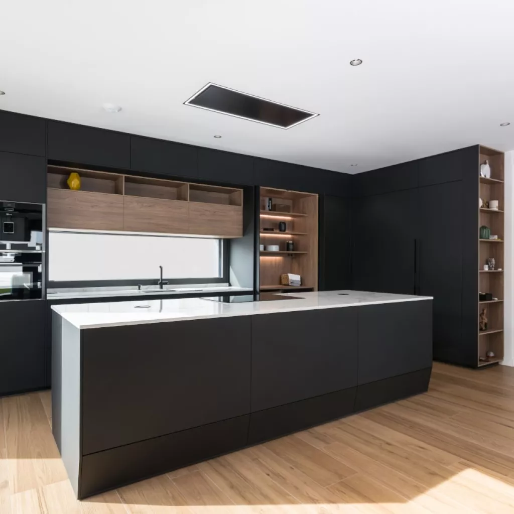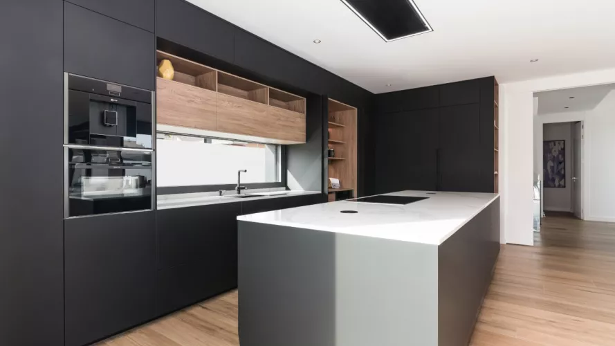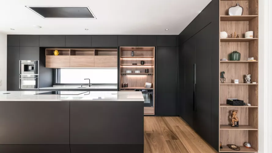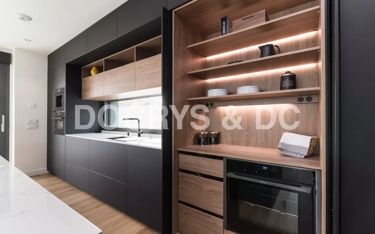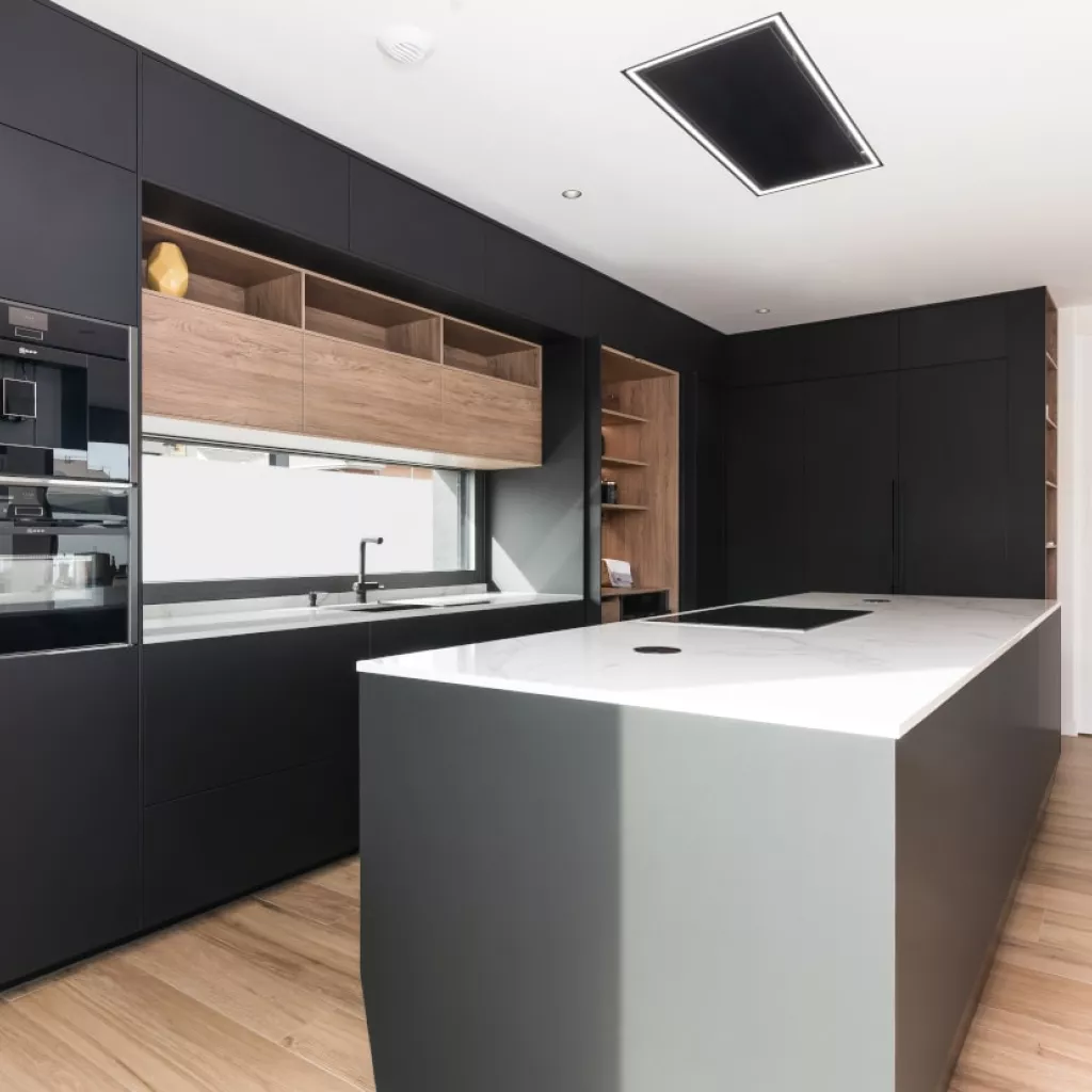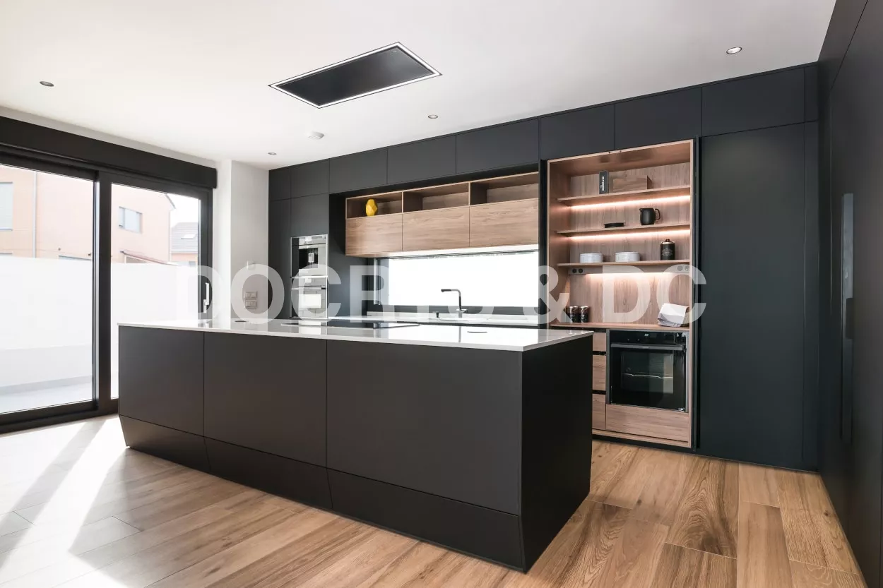 Cocina Santos en negro seda anti huellas y roble kairos con material laminado seda antihuellas y encimera de Sapienstone, color Calacatta, acabado pulido.