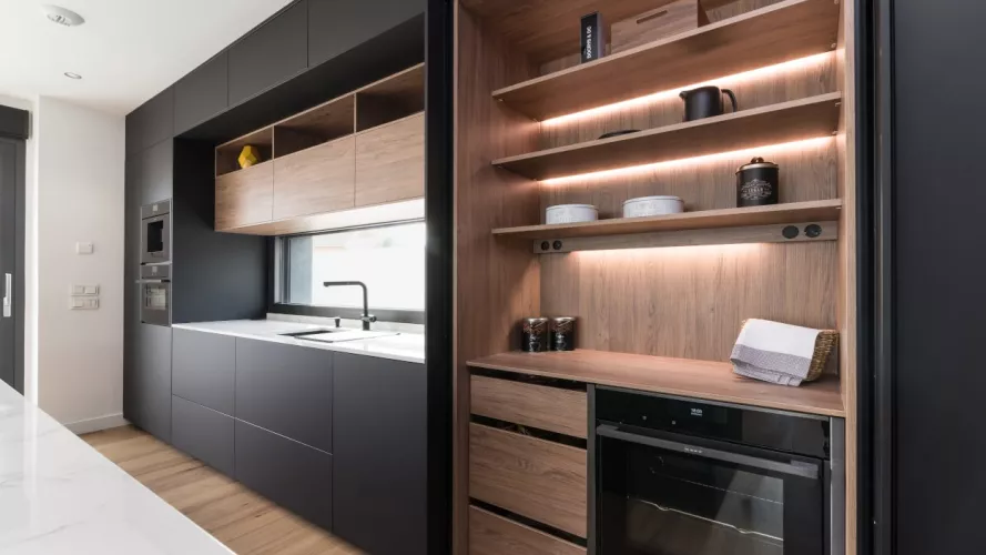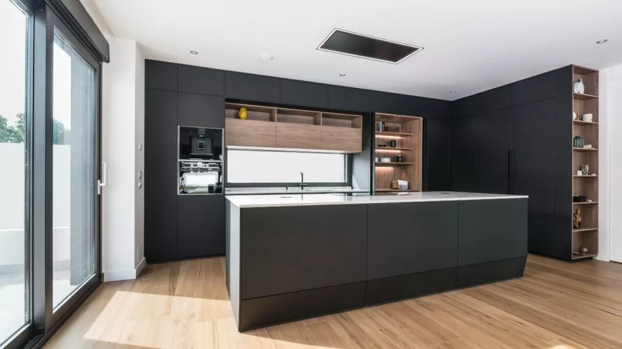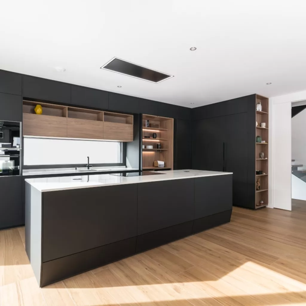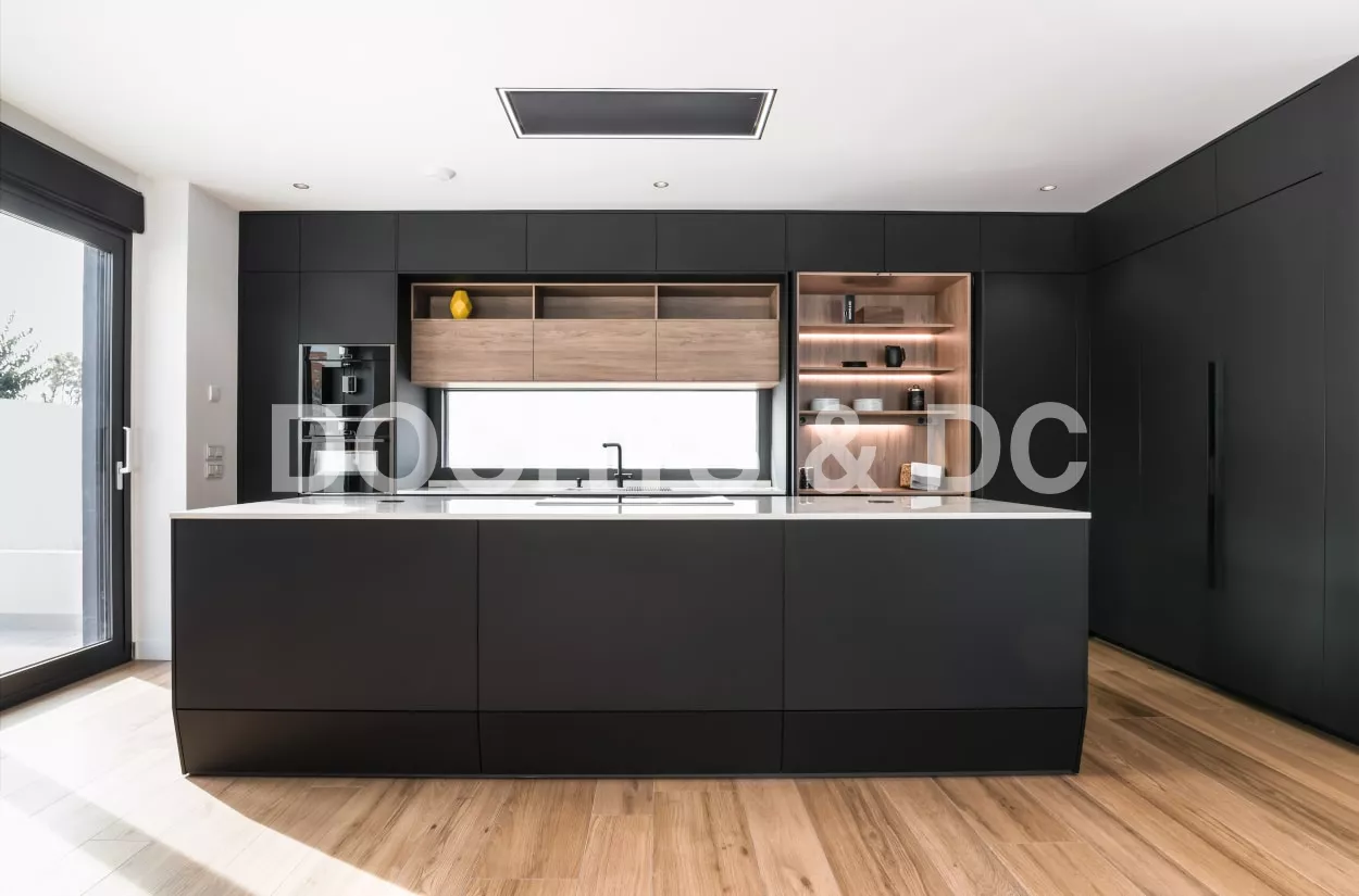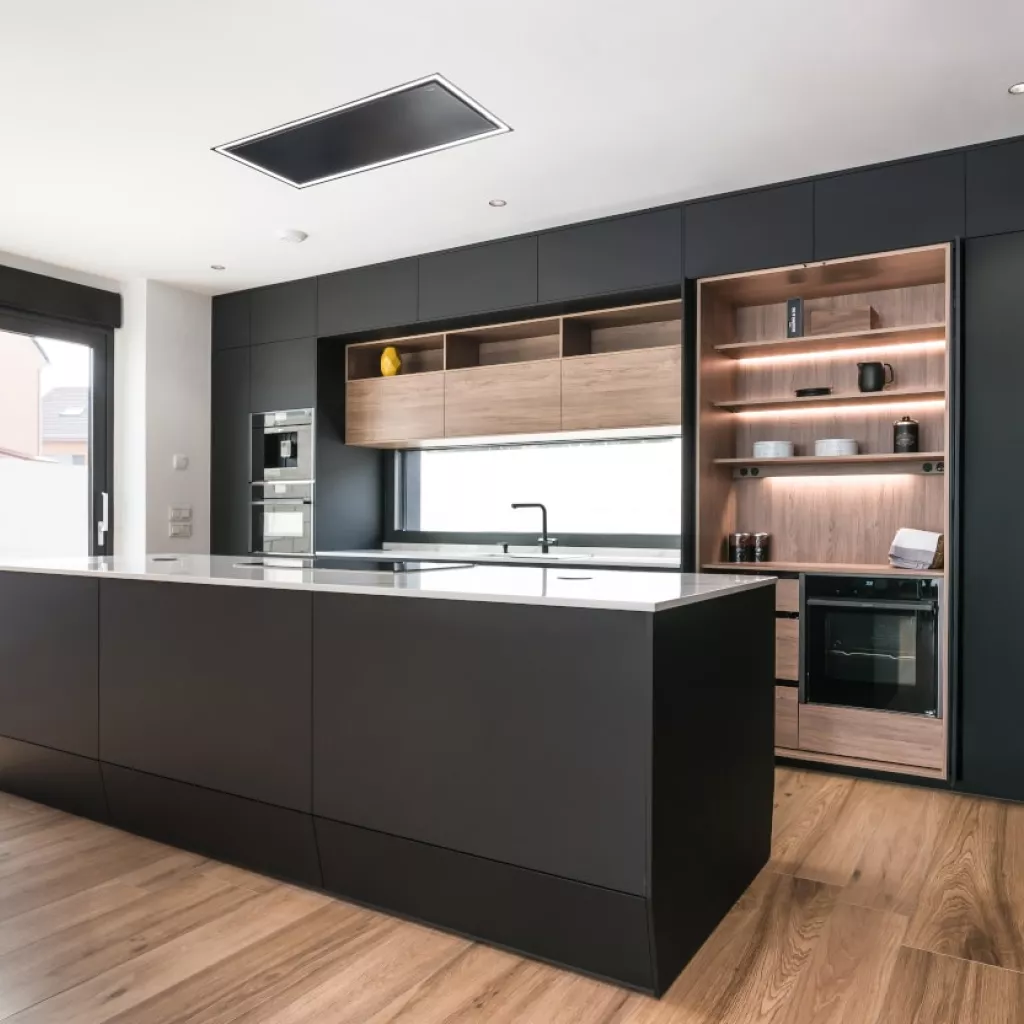 Cocina Santos en negro seda anti huellas y roble kairos con material laminado seda antihuellas y encimera de Sapienstone, color Calacatta, acabado pulido.