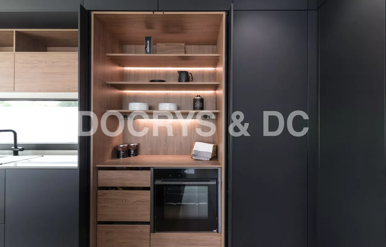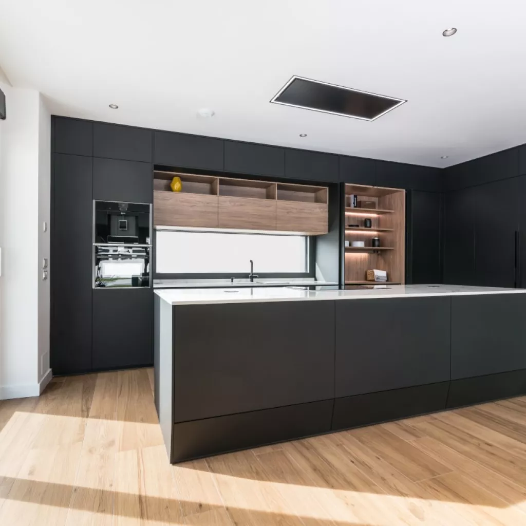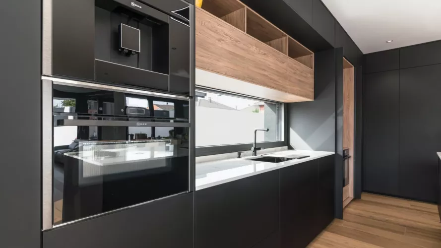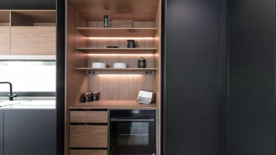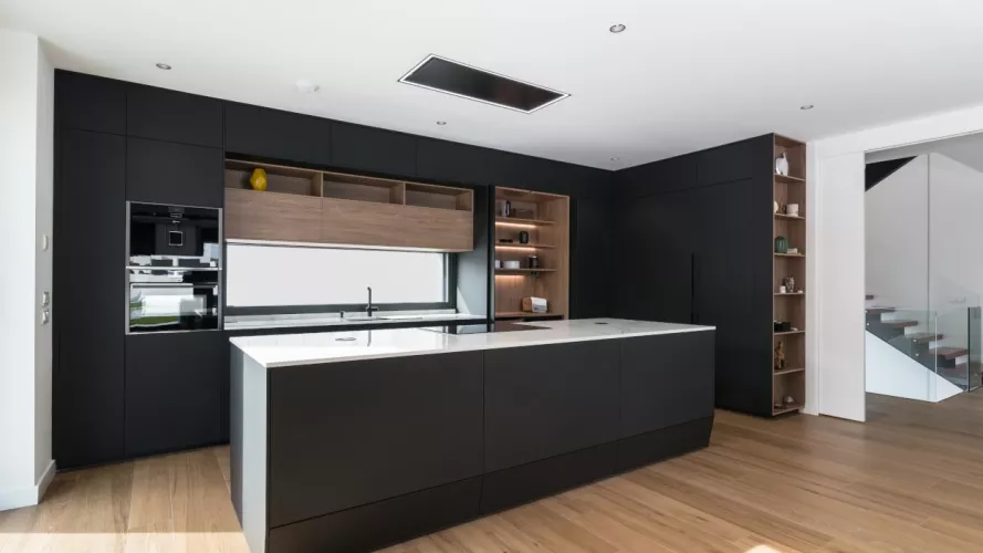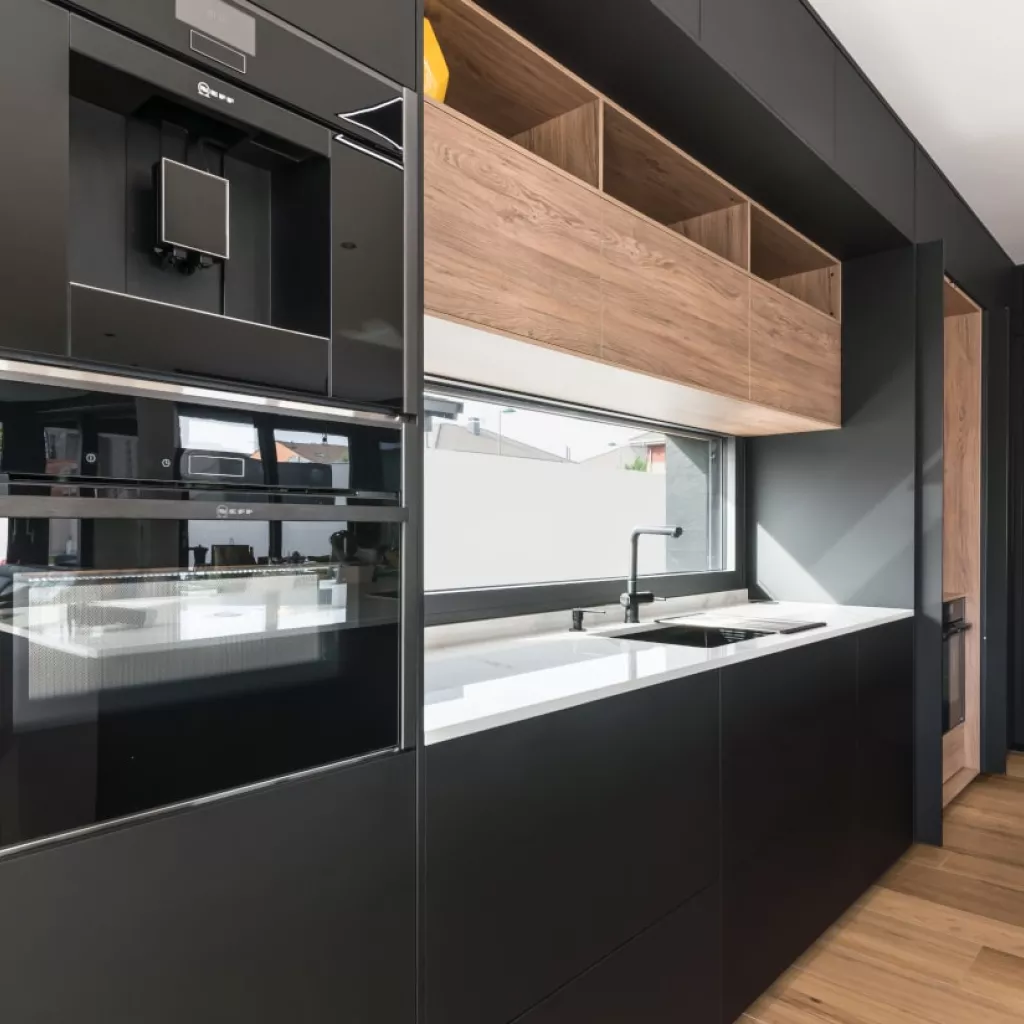 Cocina Santos en negro seda anti huellas y roble kairos con material laminado seda antihuellas y encimera de Sapienstone, color Calacatta, acabado pulido.
