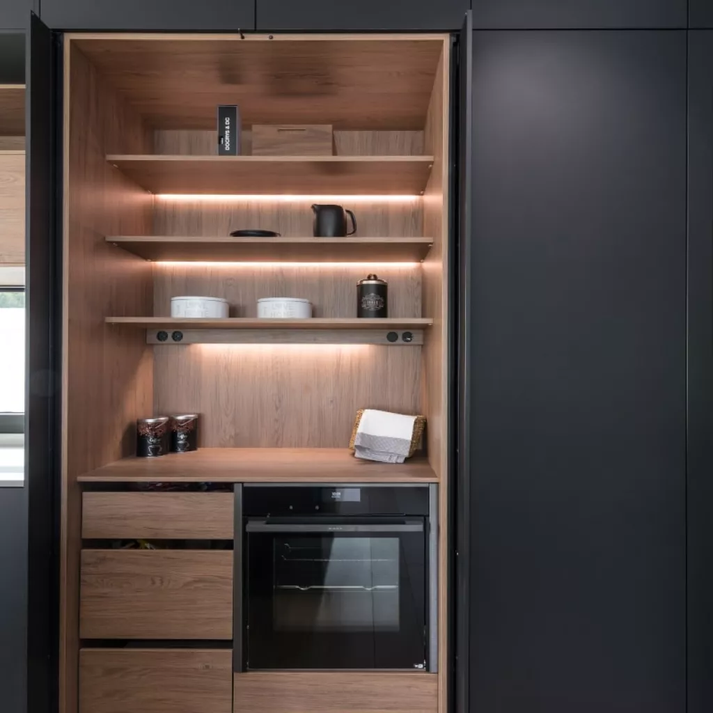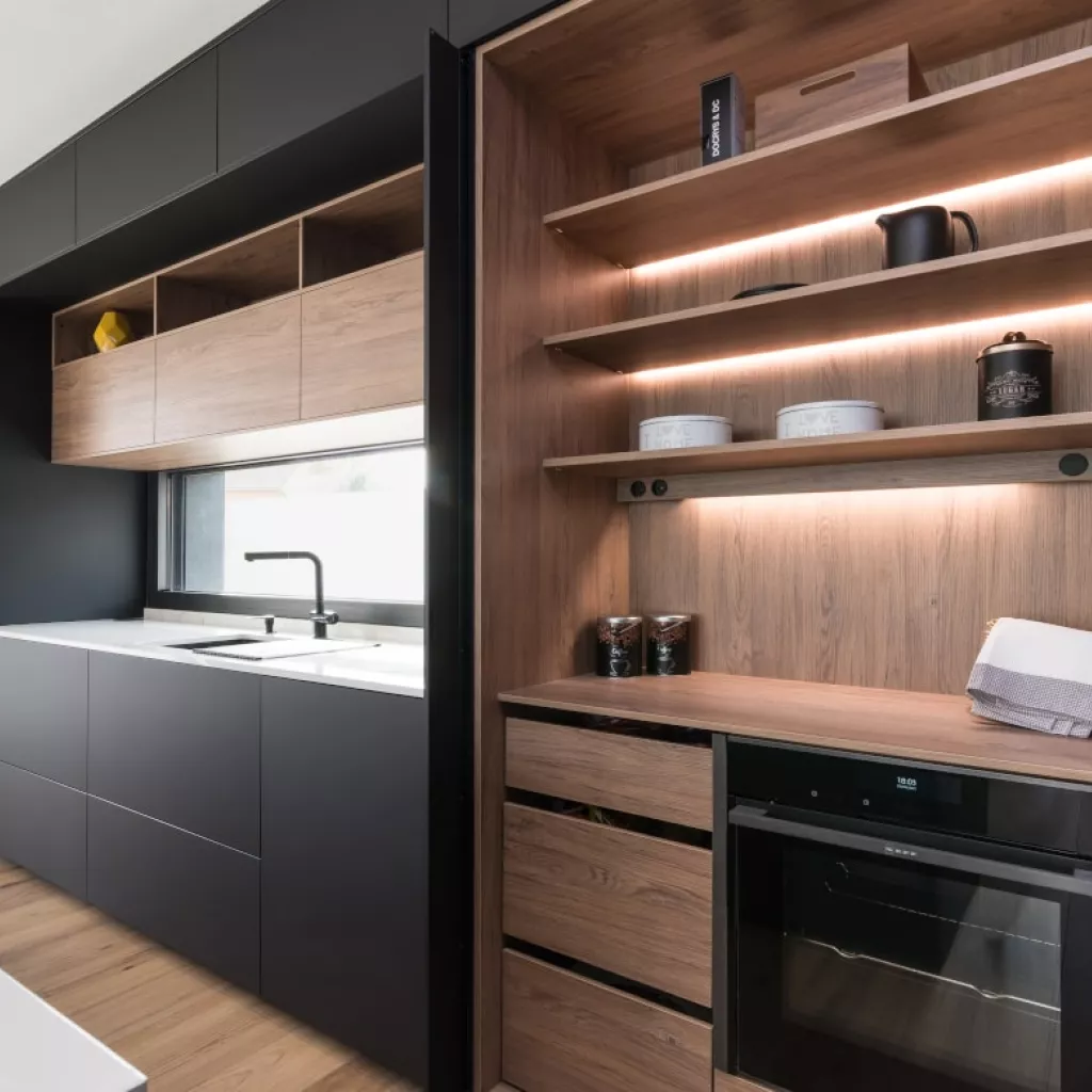 En este frente, se han combinado dos colores, el negro seda y el roble kairos, obteniendo como resultado un diseño elegante y sofisticado.