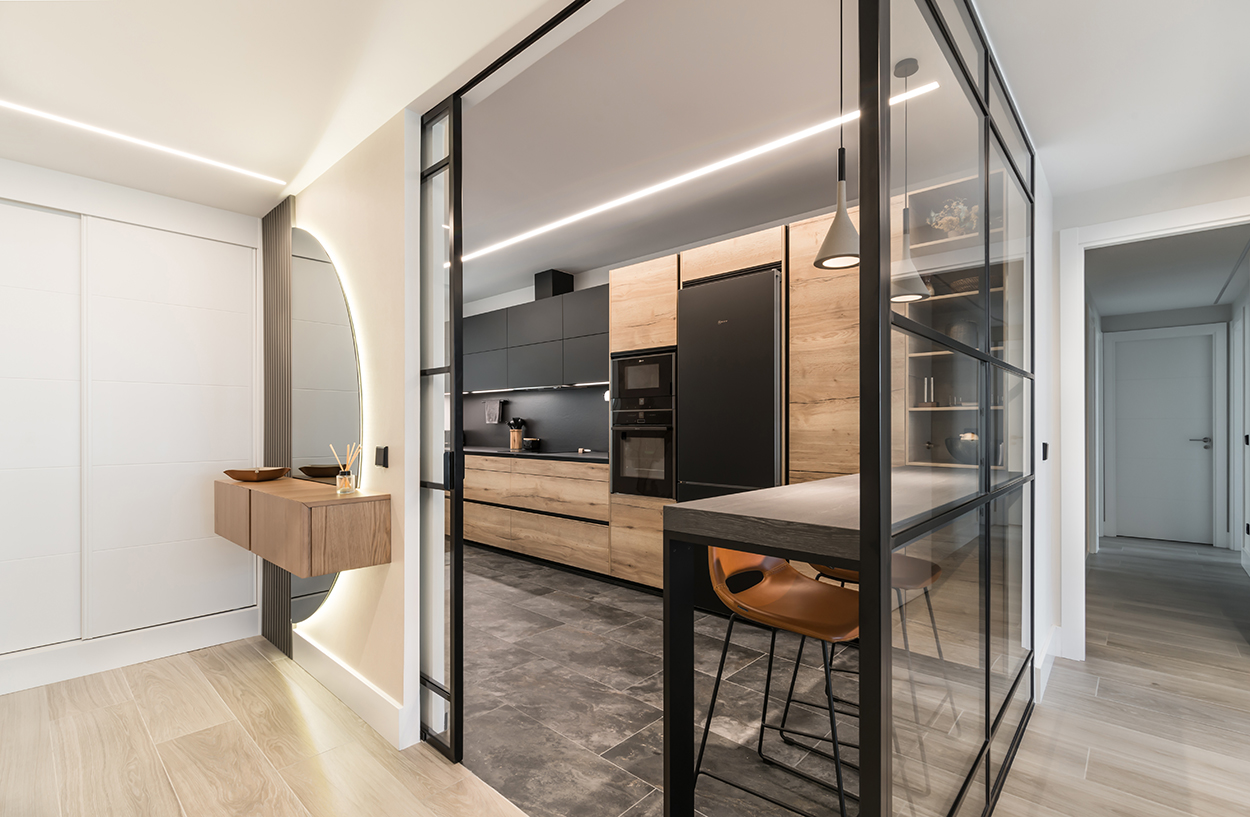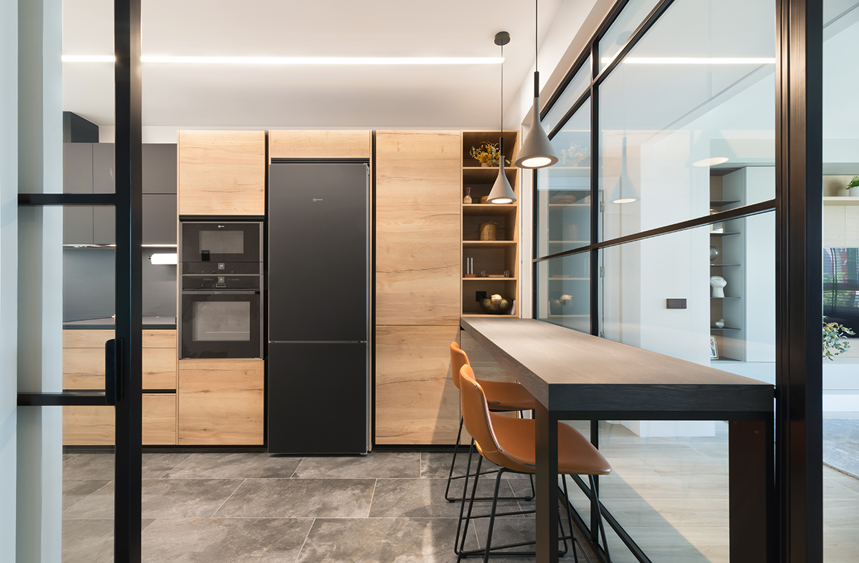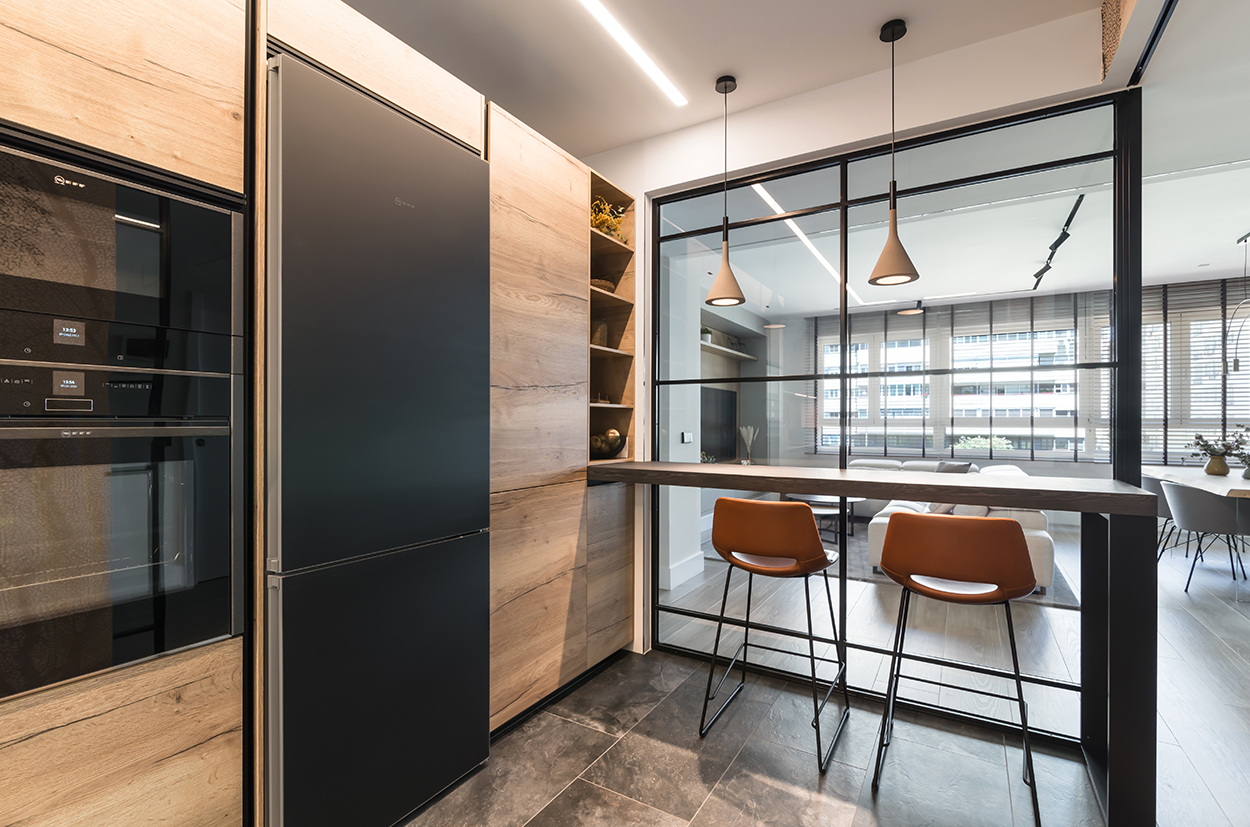 Cocina Santos Negra y Madera Semiabierta al Salón