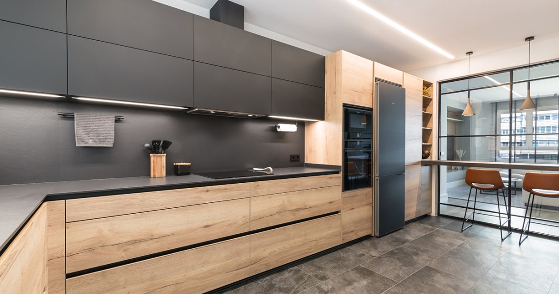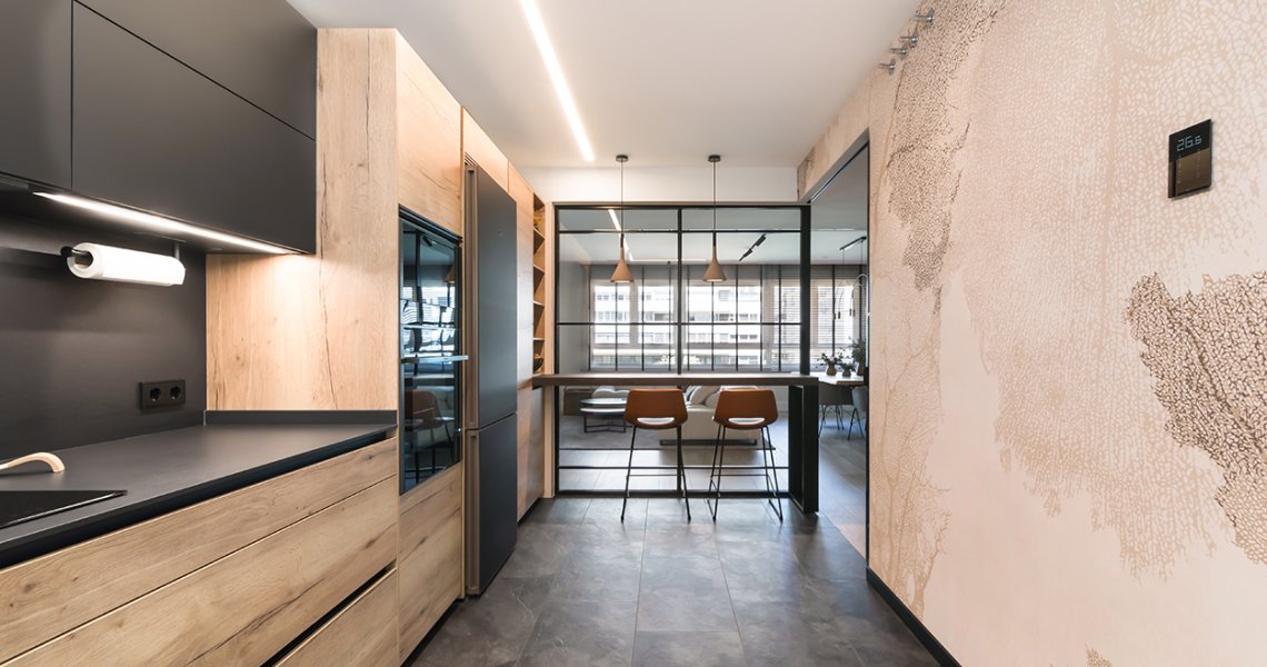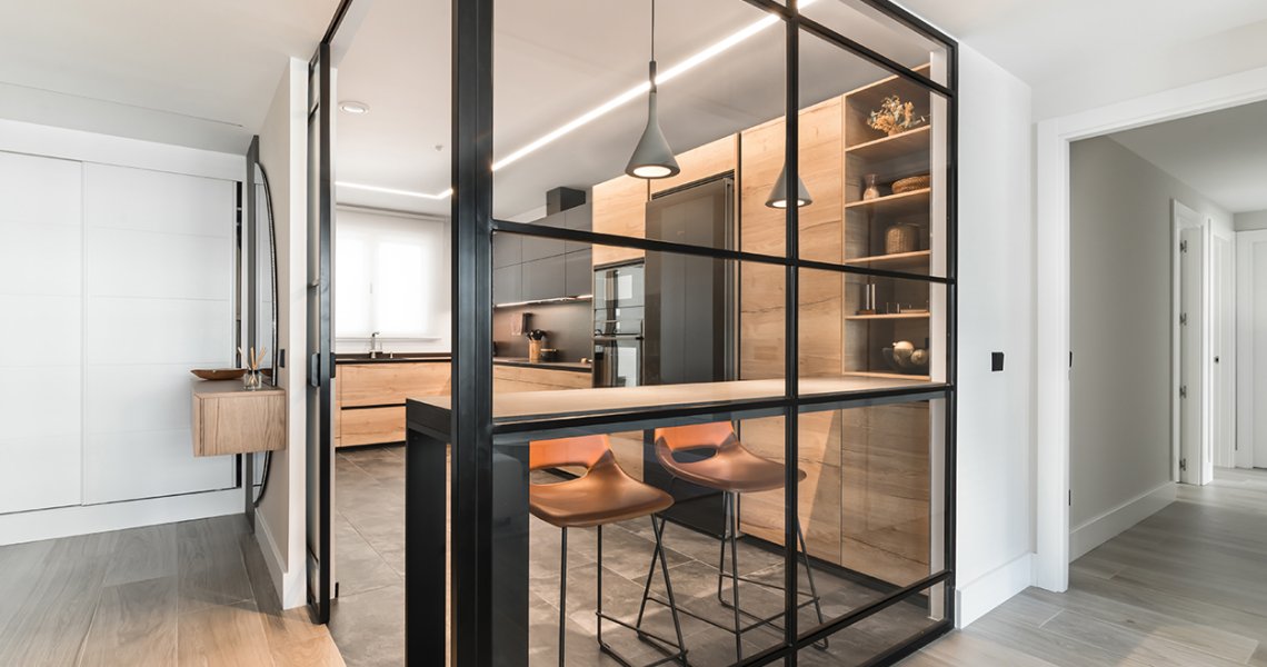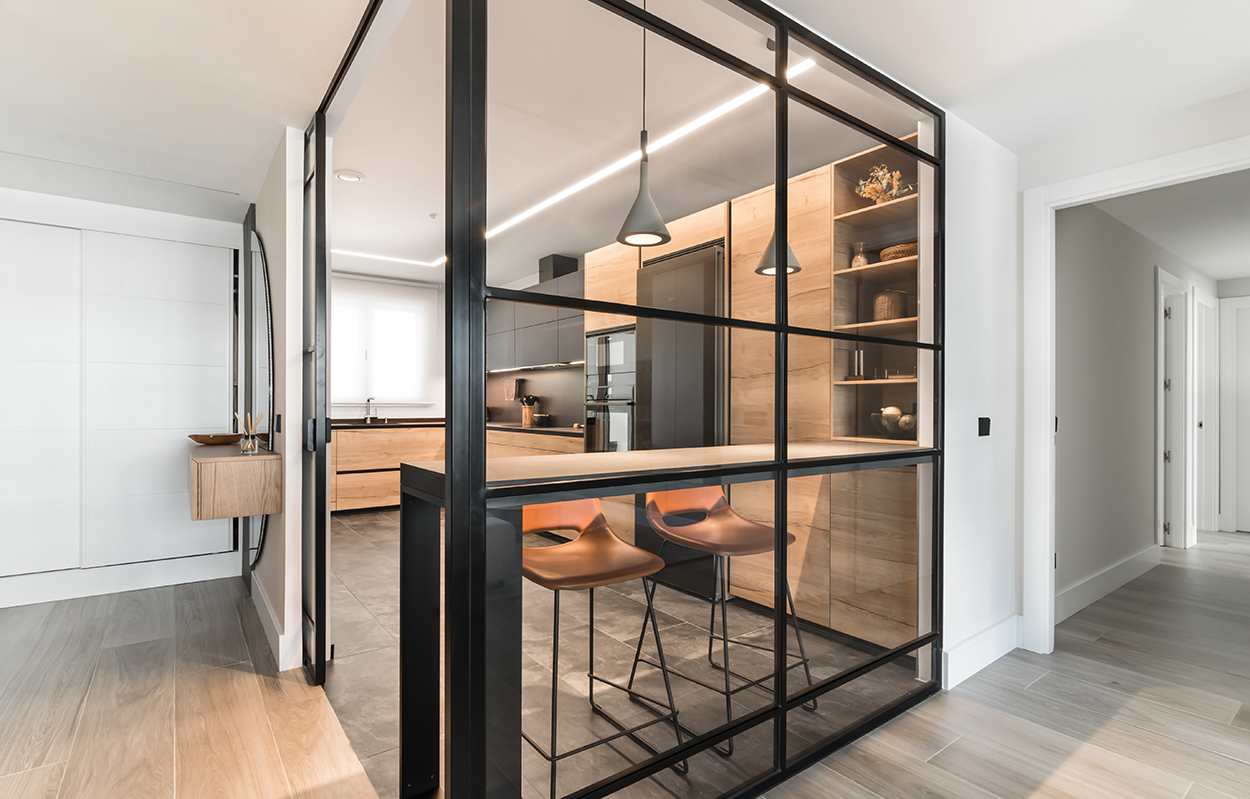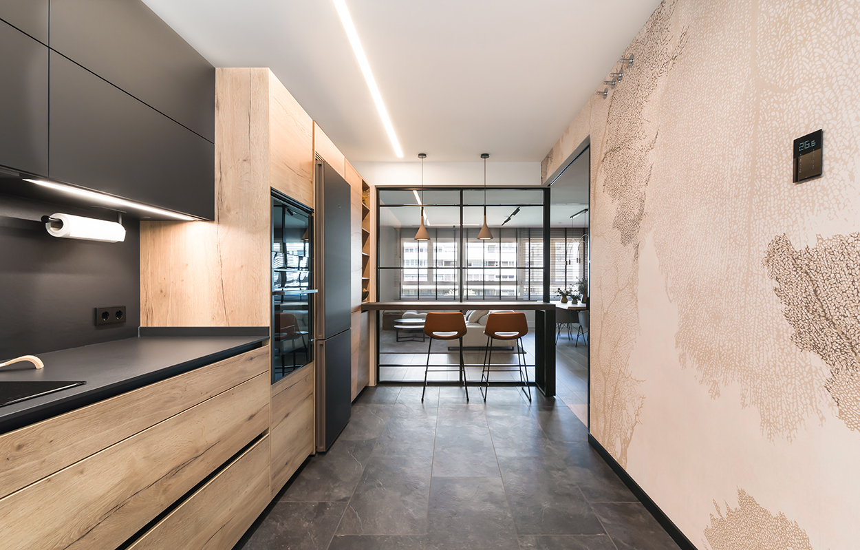 Cocina Santos Negra y Madera Semiabierta al Salón