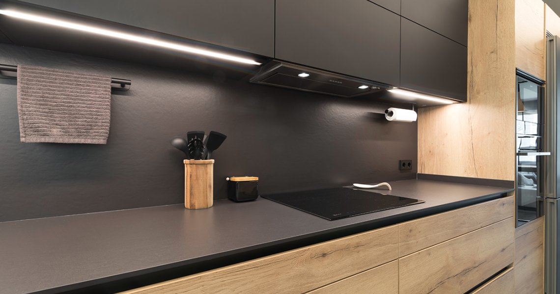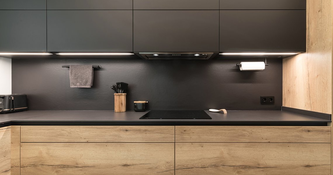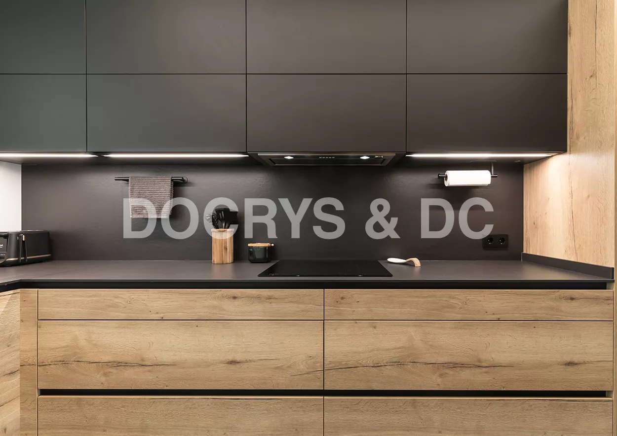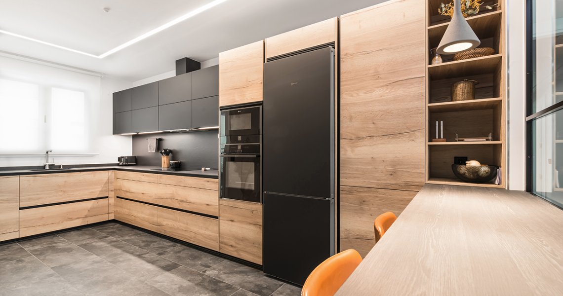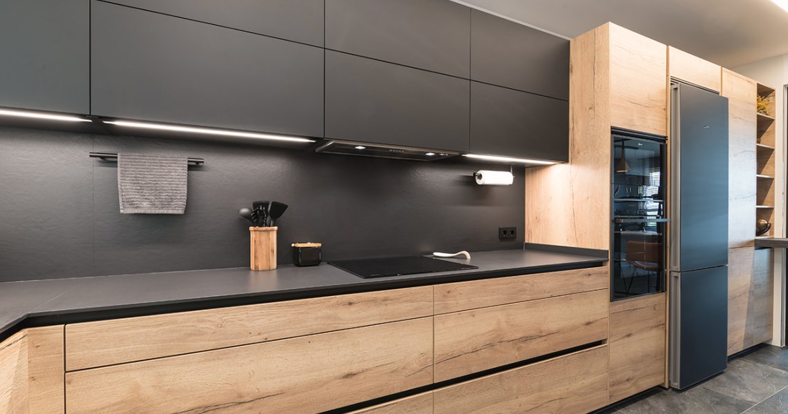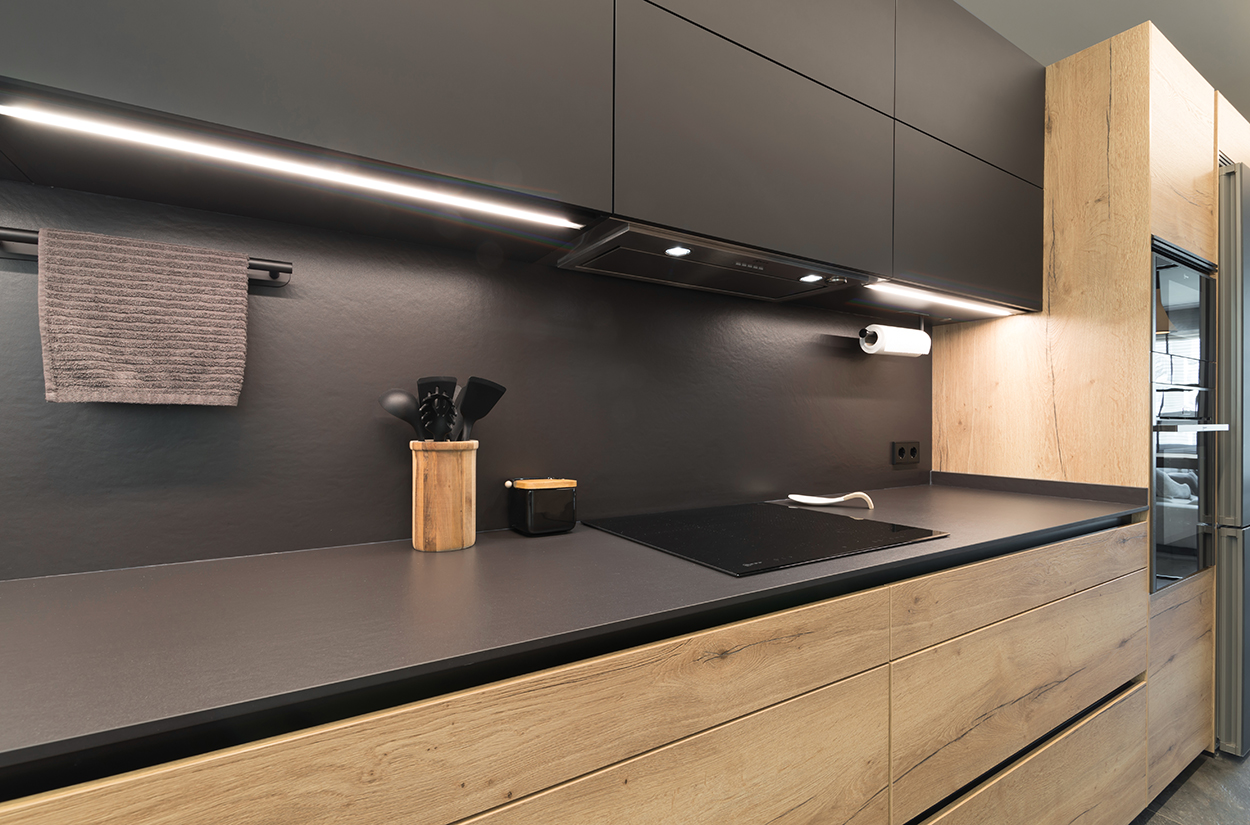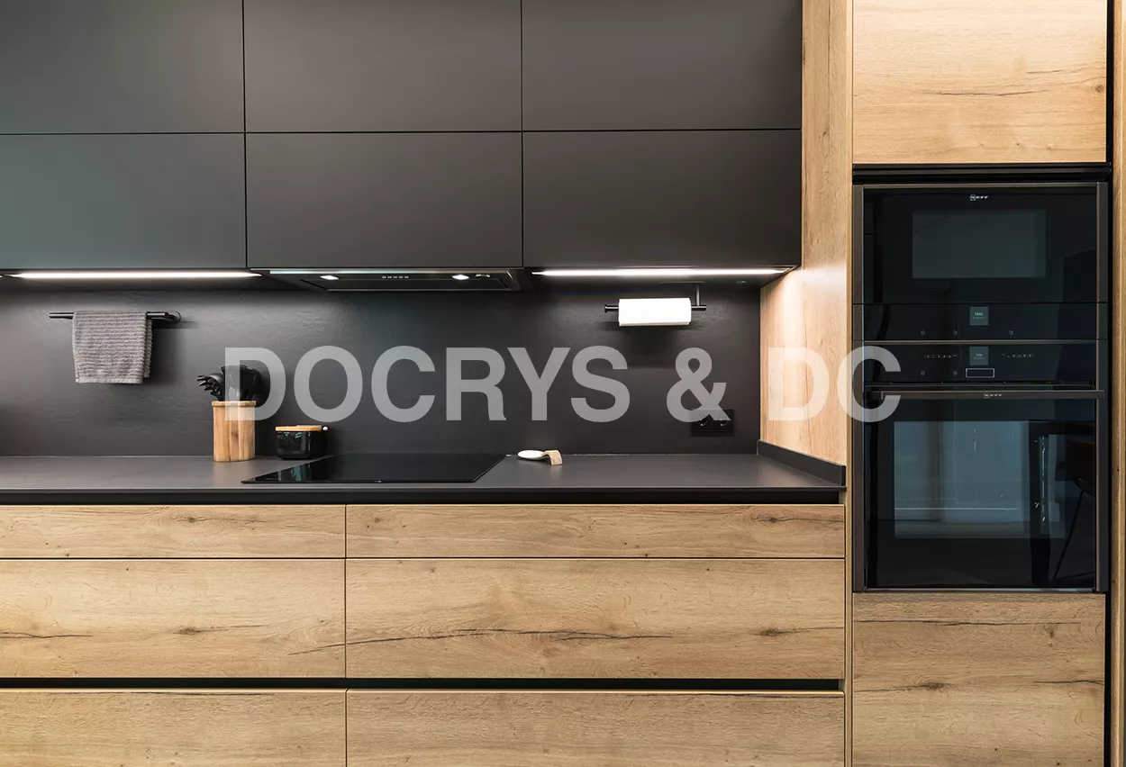 Cocinas Santos color roble rustico sincro y negro seda con material estratificado, modelo fine, plataforma A, D y E.