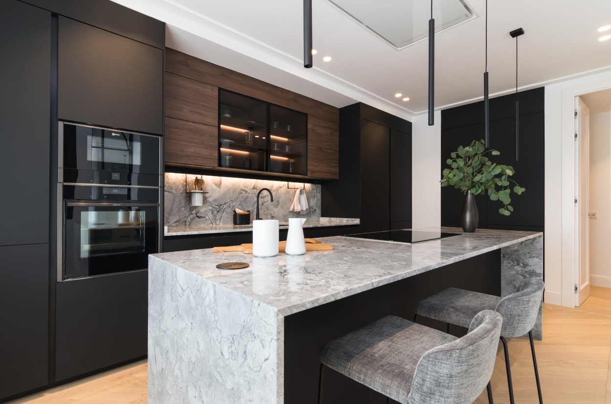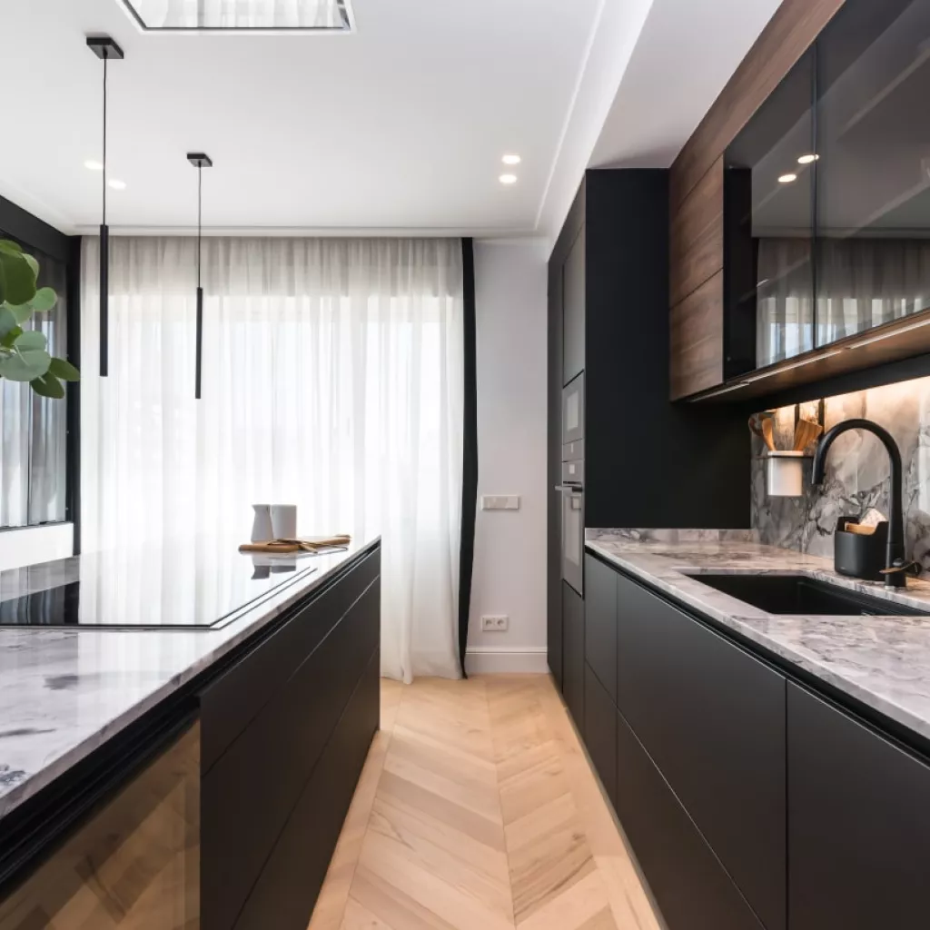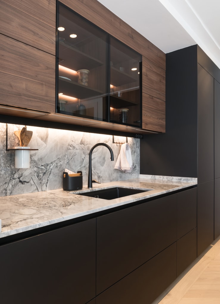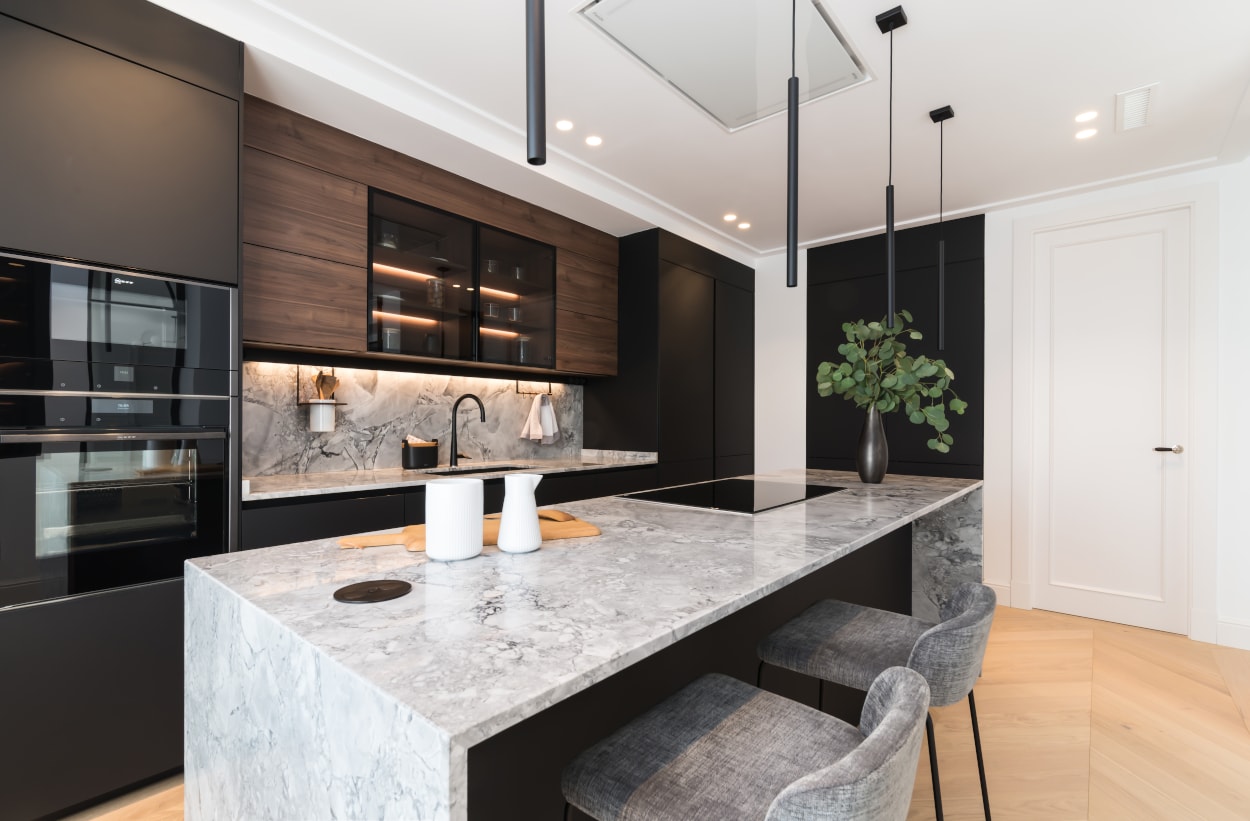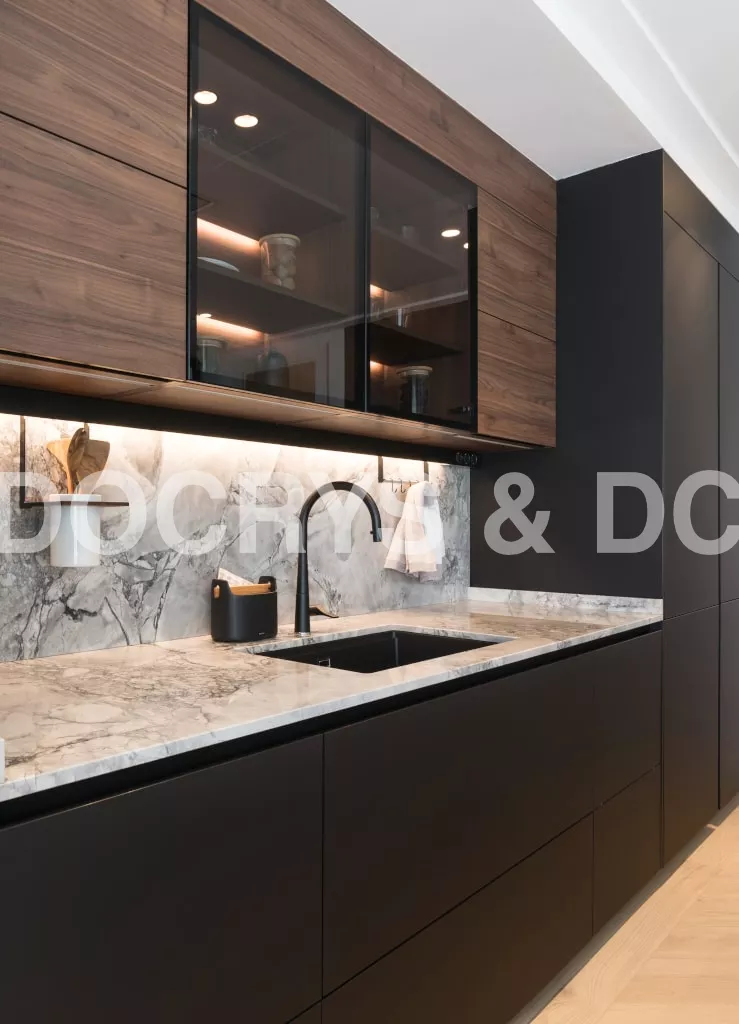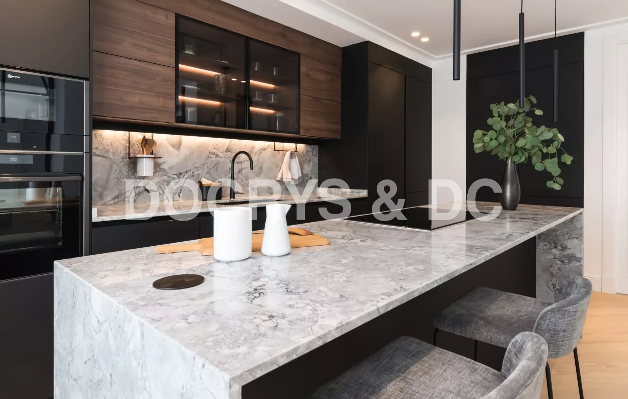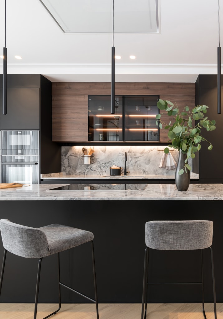 El diseño de esta cocina en color negro seda y nogal tierra, se fusiona con decoración de la vivienda, creando un ambiente conectado muy elegante.