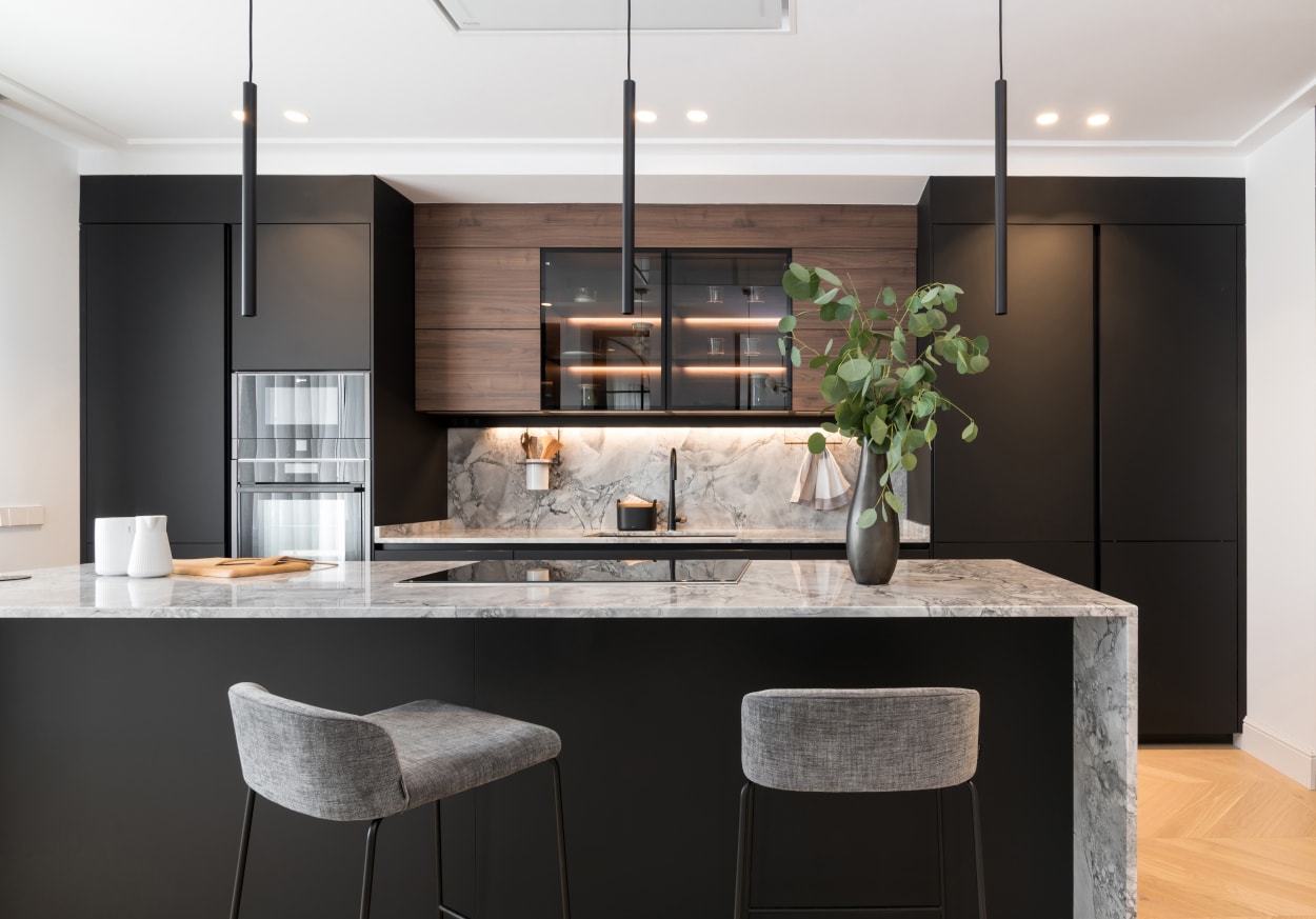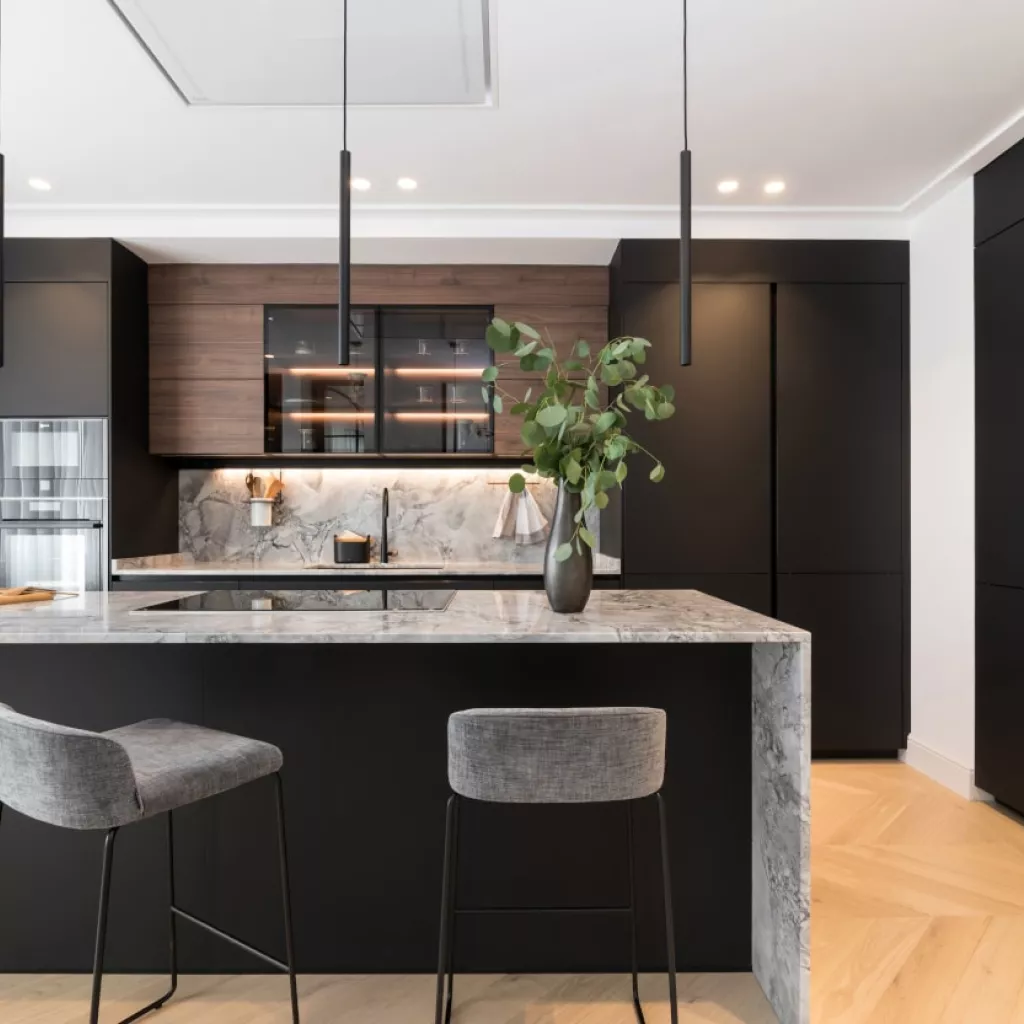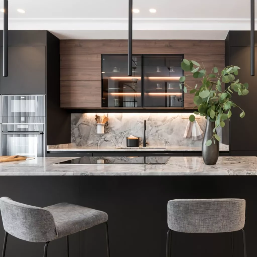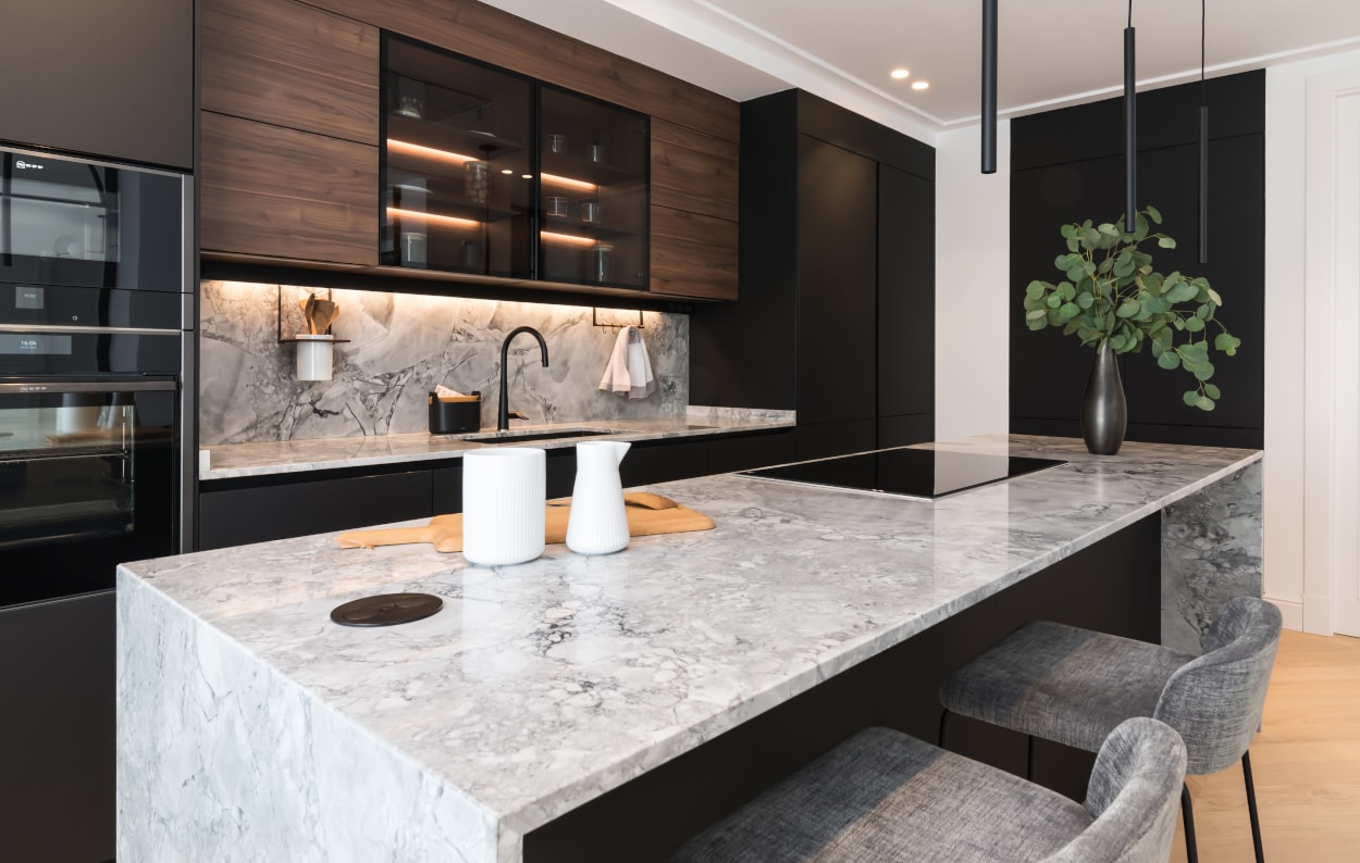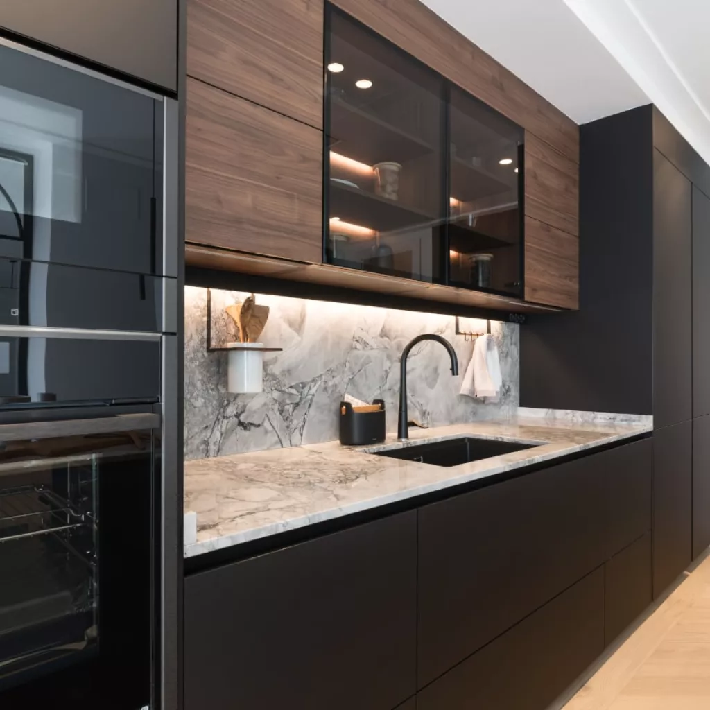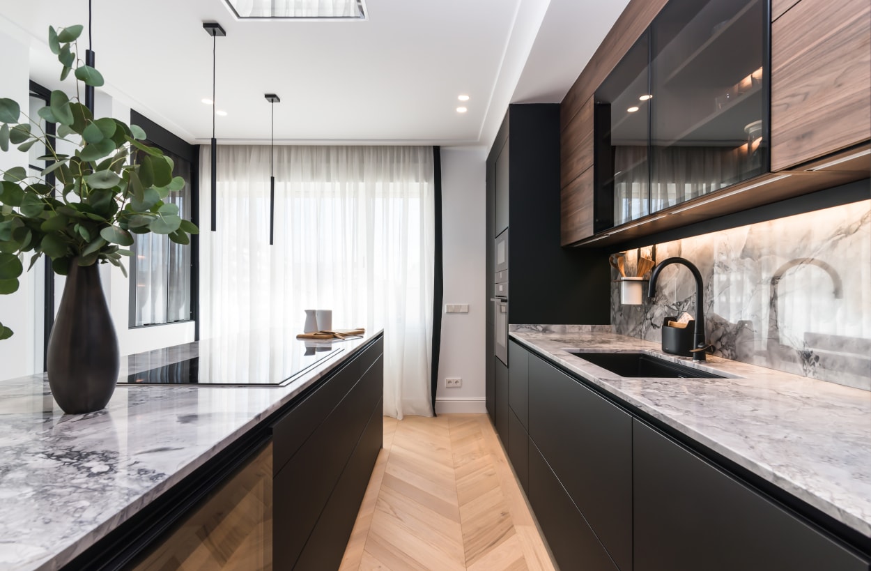 El diseño de esta cocina en color negro seda y nogal tierra, se fusiona con decoración de la vivienda, creando un ambiente conectado muy elegante.
