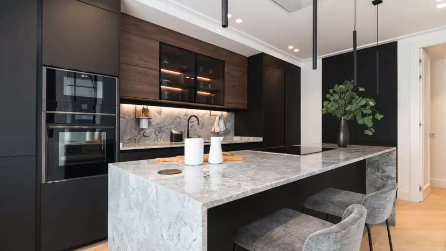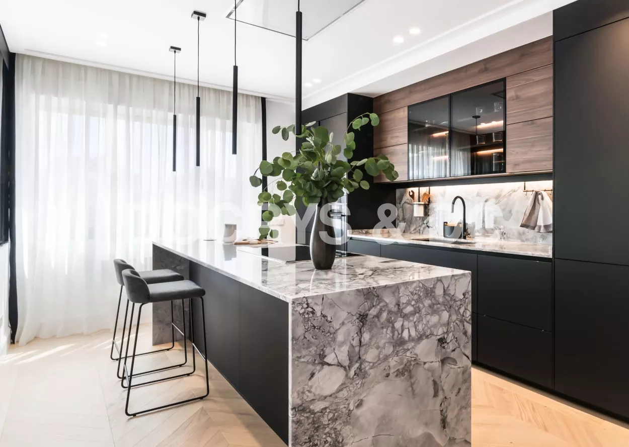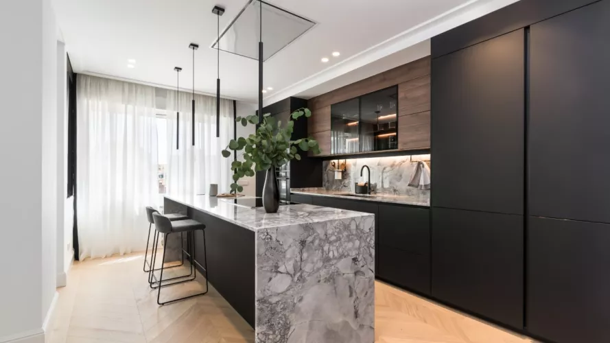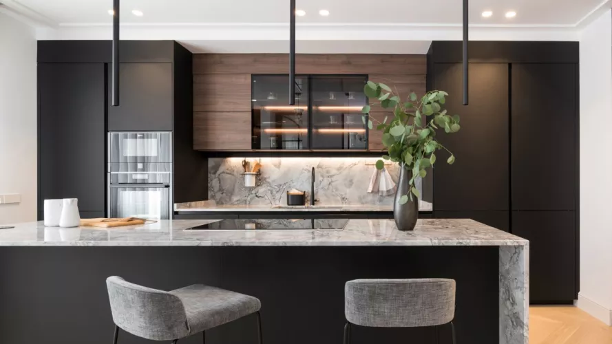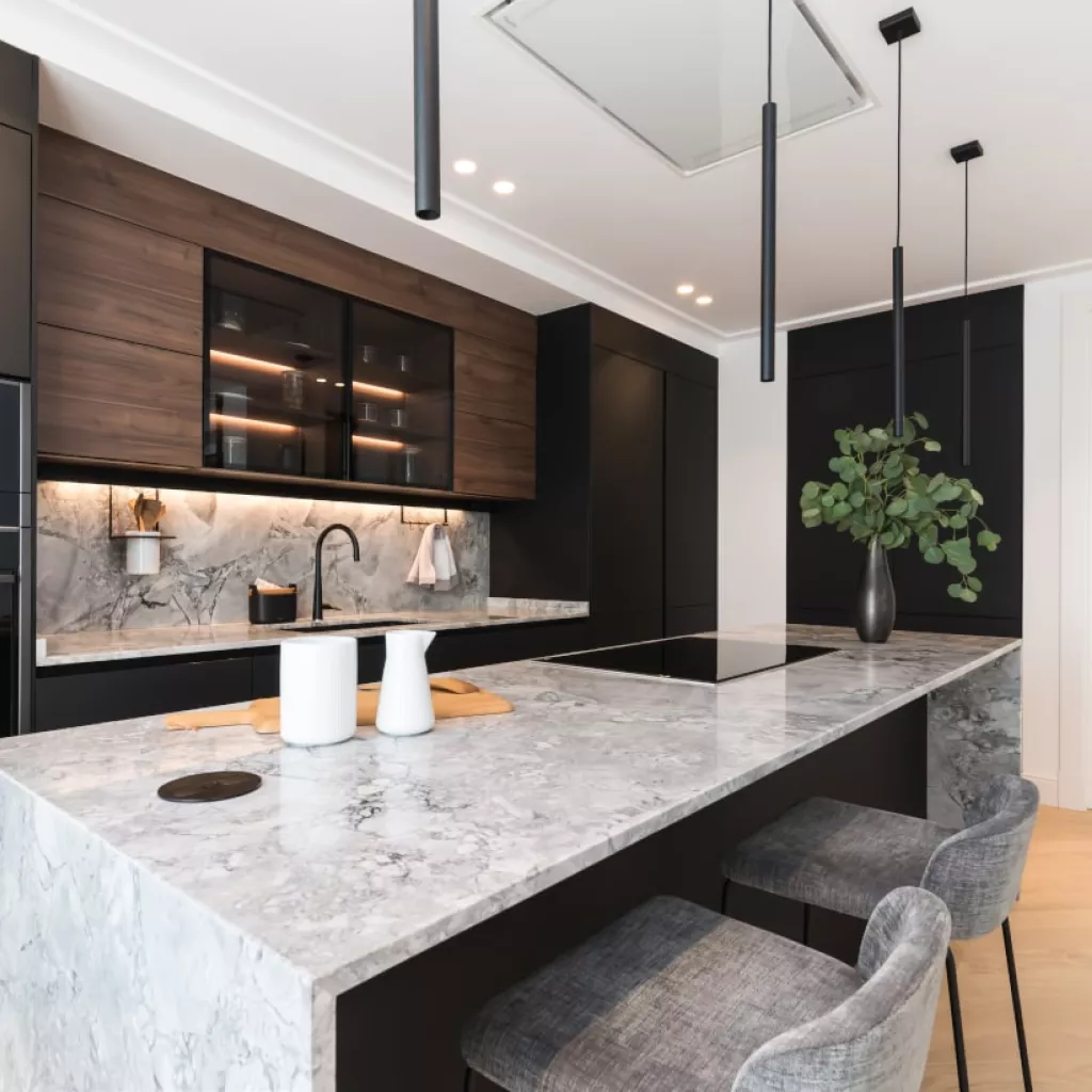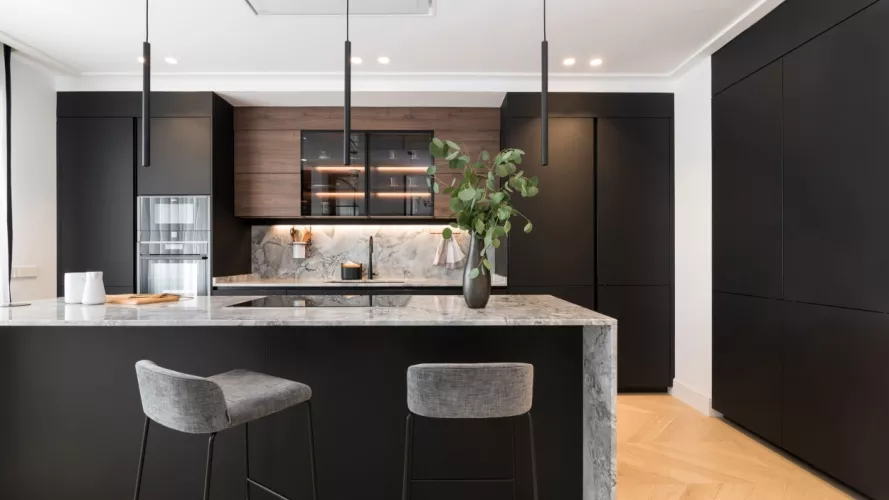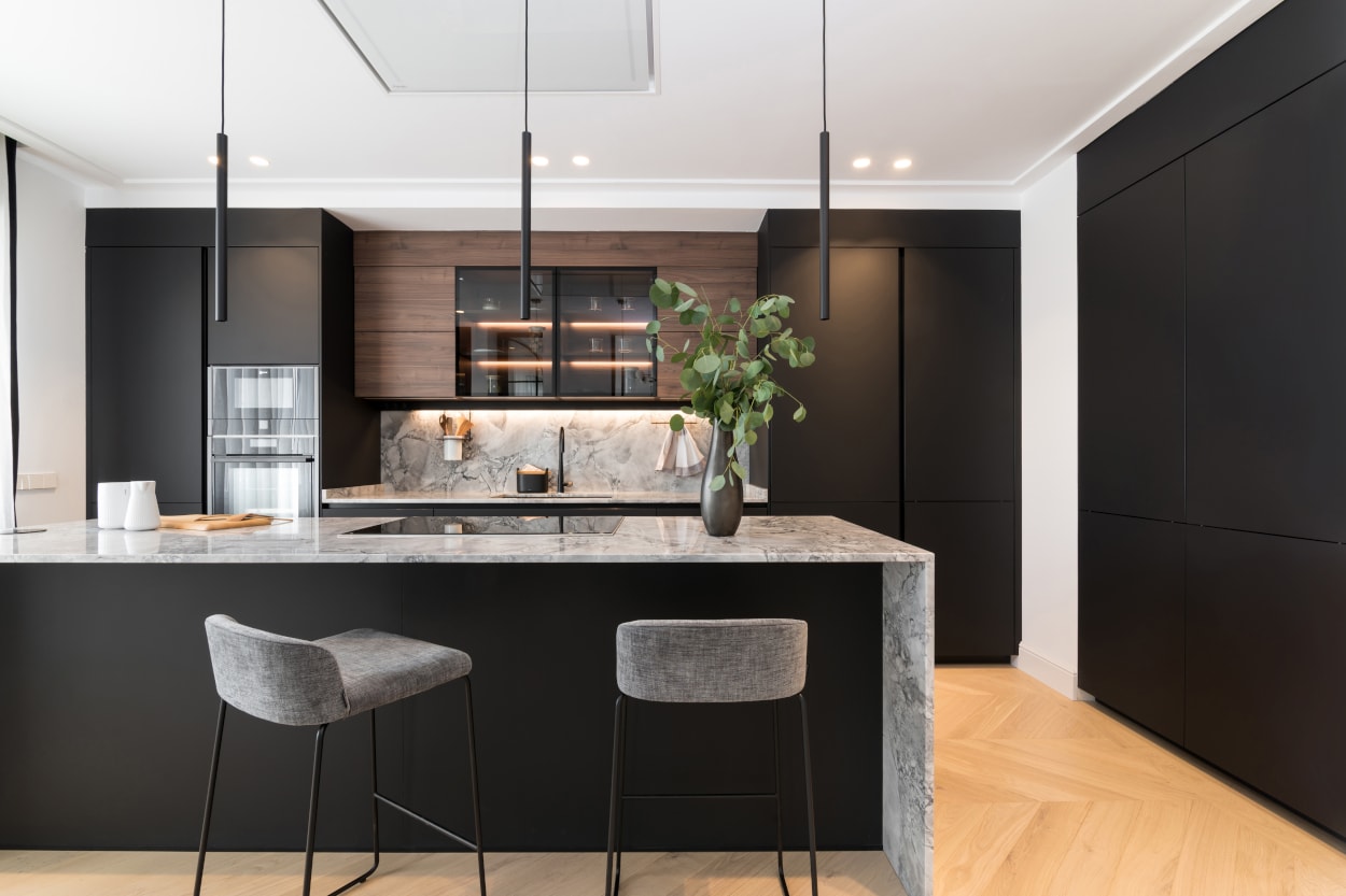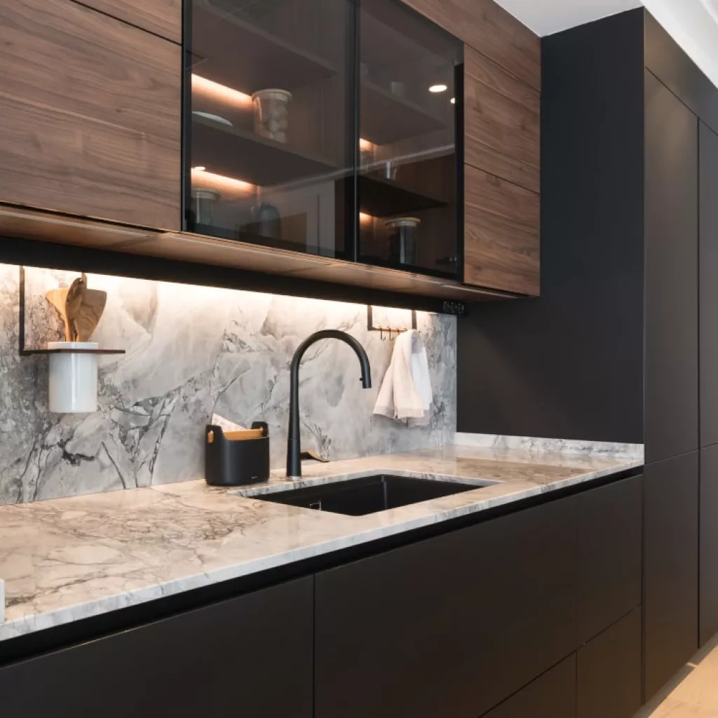 El diseño de esta cocina en color negro seda y nogal tierra, se fusiona con decoración de la vivienda, creando un ambiente conectado muy elegante.