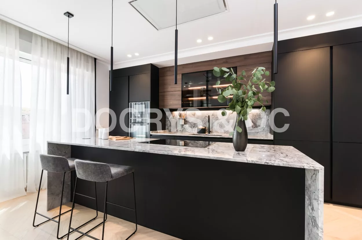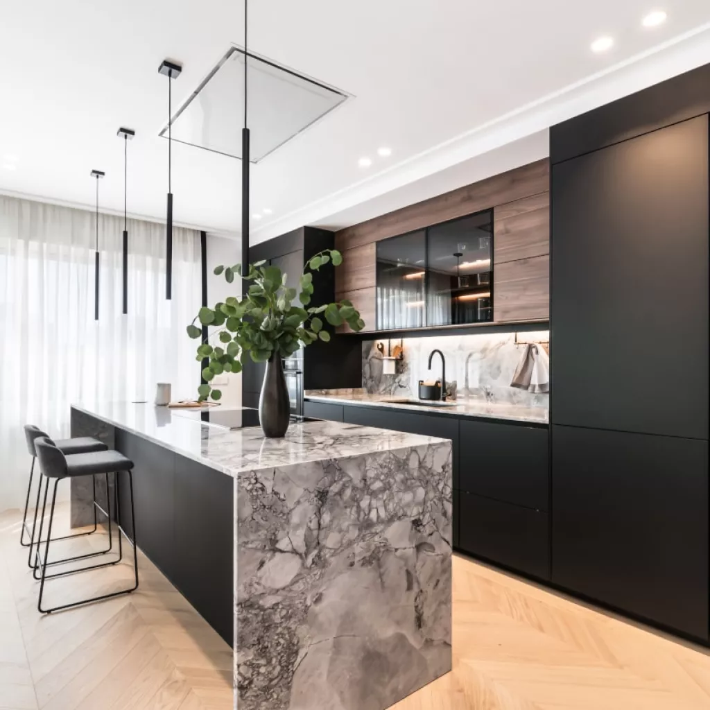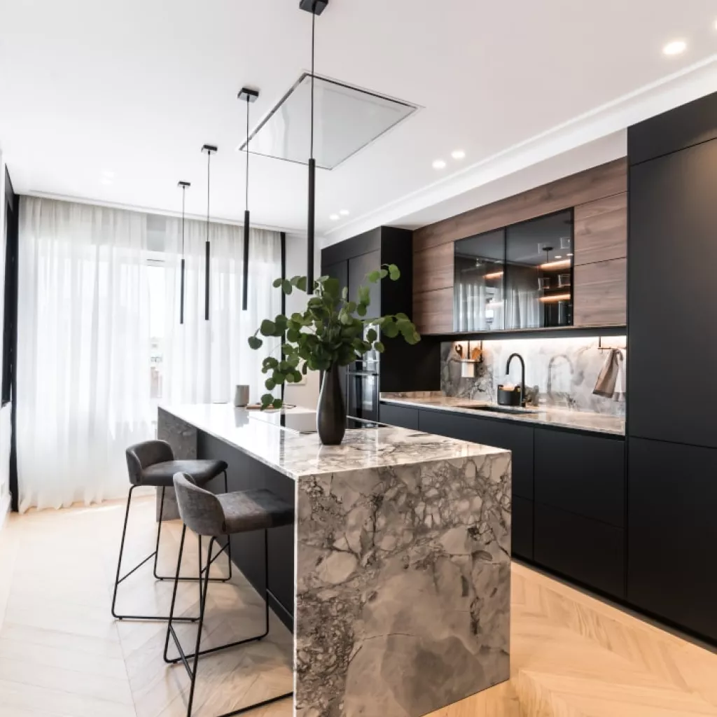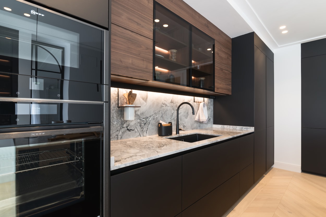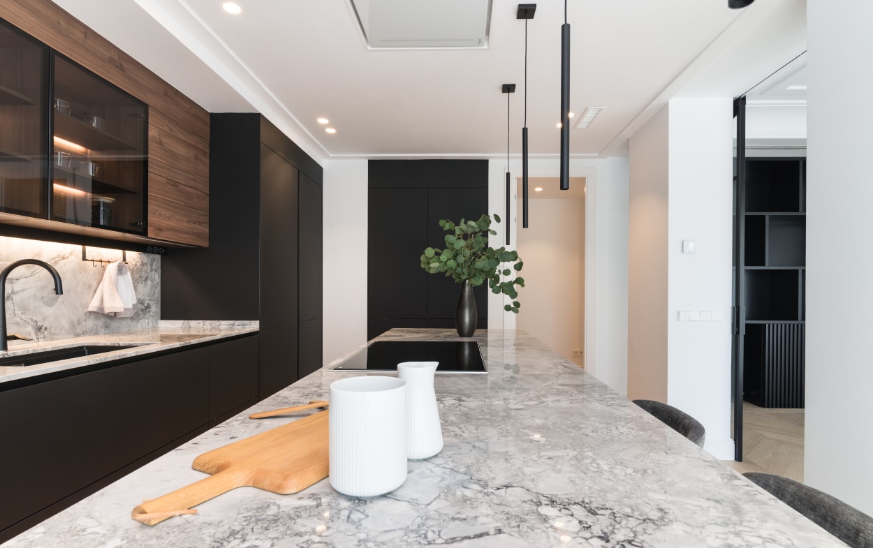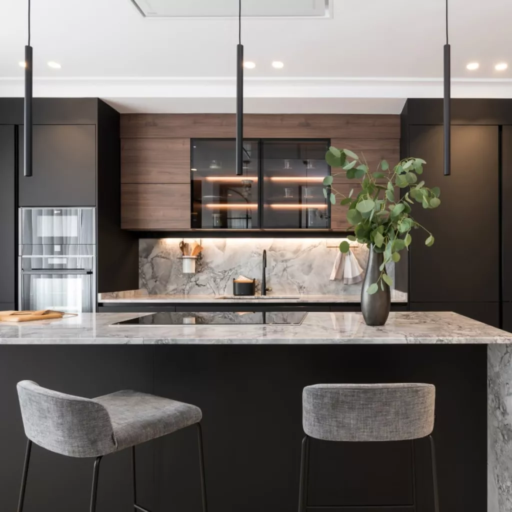 El diseño de esta cocina en color negro seda y nogal tierra, se fusiona con decoración de la vivienda, creando un ambiente conectado muy elegante.