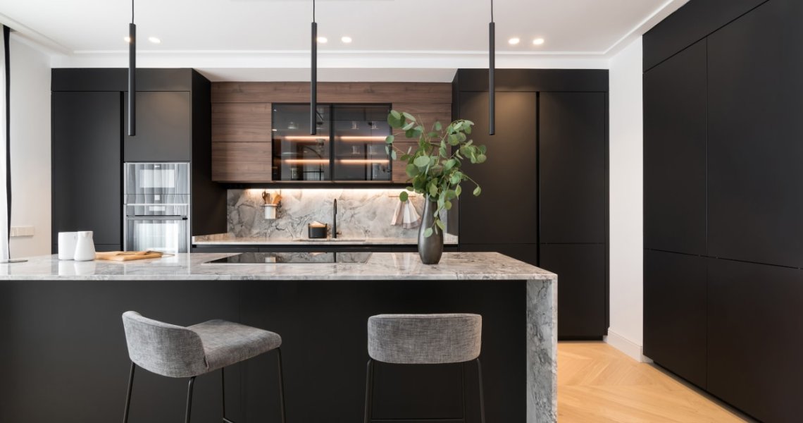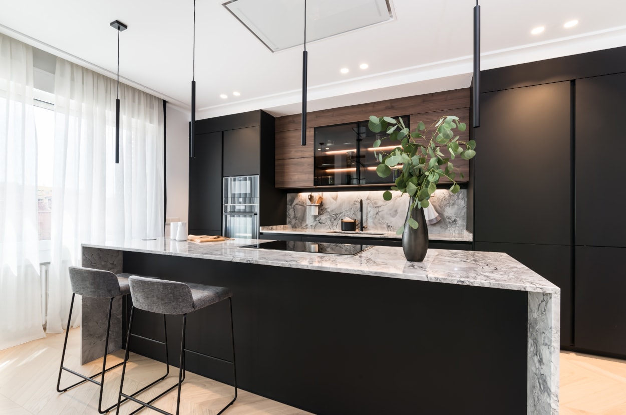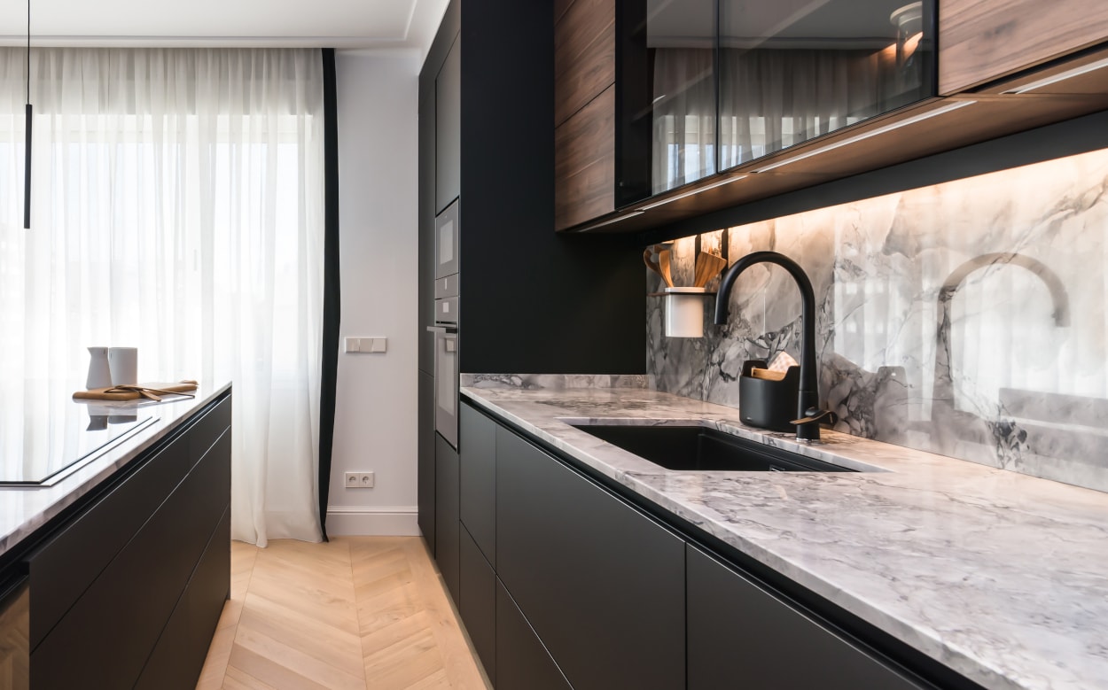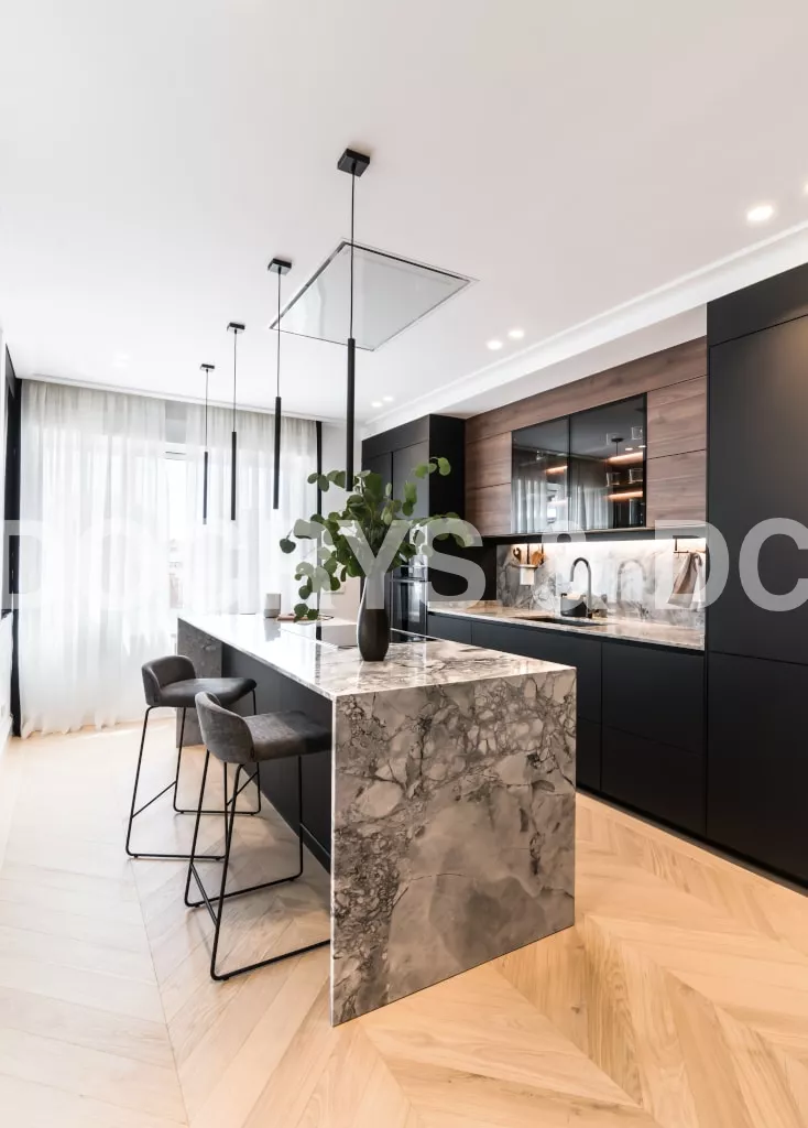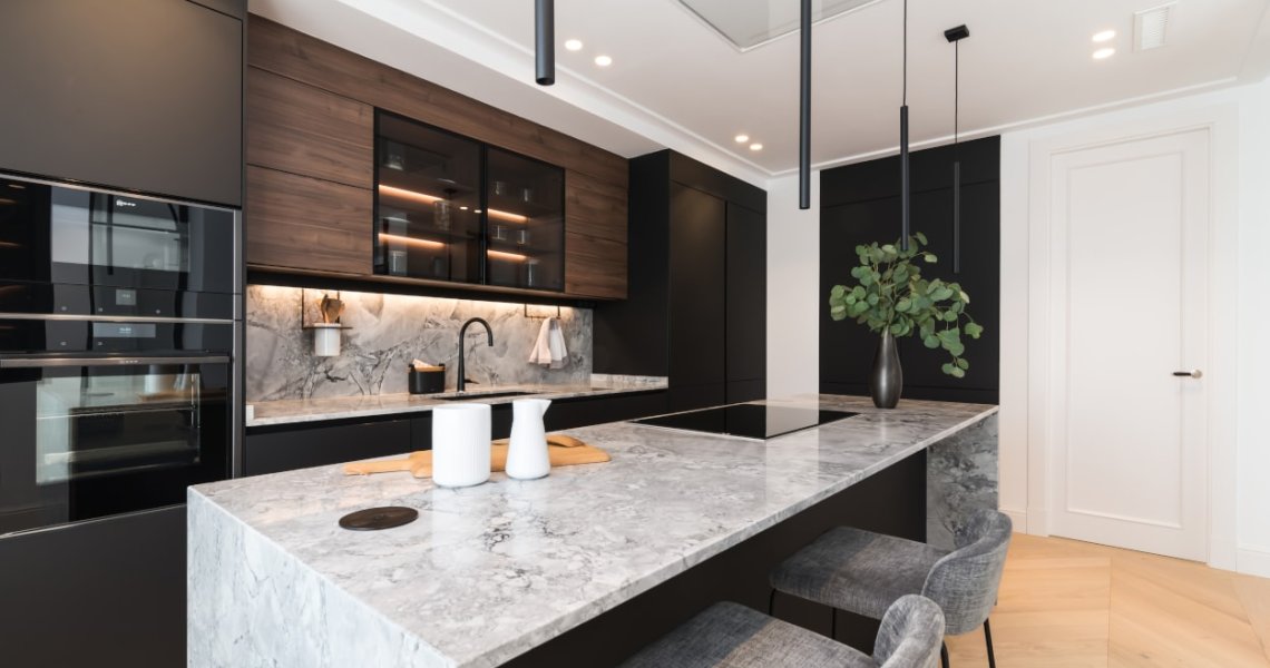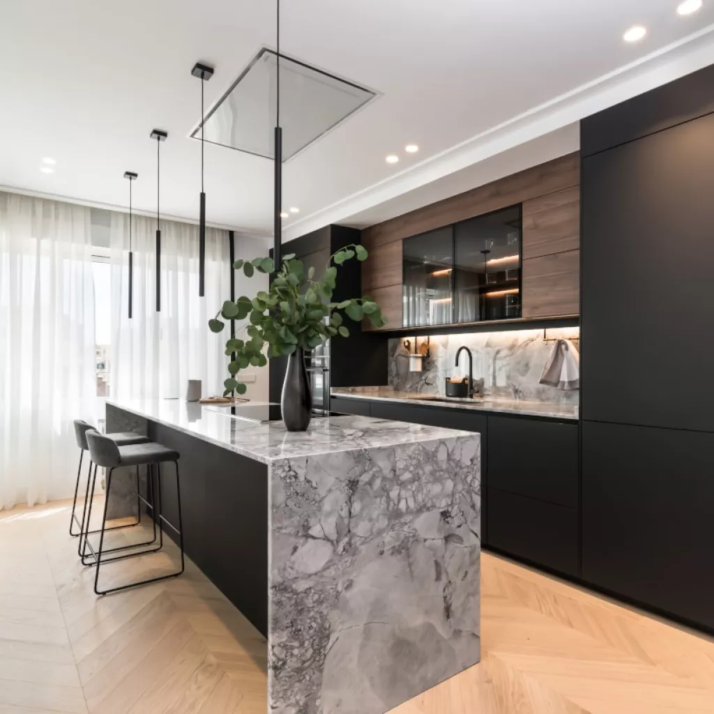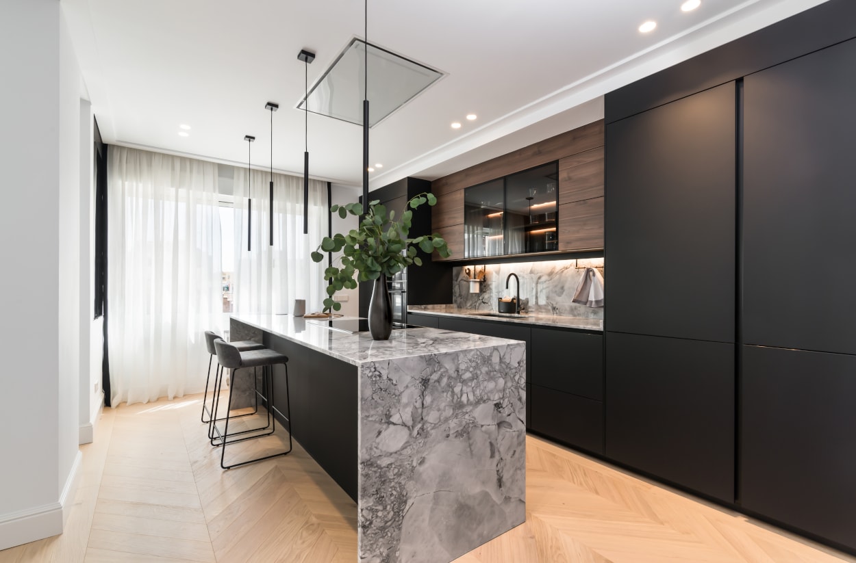 El diseño de esta cocina en color negro seda y nogal tierra, se fusiona con decoración de la vivienda, creando un ambiente conectado muy elegante.