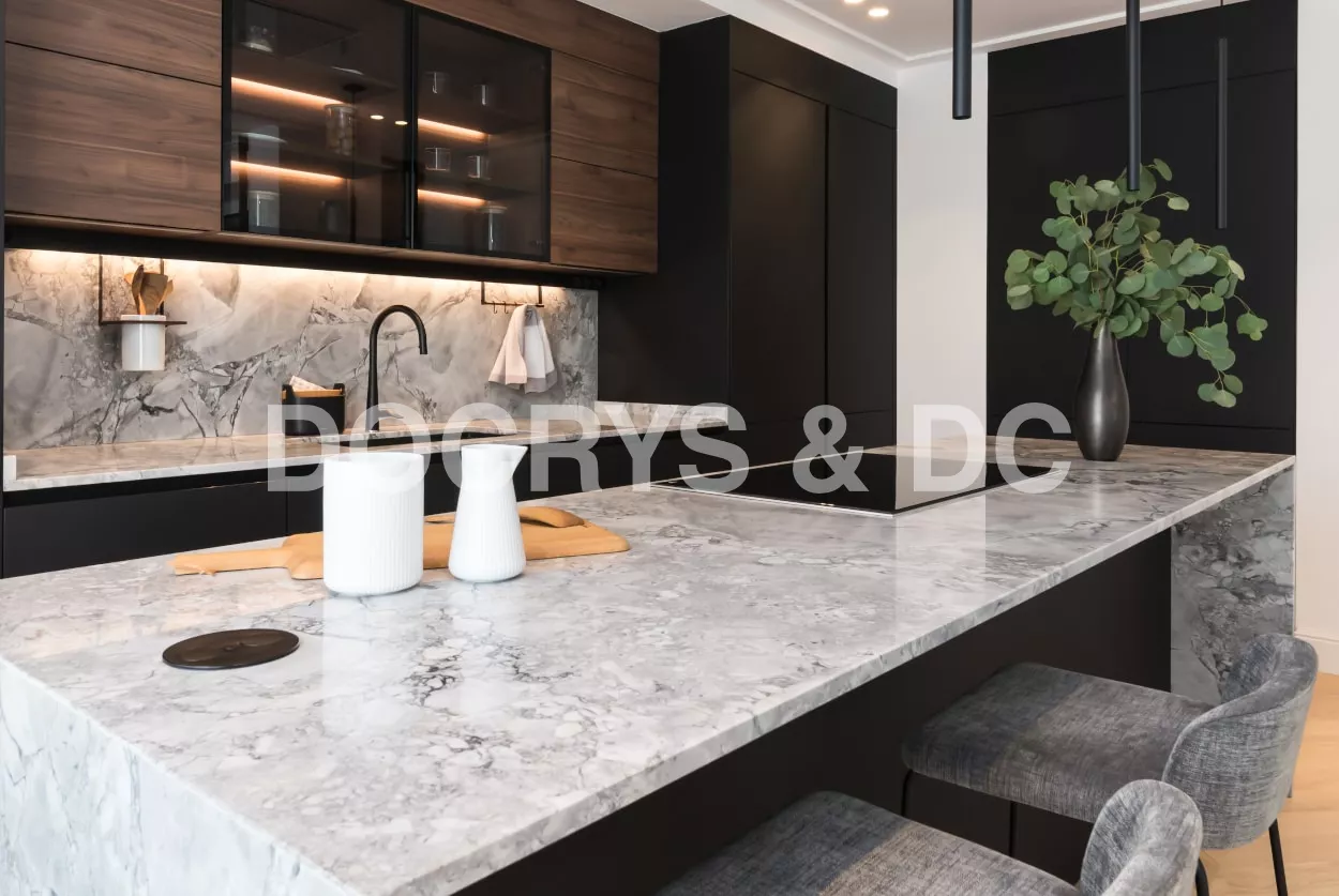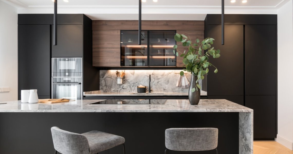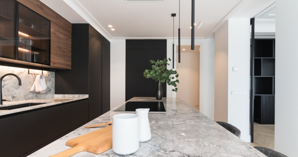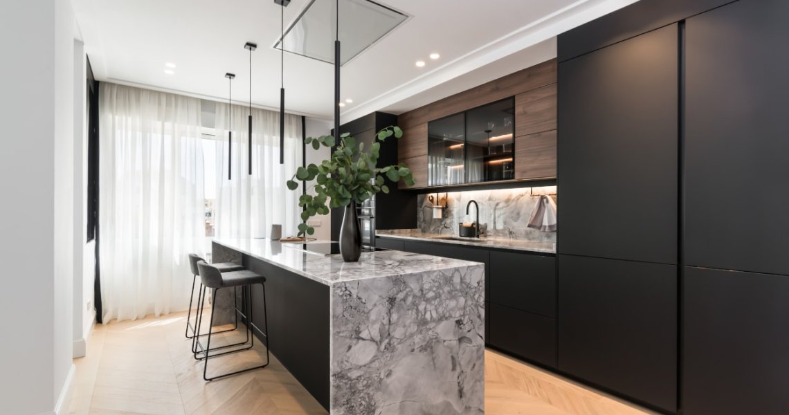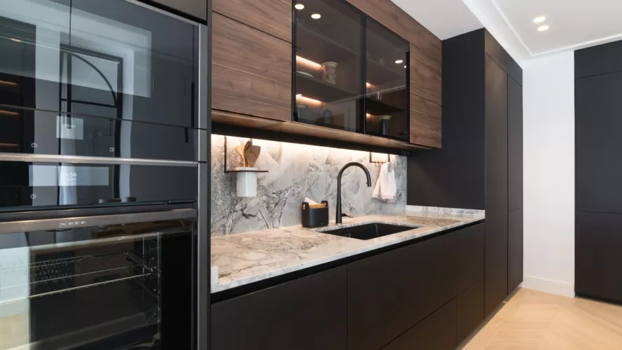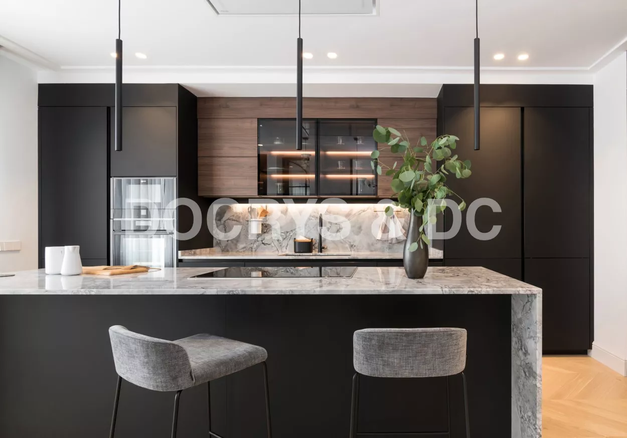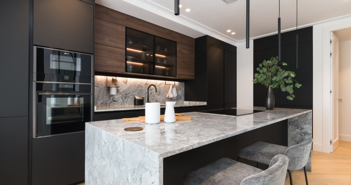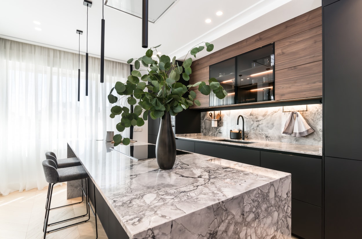 El diseño de esta cocina en color negro seda y nogal tierra, se fusiona con decoración de la vivienda, creando un ambiente conectado muy elegante.