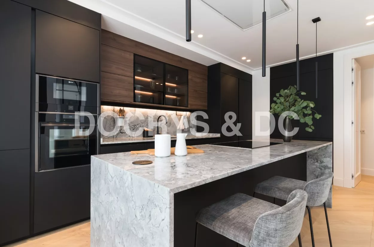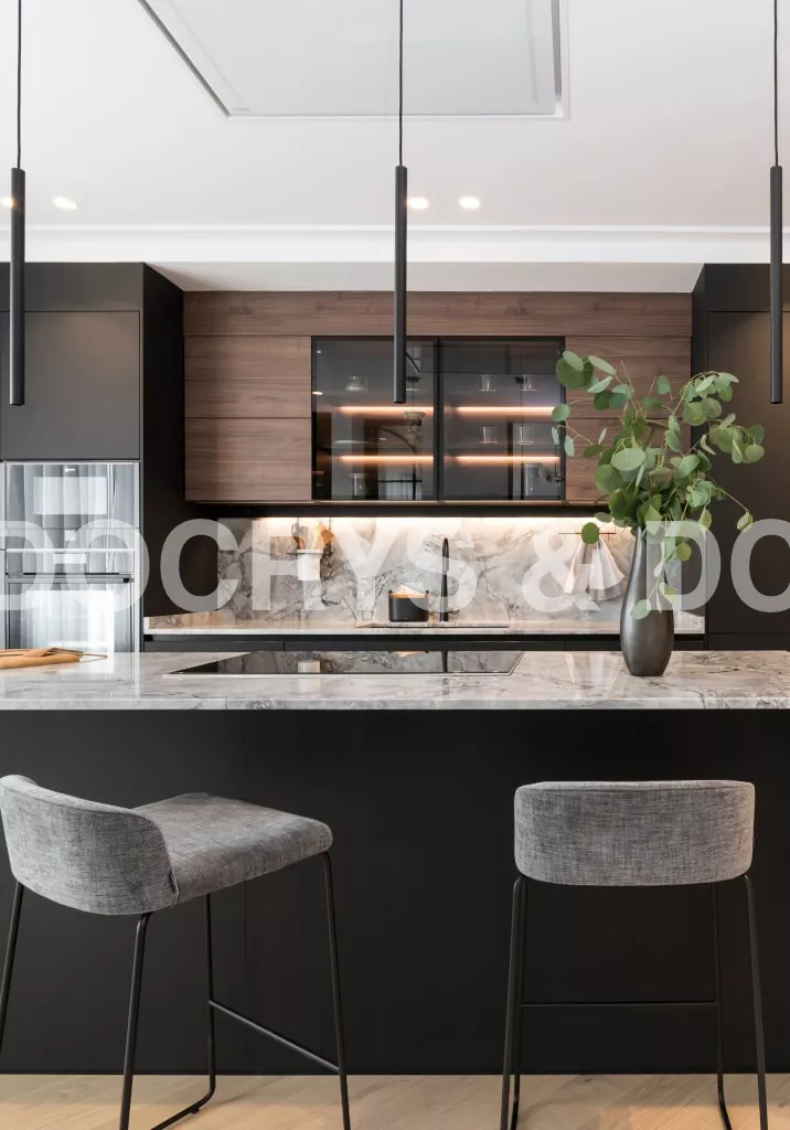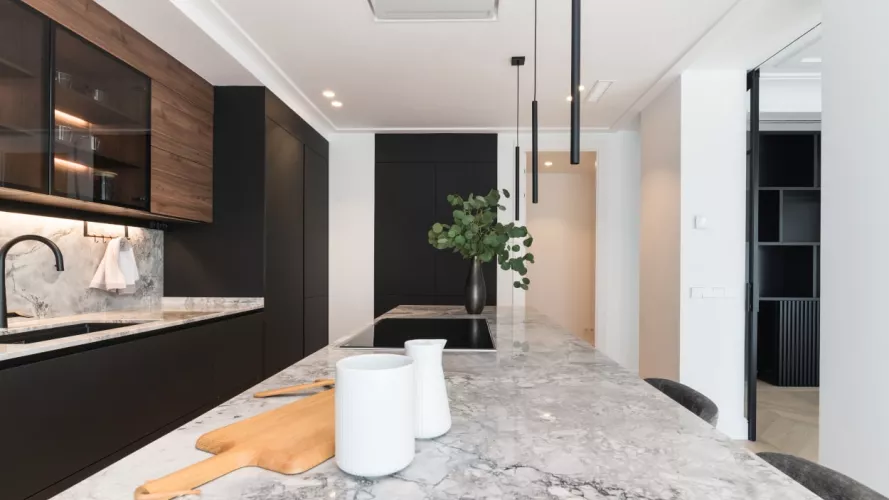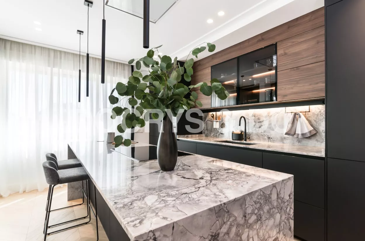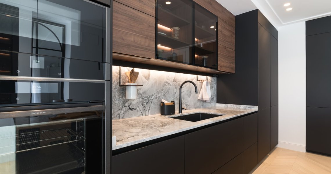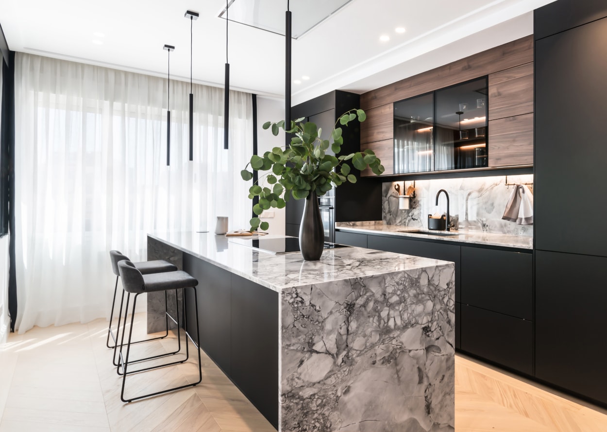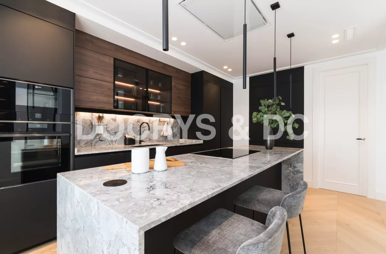 El diseño de esta cocina en color negro seda y nogal tierra, se fusiona con decoración de la vivienda, creando un ambiente conectado muy elegante.