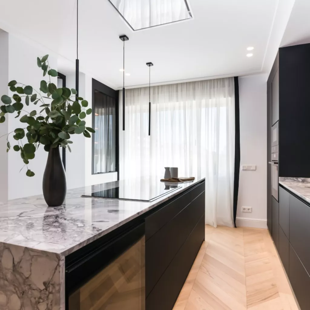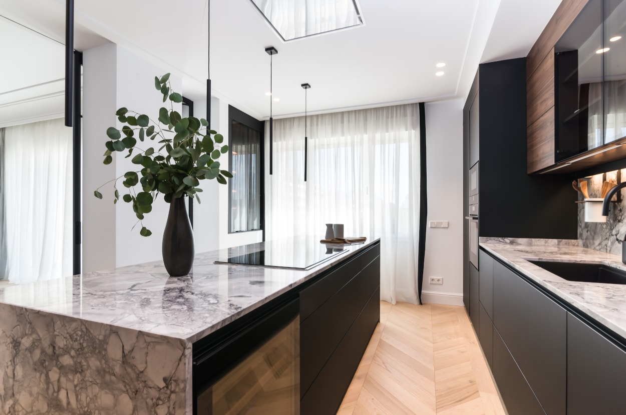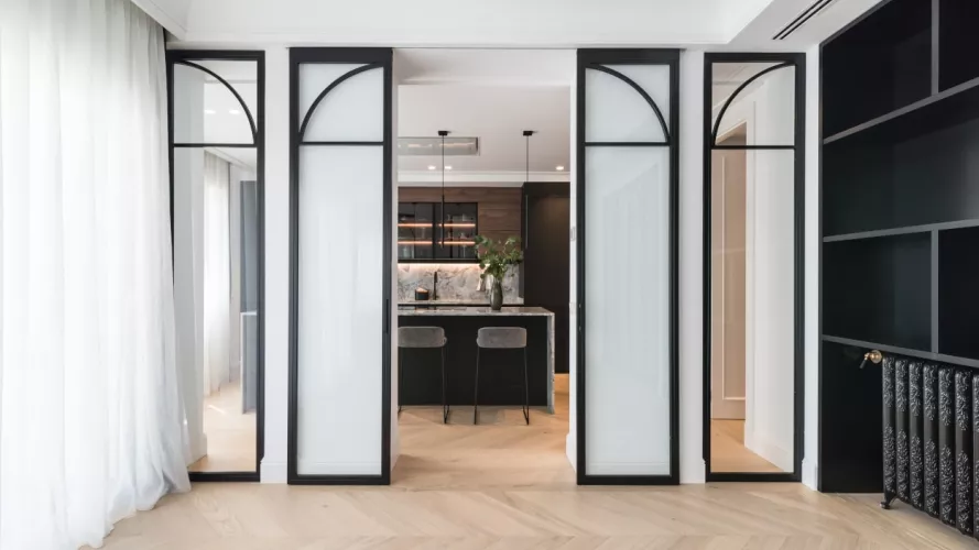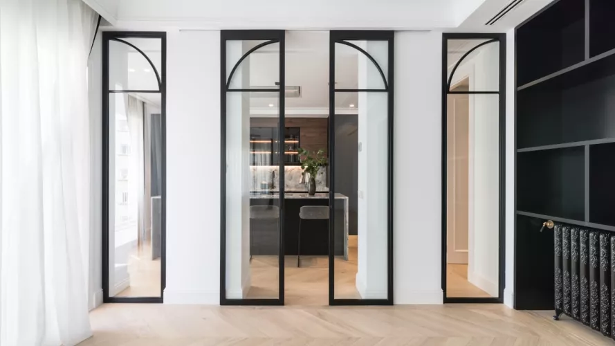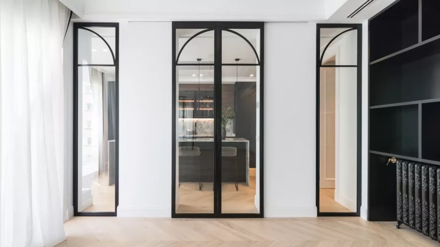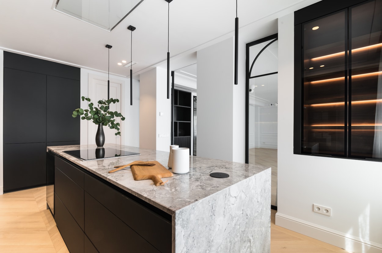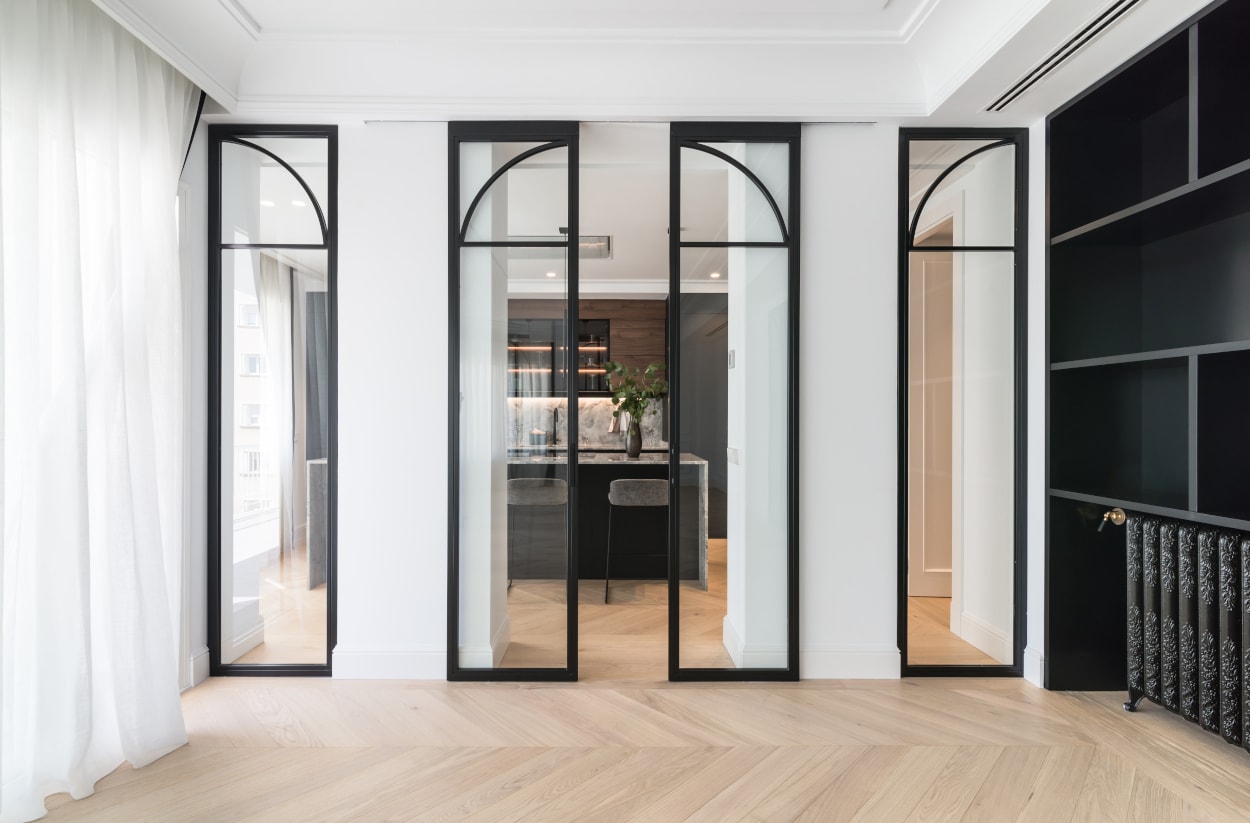 Esta cocina se ubica en una estancia de 18 m2 y se conecta con salón a través de una puerta correderas de cristal y alumino lacado en negro, dejando entrar la luminosidad y creando sensación de amplitud.