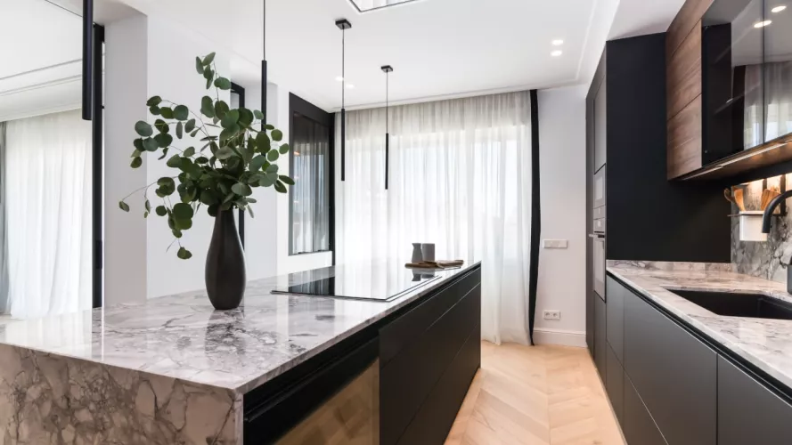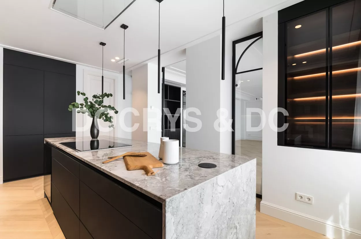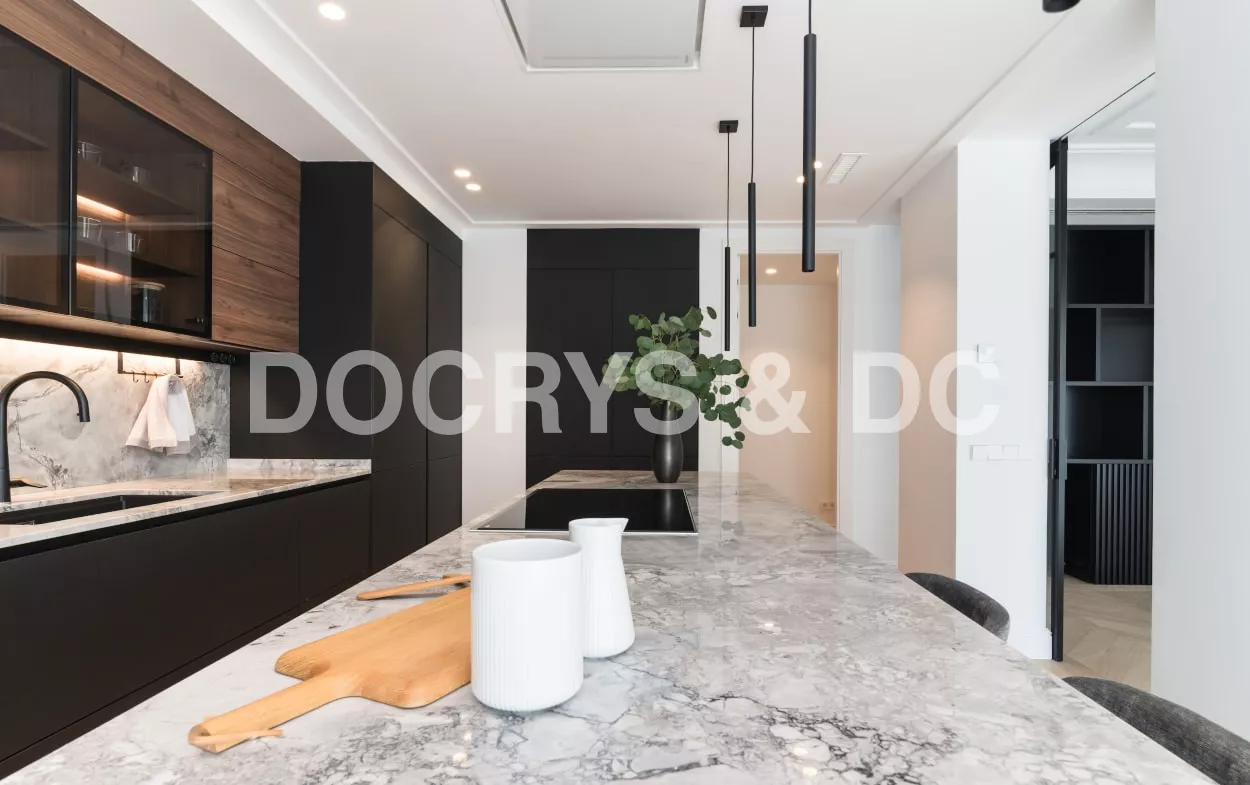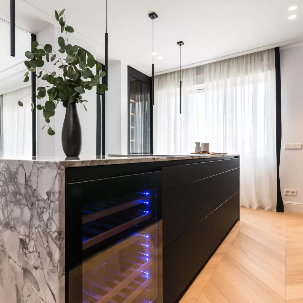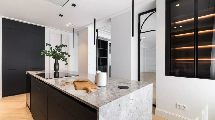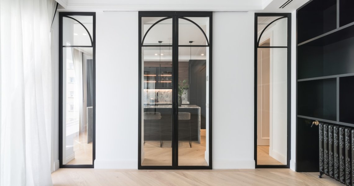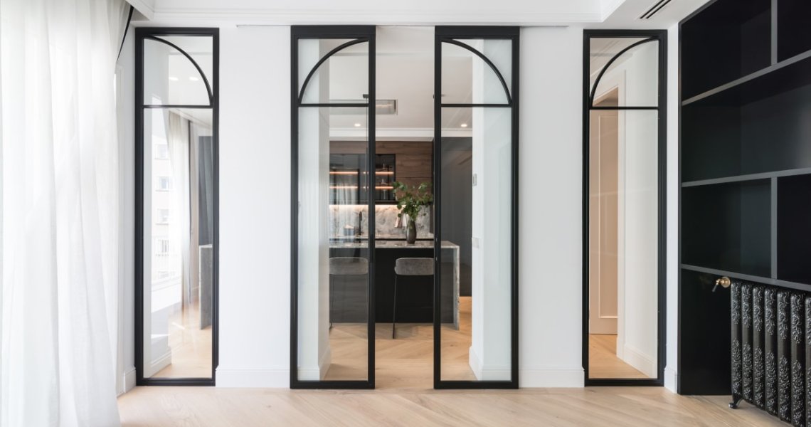 Esta cocina se ubica en una estancia de 18 m2 y se conecta con salón a través de una puerta correderas de cristal y alumino lacado en negro, dejando entrar la luminosidad y creando sensación de amplitud.