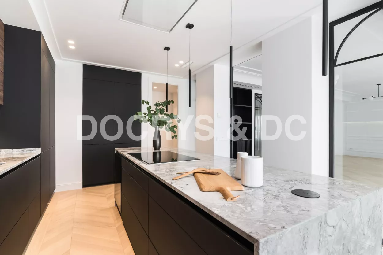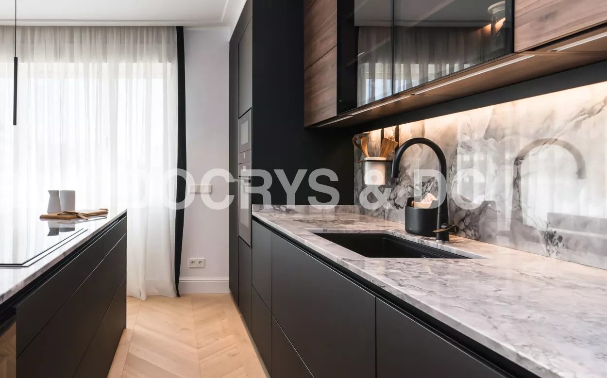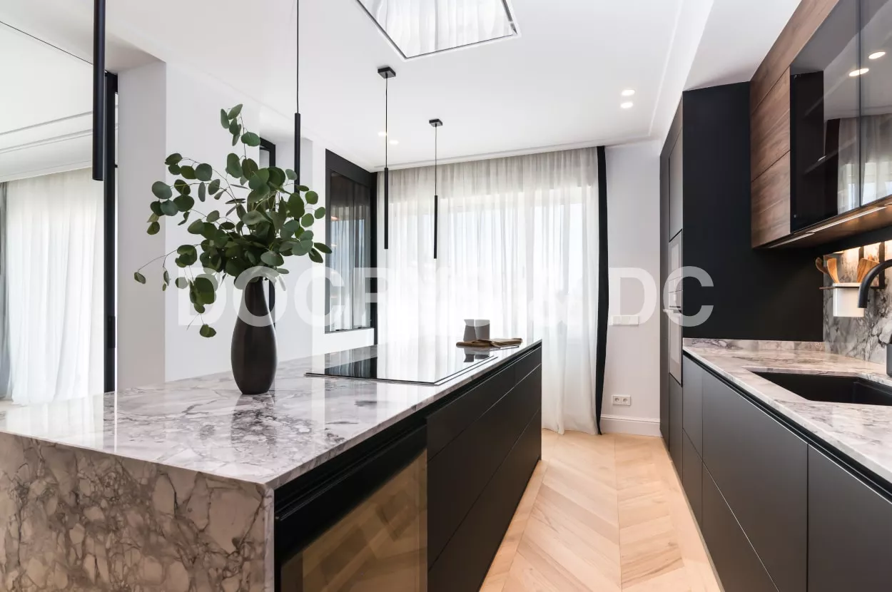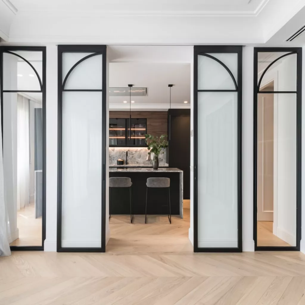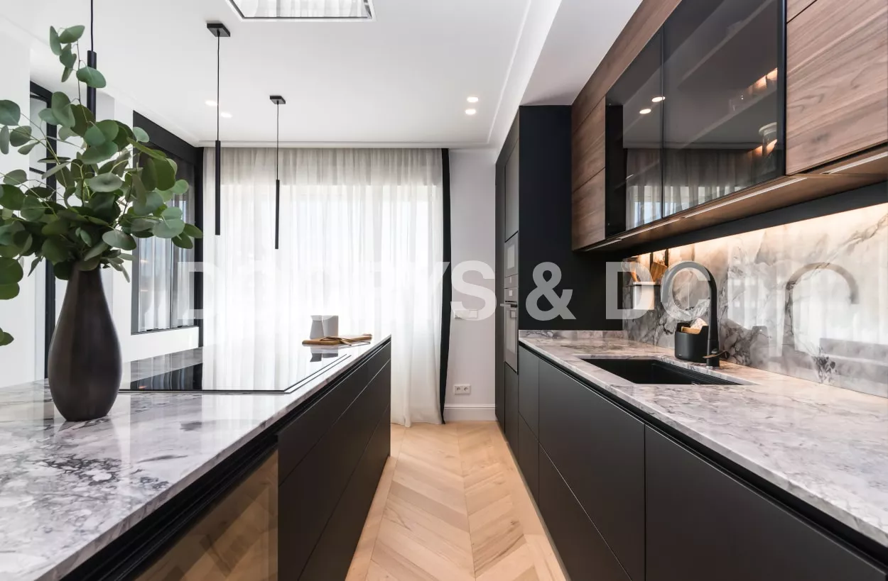 Esta cocina se ubica en una estancia de 18 m2 y se conecta con salón a través de una puerta correderas de cristal y alumino lacado en negro, dejando entrar la luminosidad y creando sensación de amplitud.