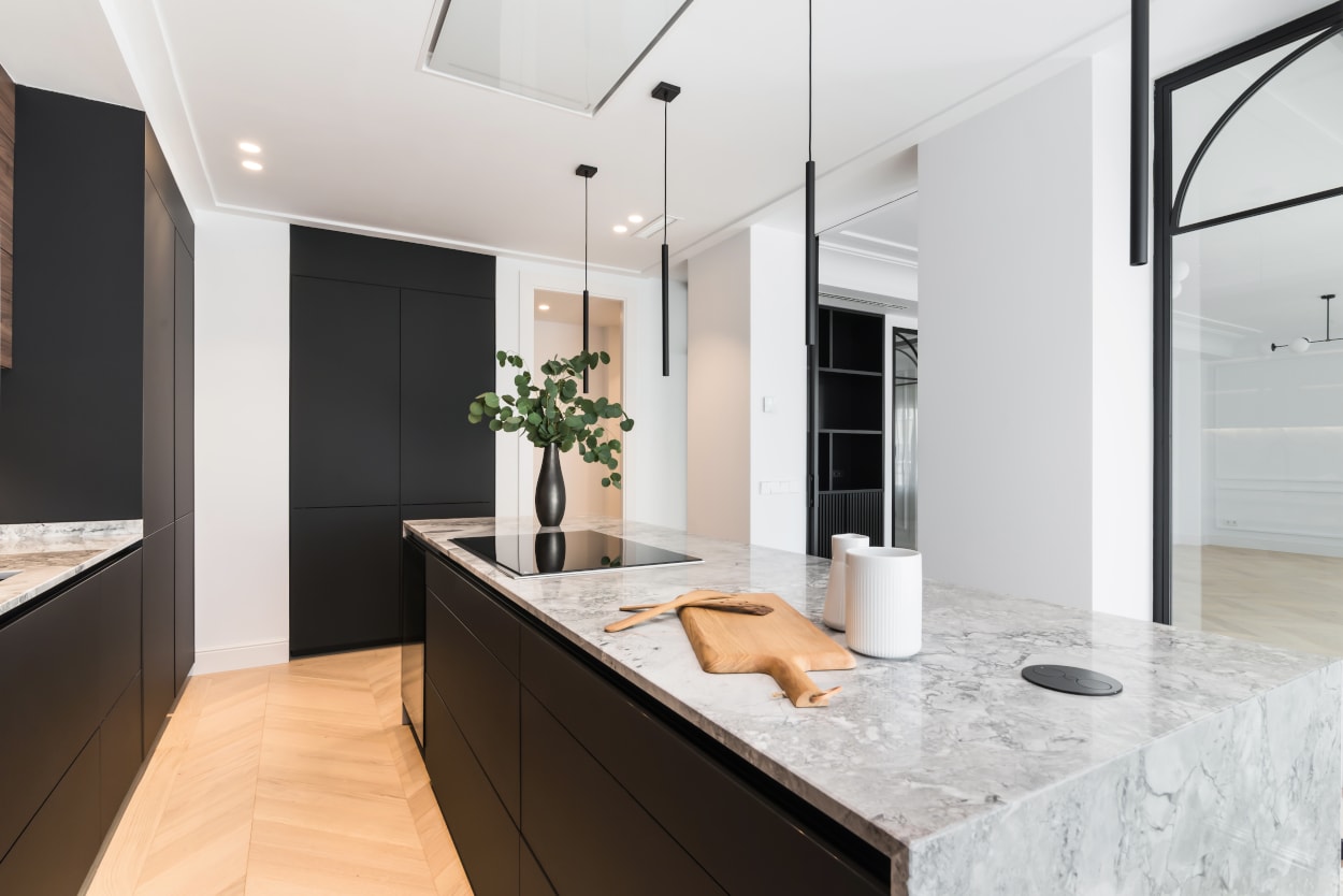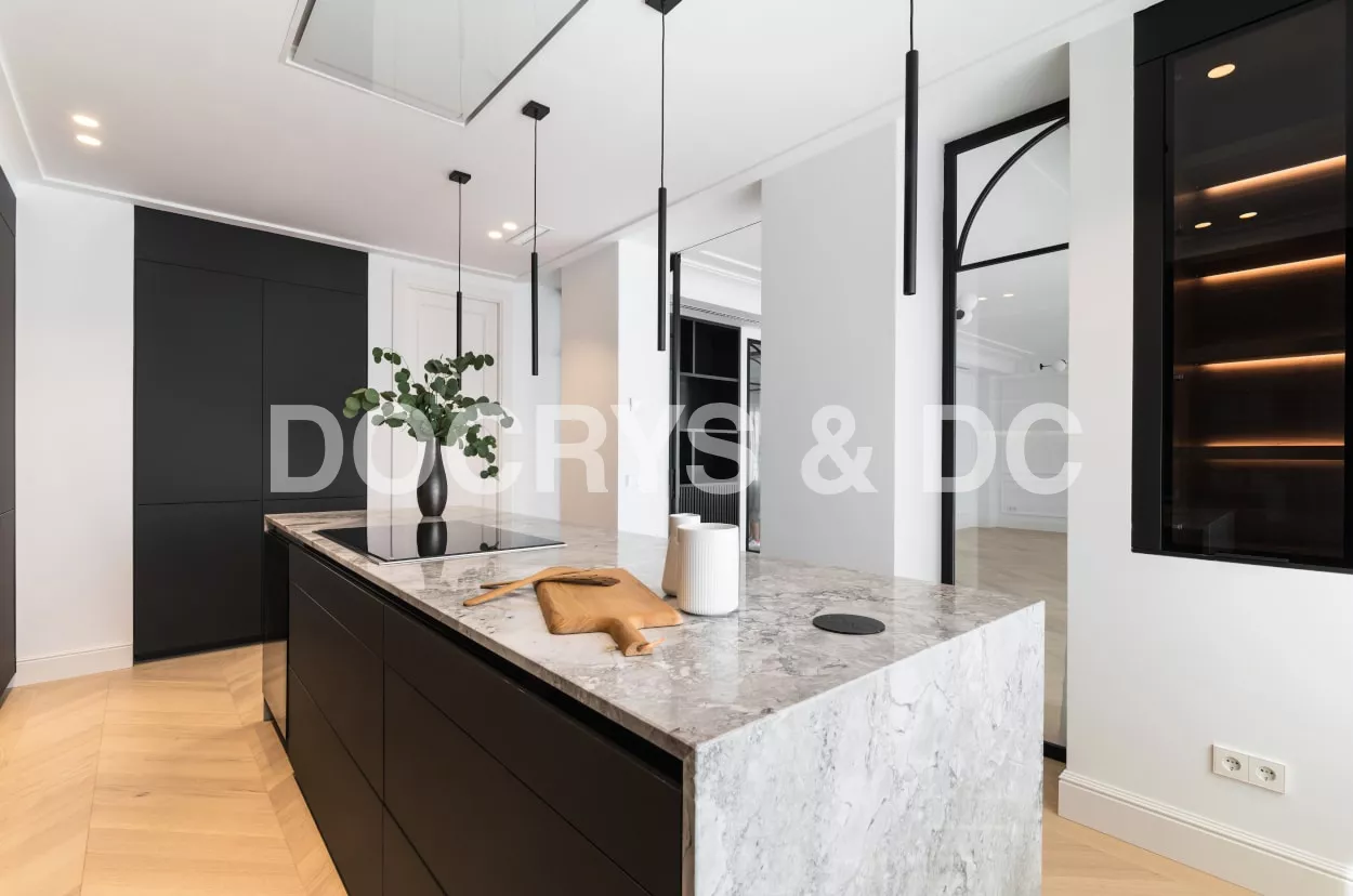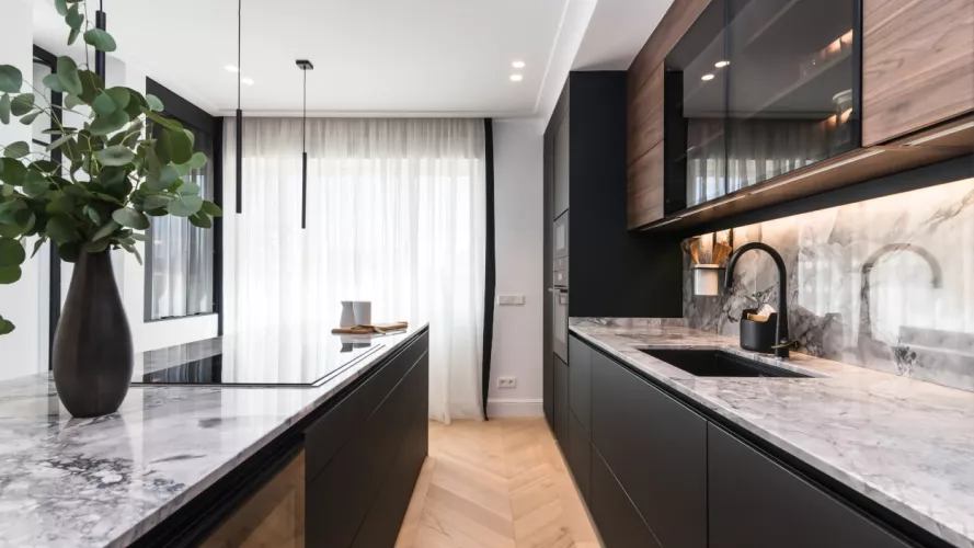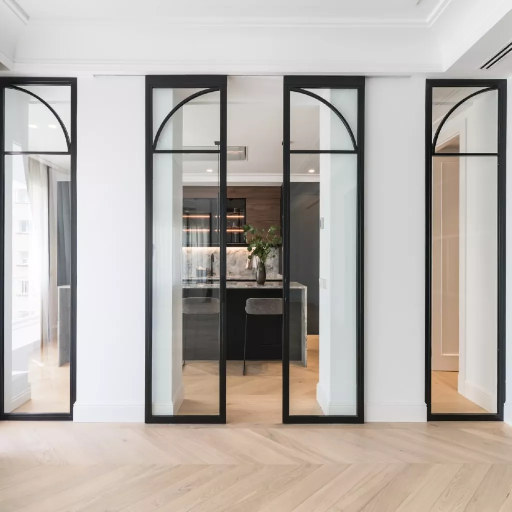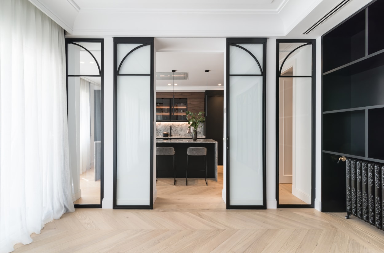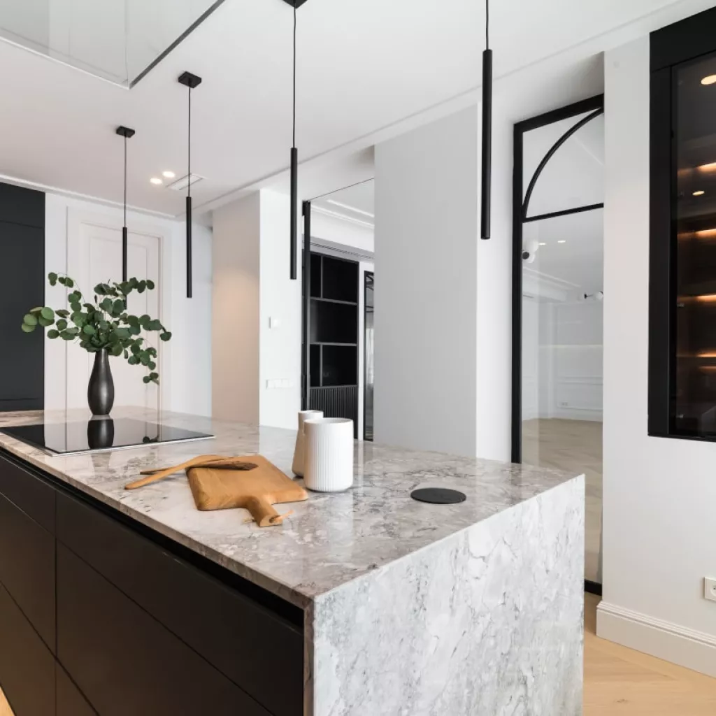 Esta cocina se ubica en una estancia de 18 m2 y se conecta con salón a través de una puerta correderas de cristal y alumino lacado en negro, dejando entrar la luminosidad y creando sensación de amplitud.