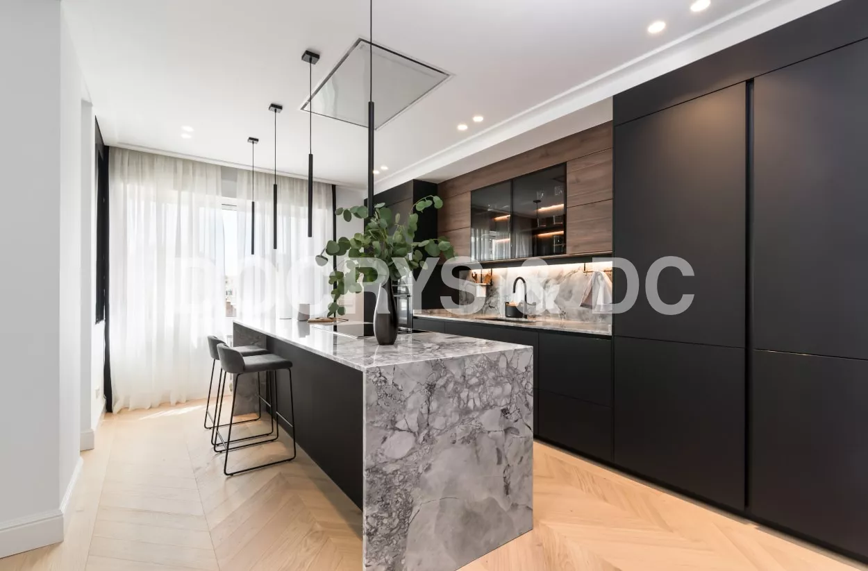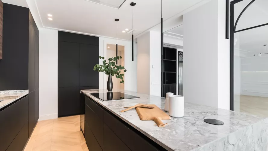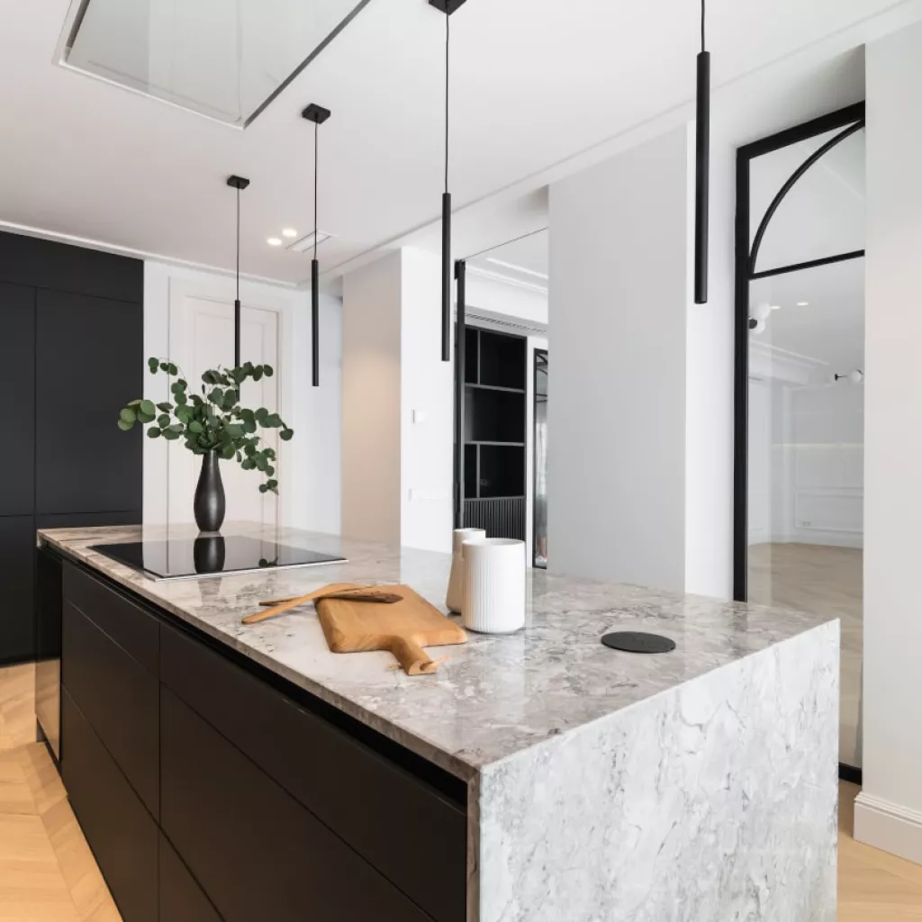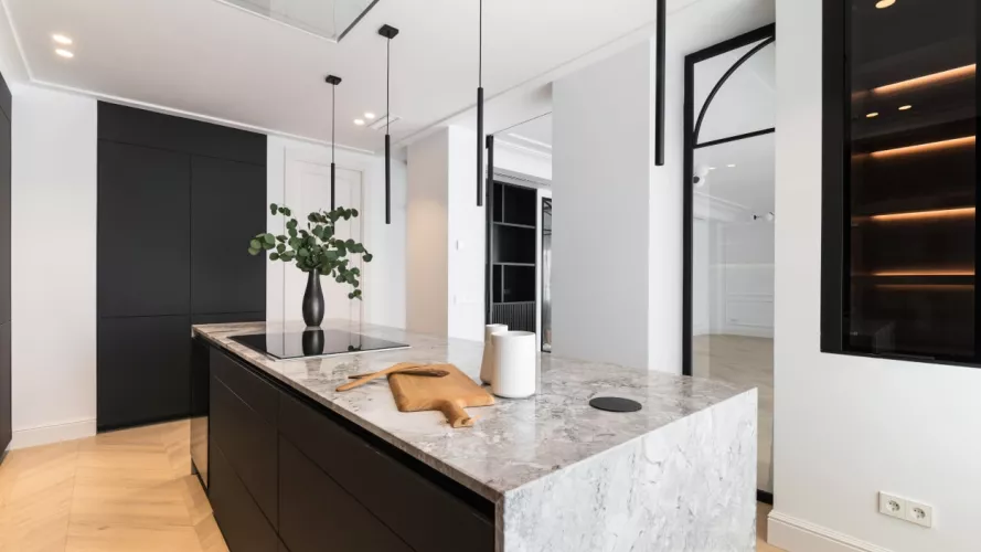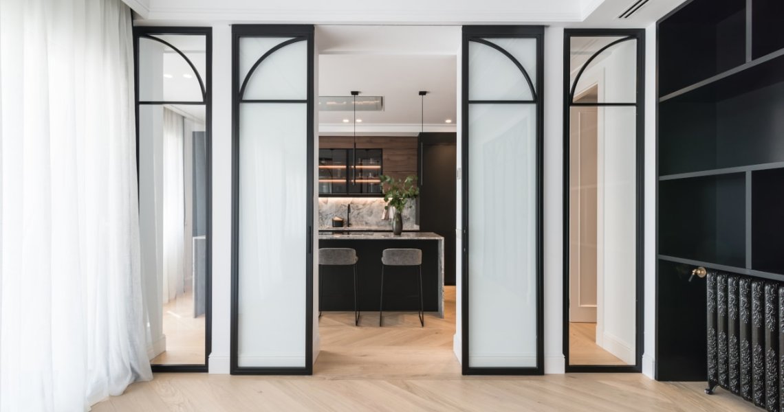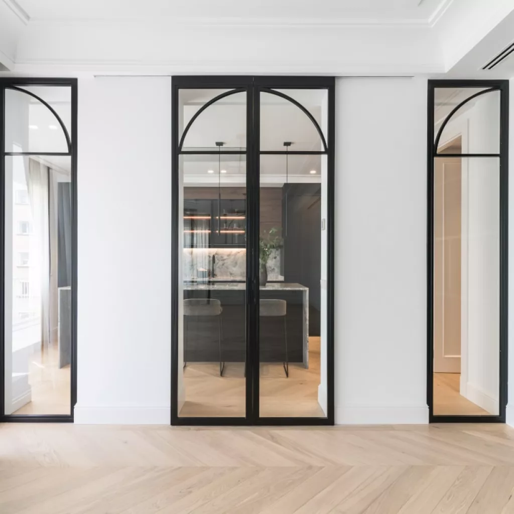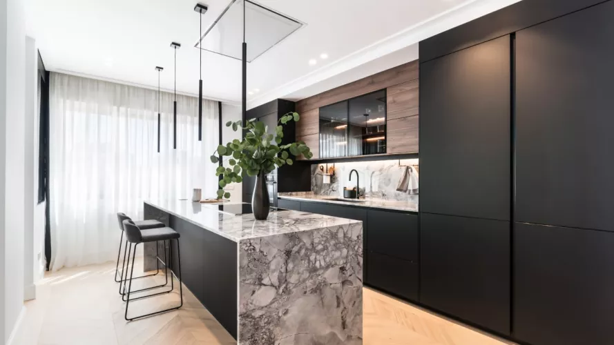 Esta cocina se ubica en una estancia de 18 m2 y se conecta con salón a través de una puerta correderas de cristal y alumino lacado en negro, dejando entrar la luminosidad y creando sensación de amplitud.