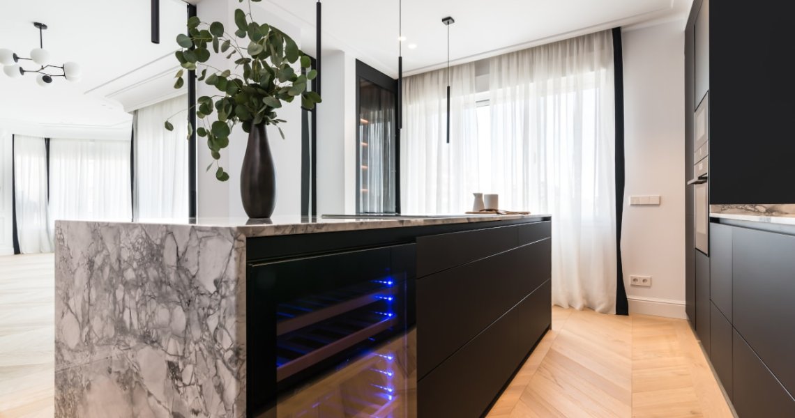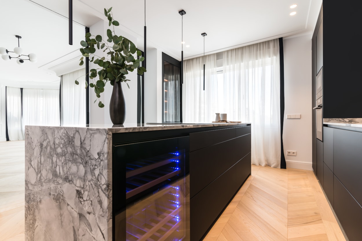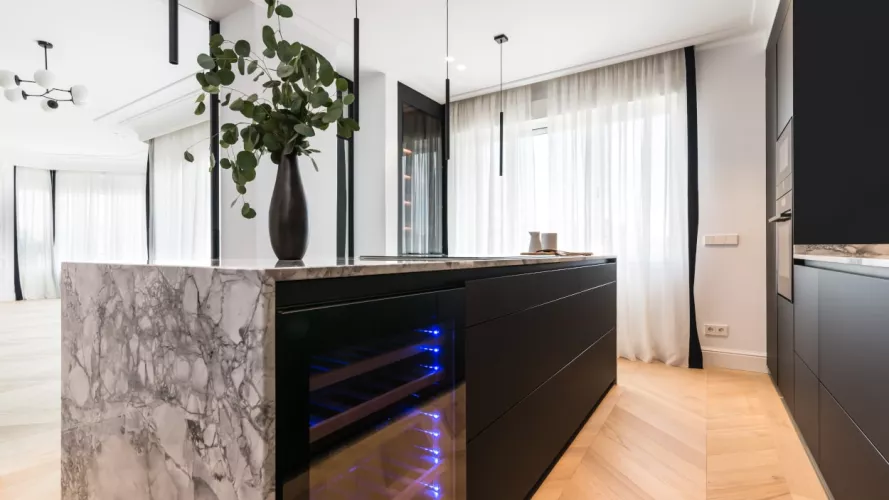 Por otro lado, la isla central, acoge la zona de aguas, una extensa zona de trabajo y una barra para varios comensales.