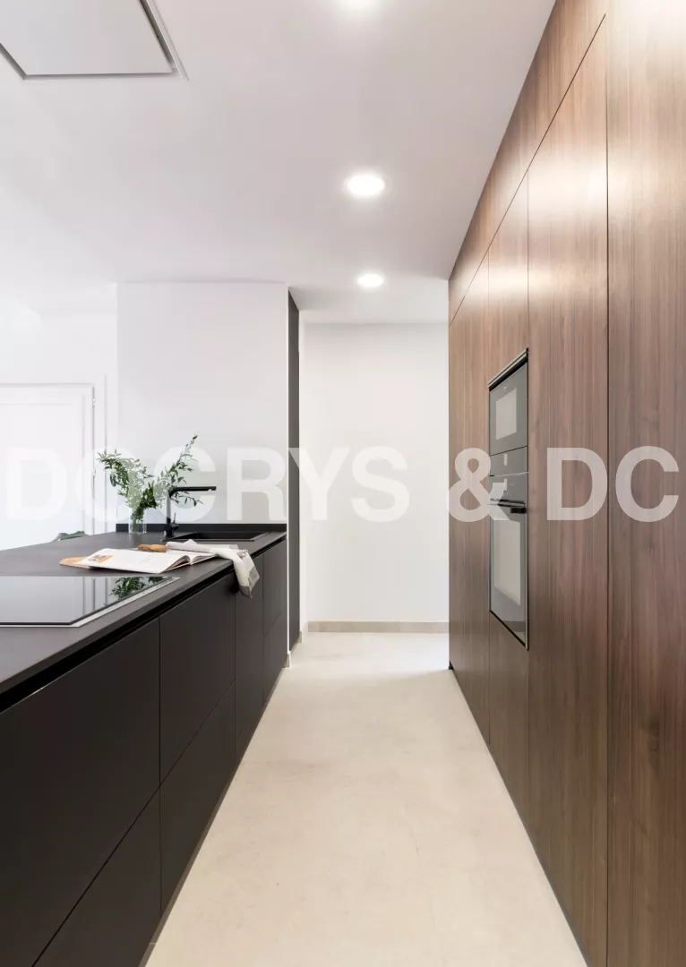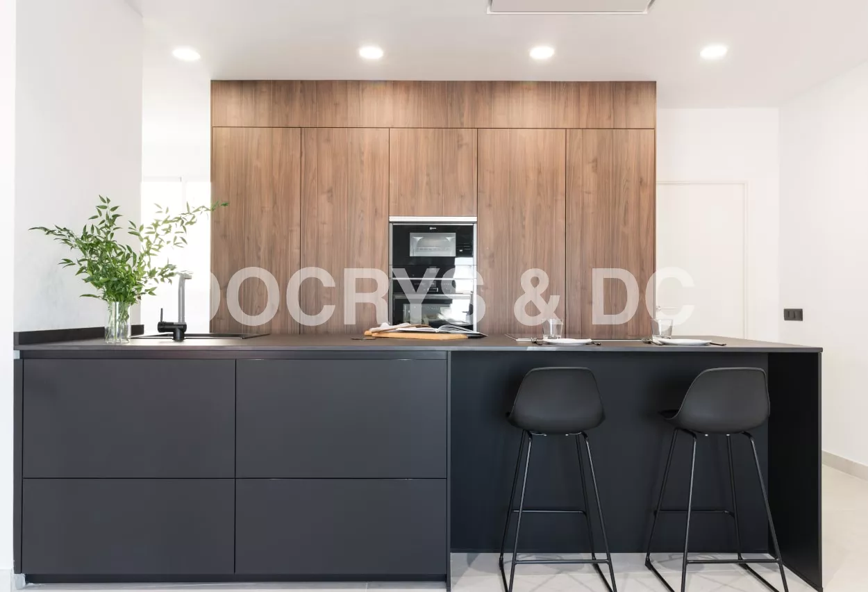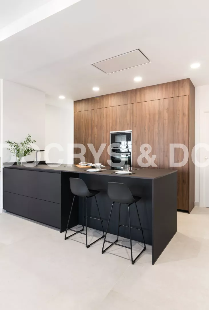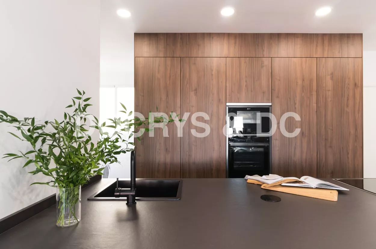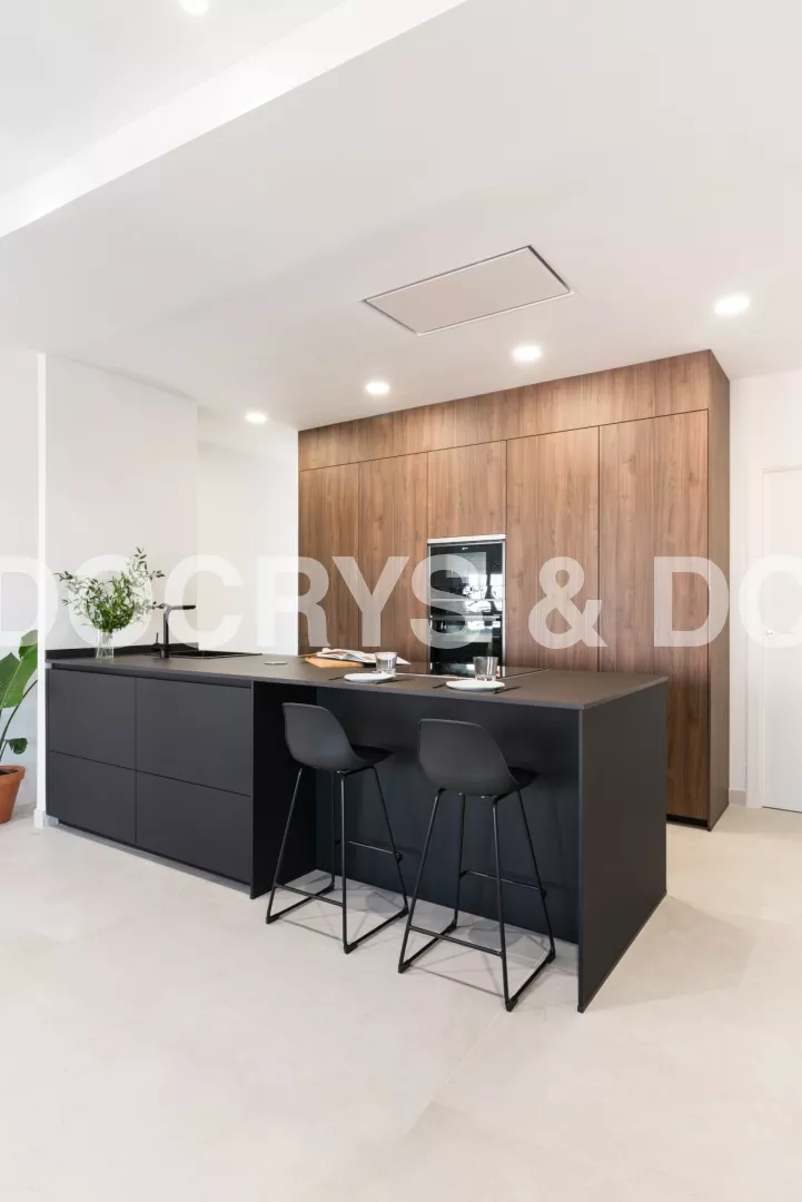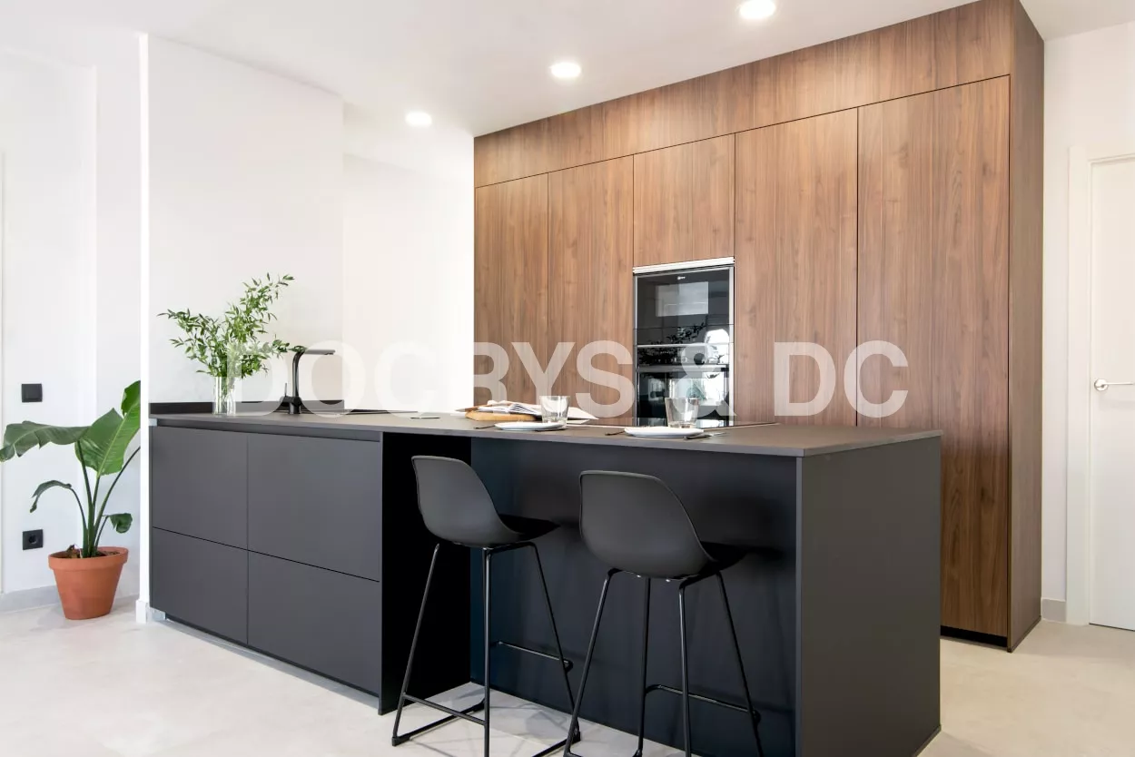 El diseño de esta cocina moderna en color negro seda y nogal tierra, se fusiona en el espacio, creando un ambiente muy elegante y sofisticado.