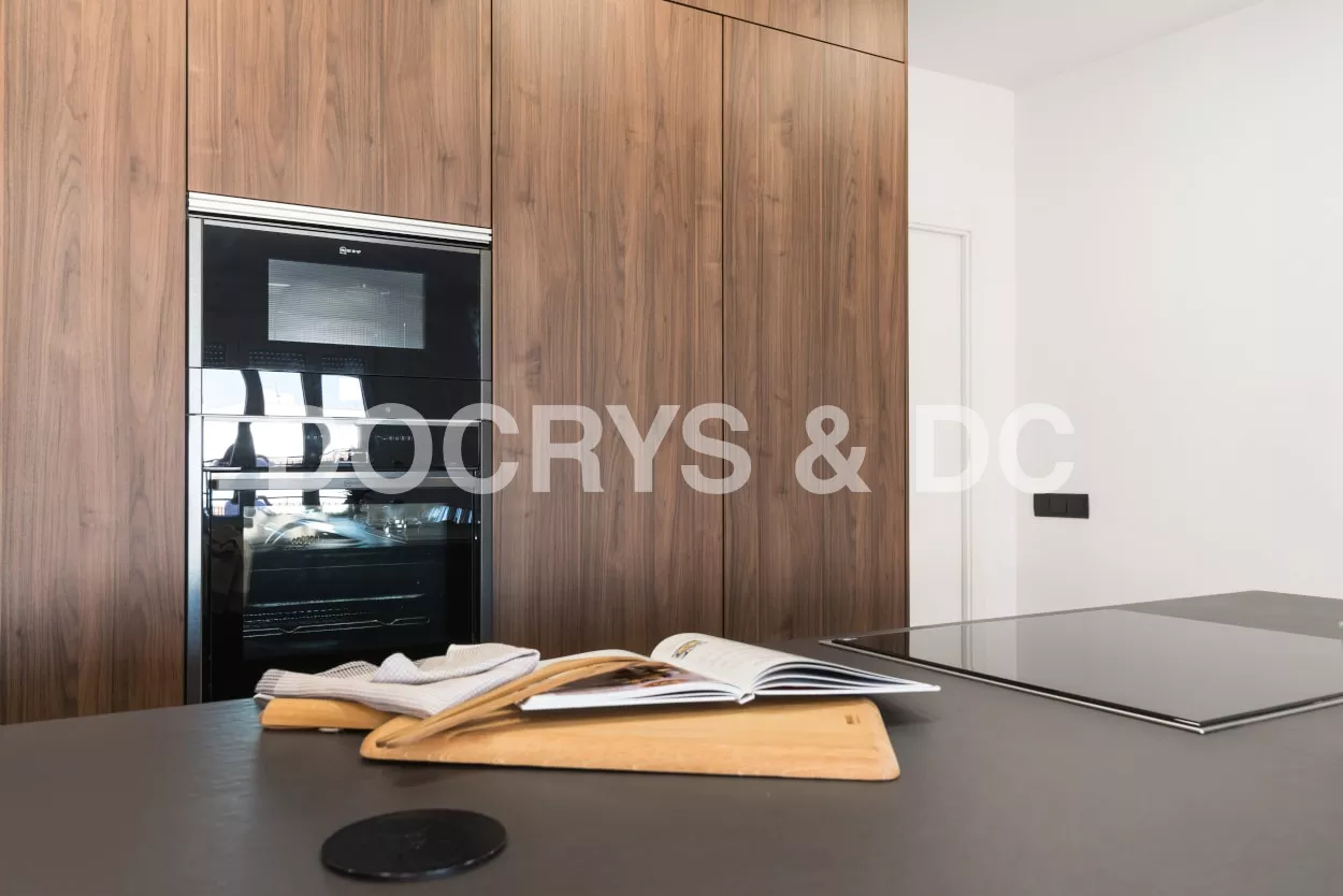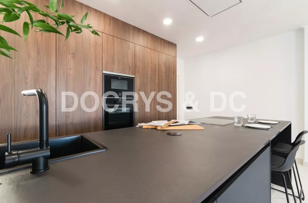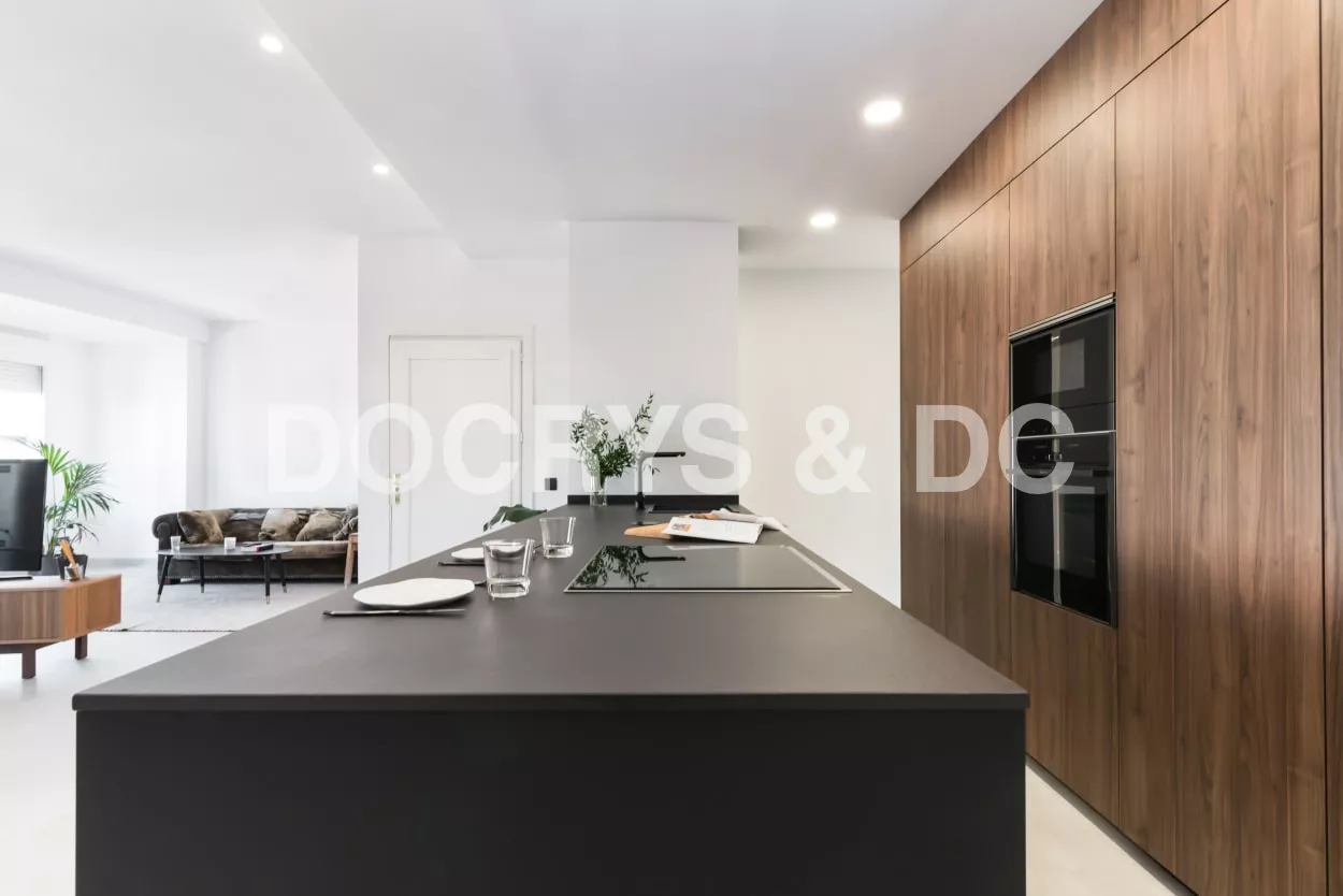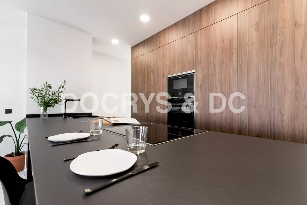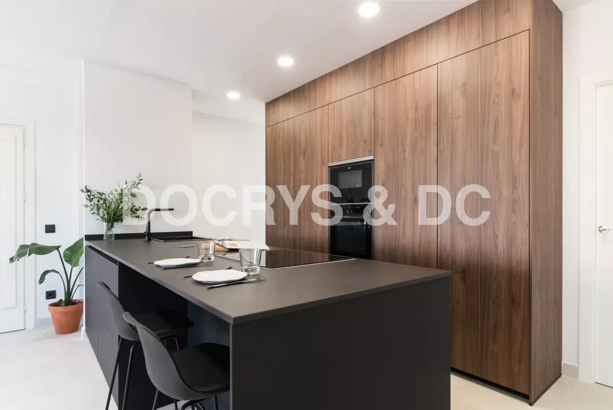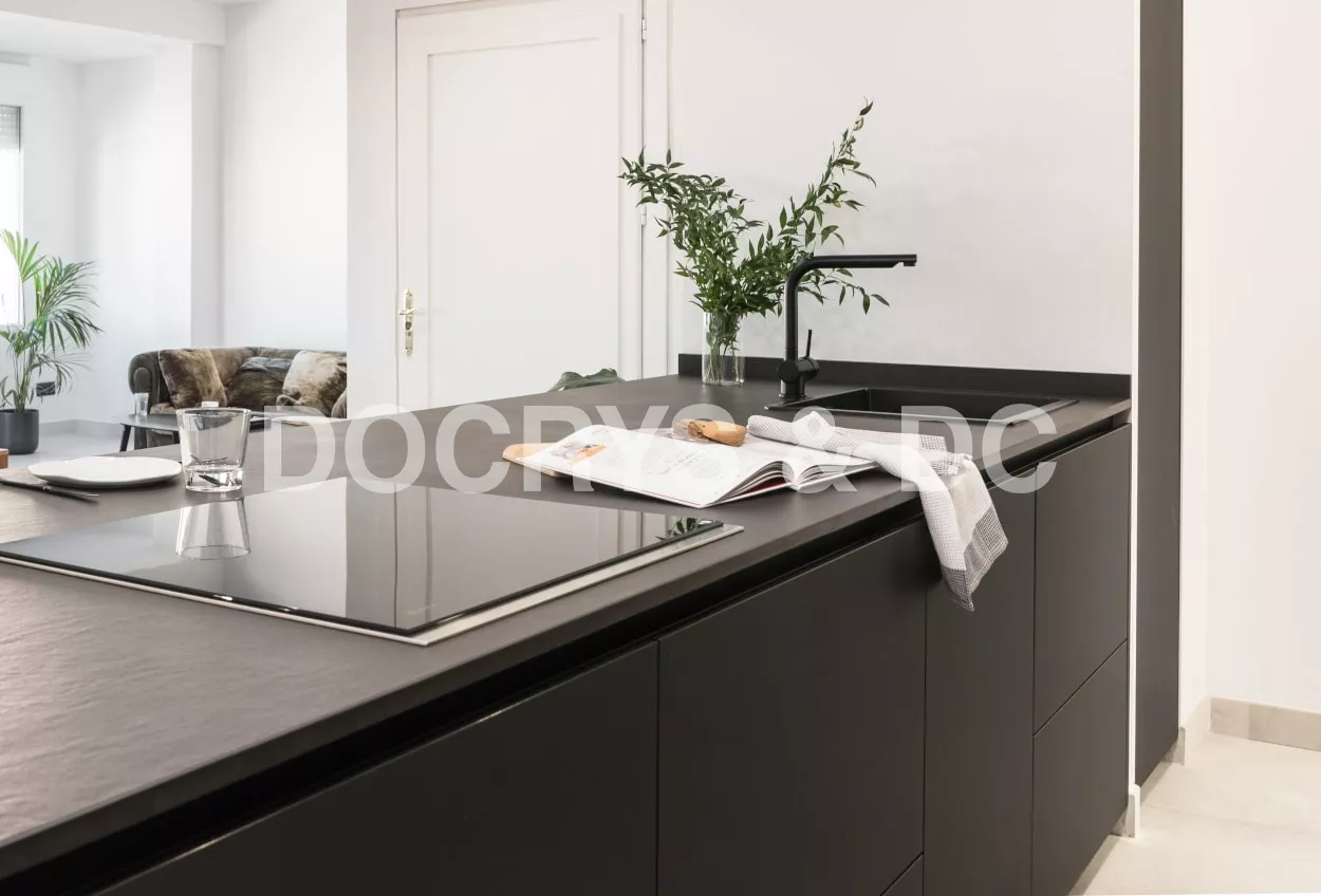 Por otro lado, la isla central, acoge la zona de aguas, la zona de cocción y una barra para dos comensales.
