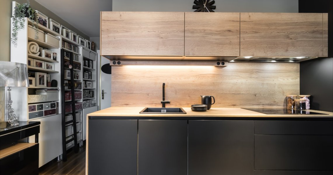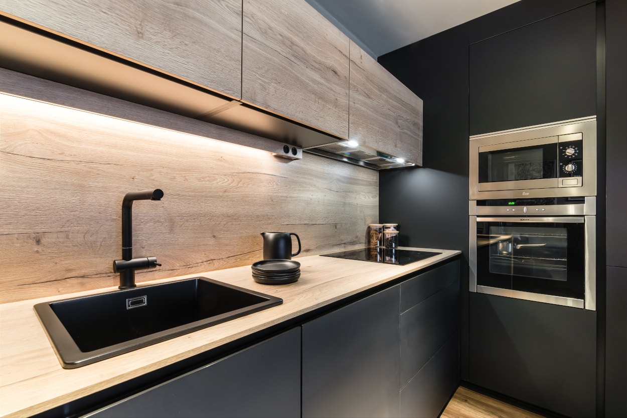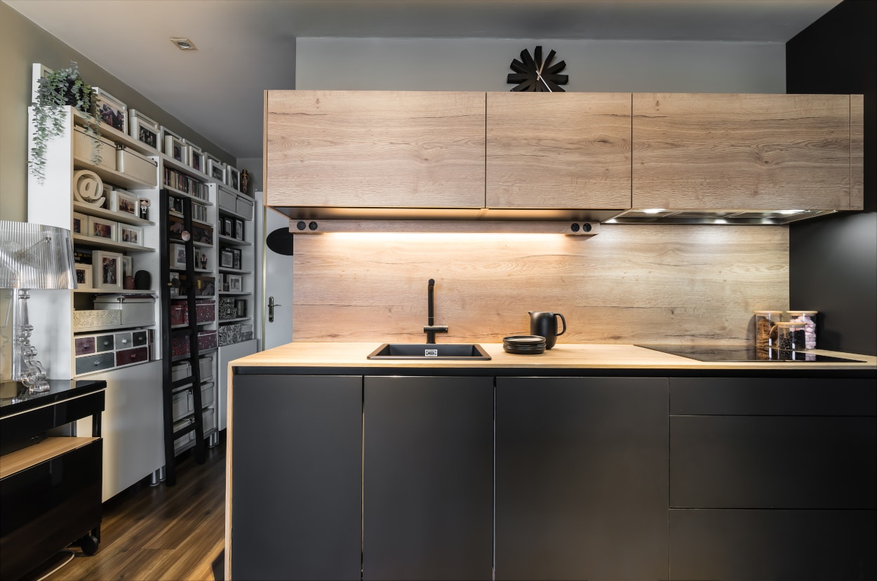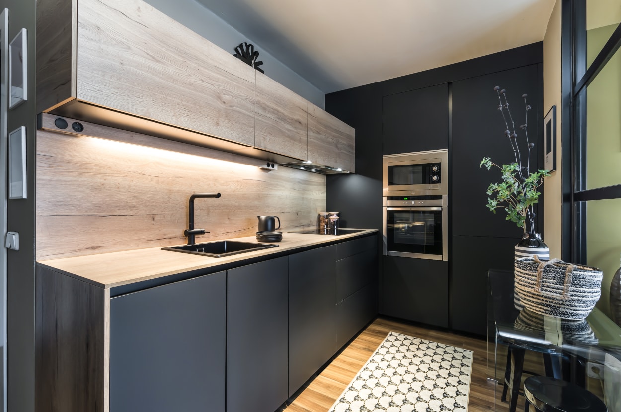 Cocina Santos en color negro seda y roble rústico con material estratificado y encimera de Santos, color roble rústico.