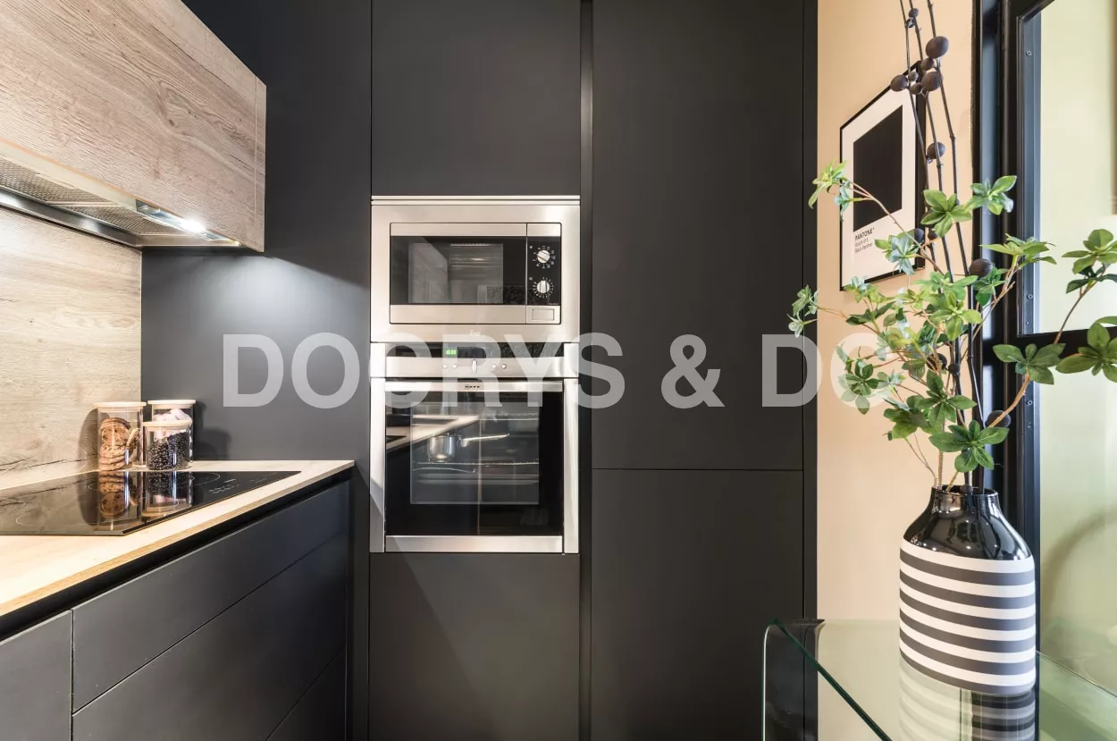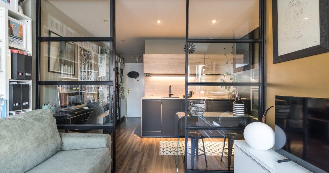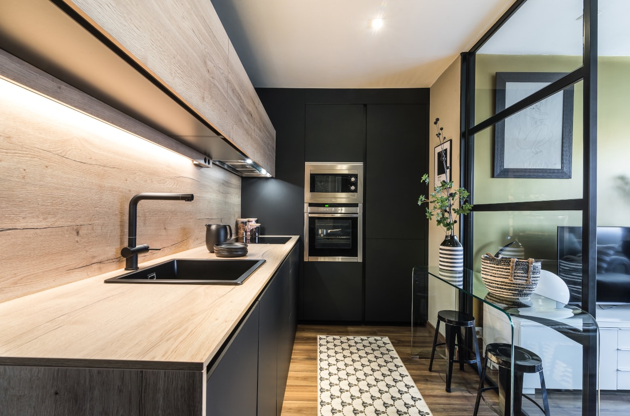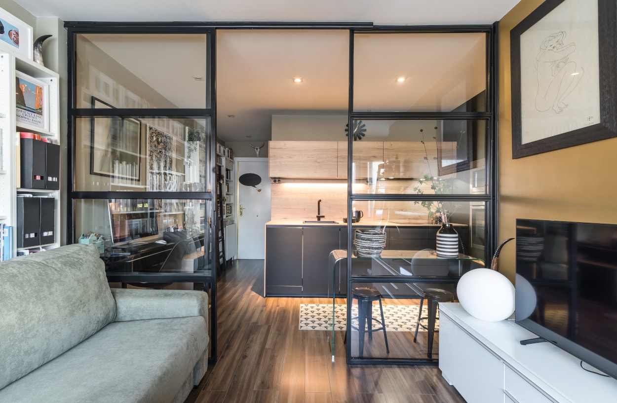 Esta cocina es semi abierta al salón, cuenta con un cerramiento tipo industrial de cristal y aluminio negro, dejando entrar la luminosidad y creando la sensación de amplitud.