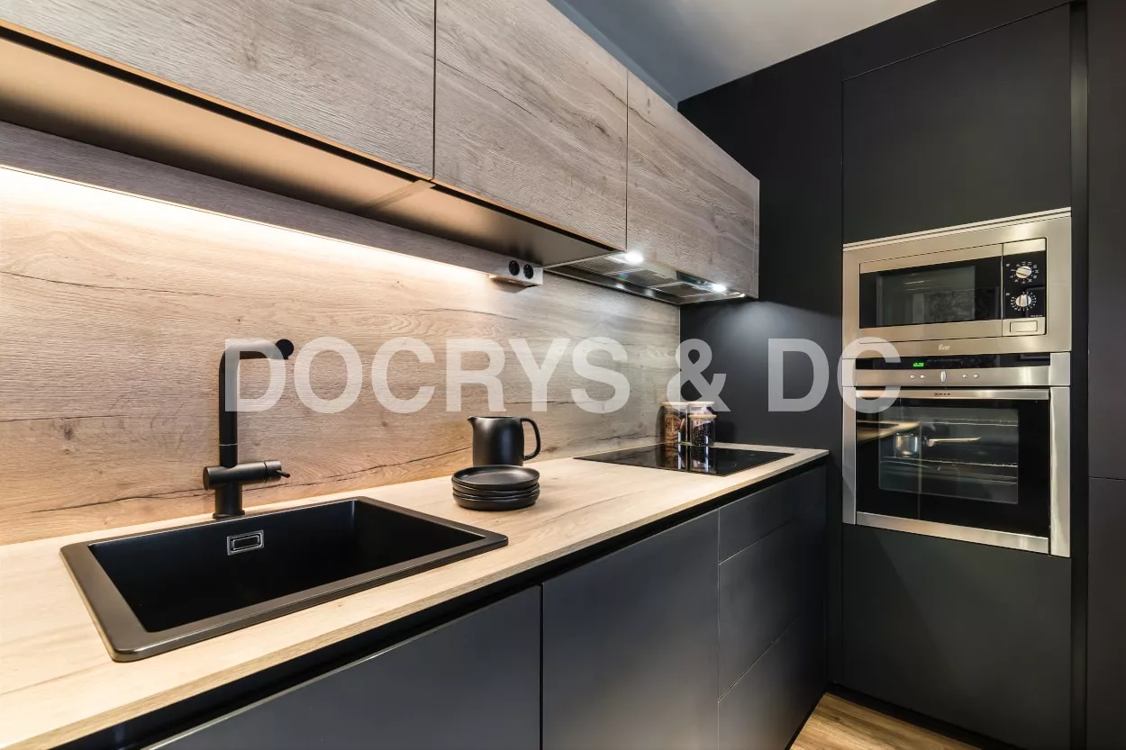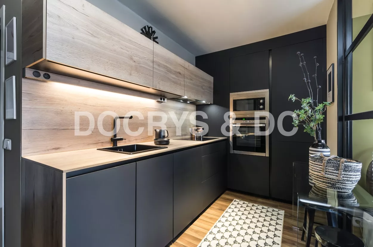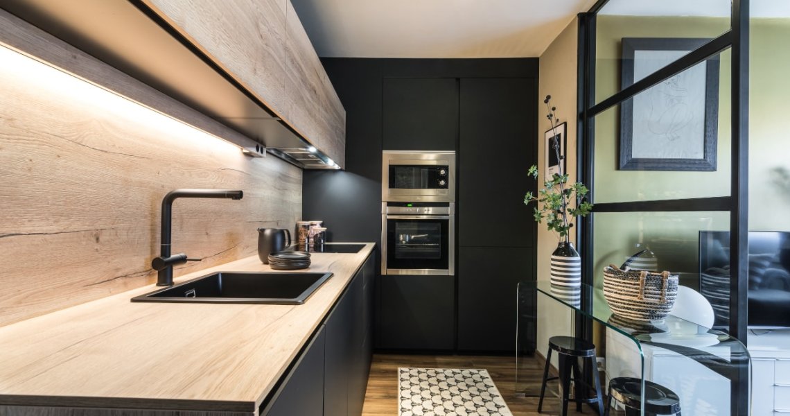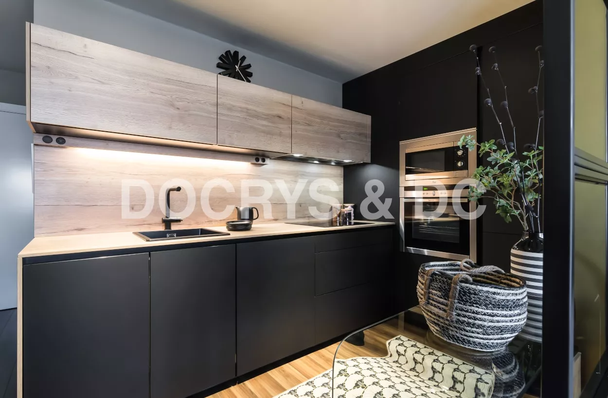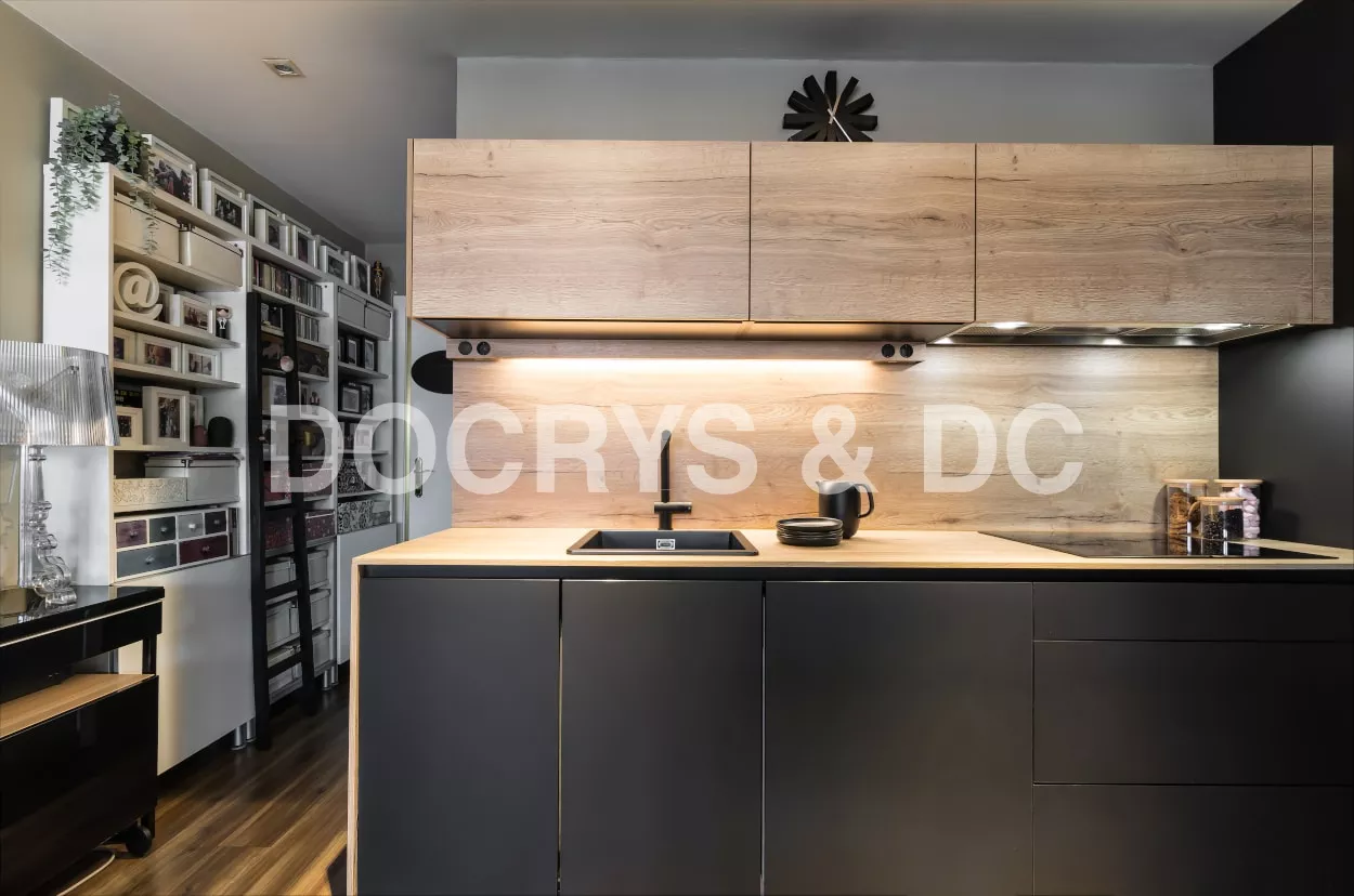 Esta cocina es semi abierta al salón, cuenta con un cerramiento tipo industrial de cristal y aluminio negro, dejando entrar la luminosidad y creando la sensación de amplitud.