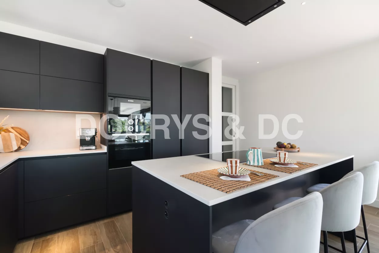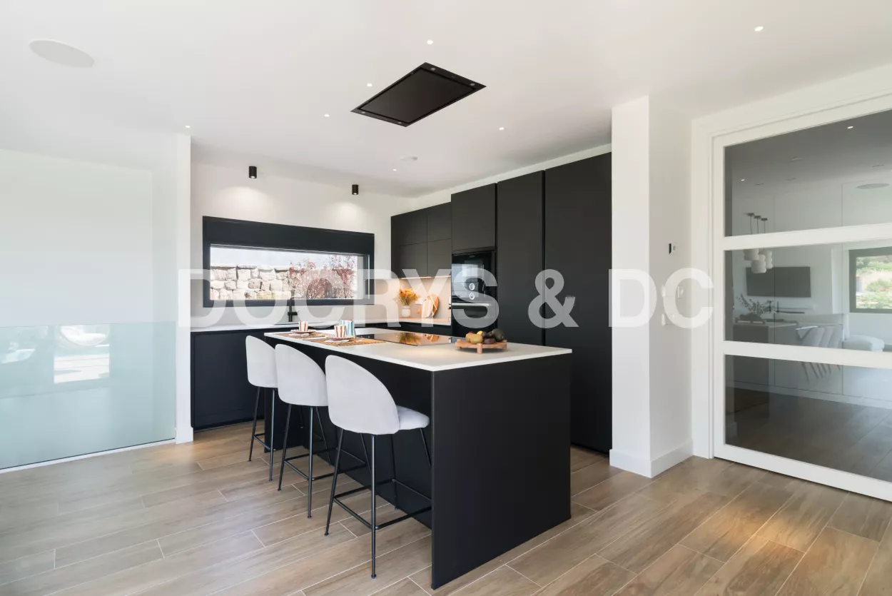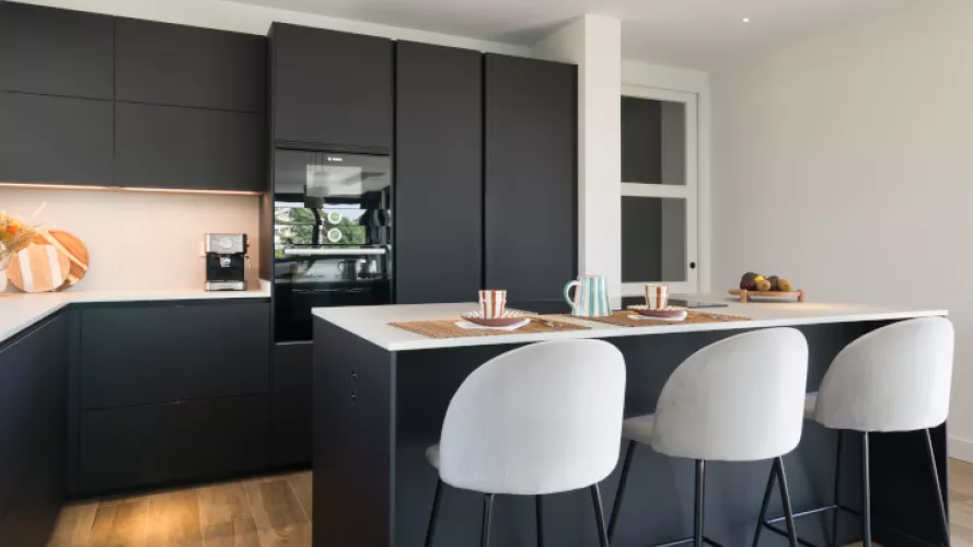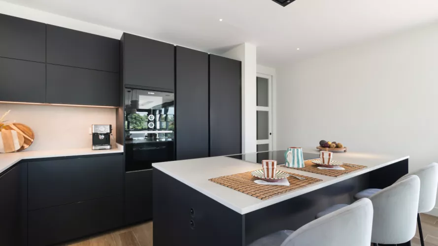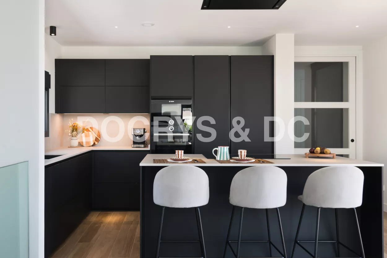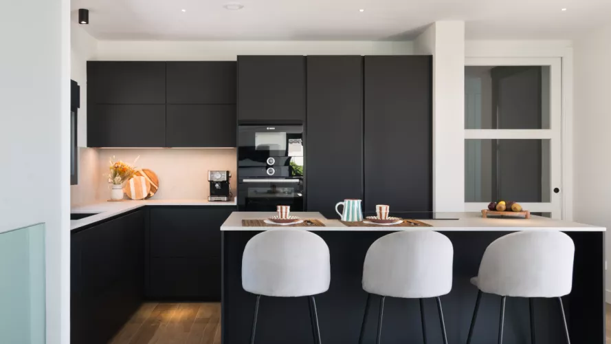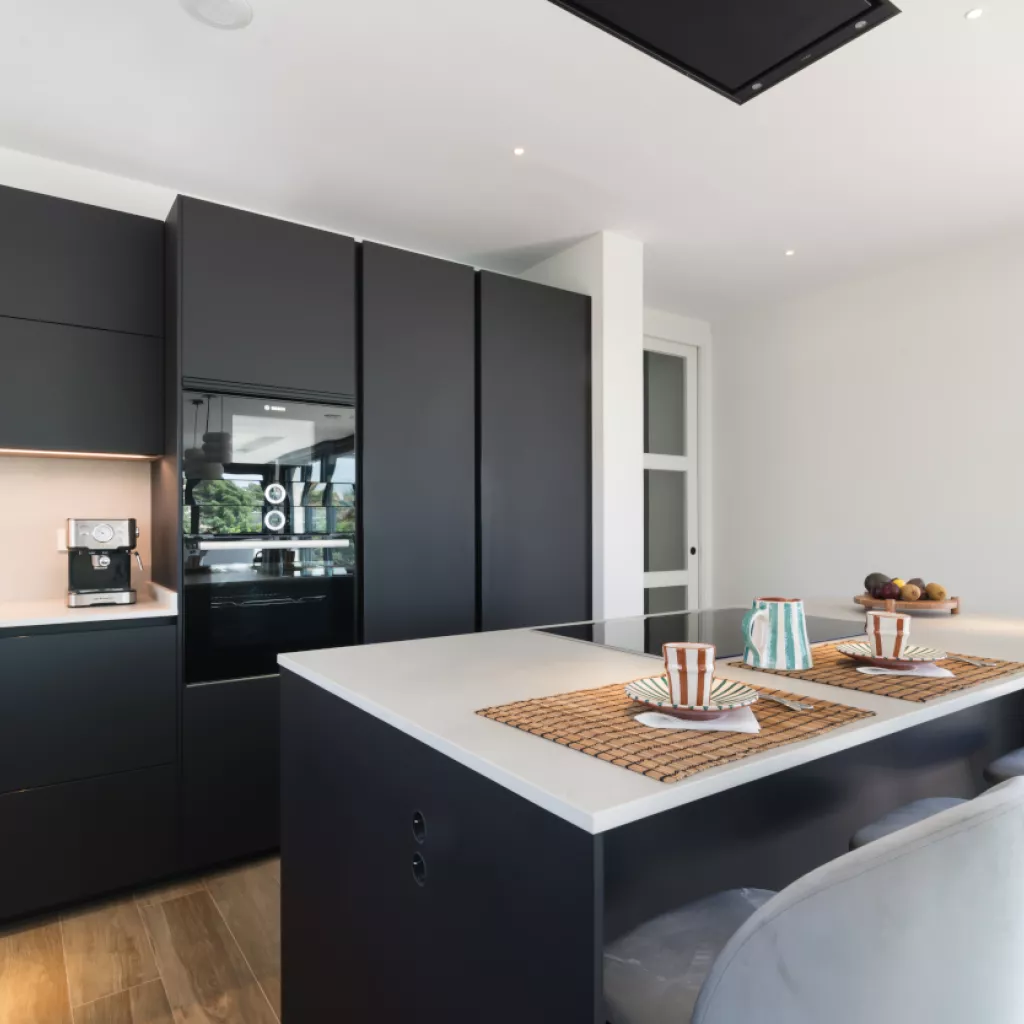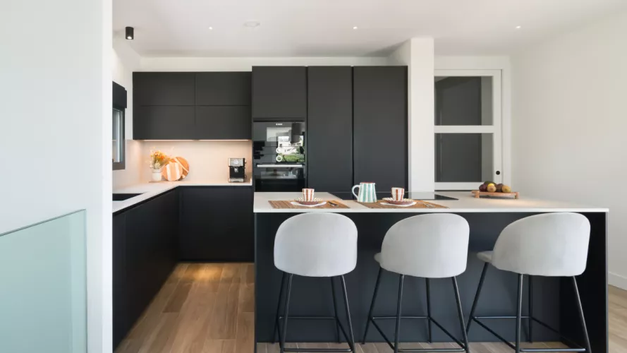 Precioso proyecto de cocina, en este caso en color negro seda con isla en el mismo color abierta al salón que aporta un aspecto moderno. Observamos encimeras blancas que ayudan a dar un contraste de color y luminosidad a la cocina.