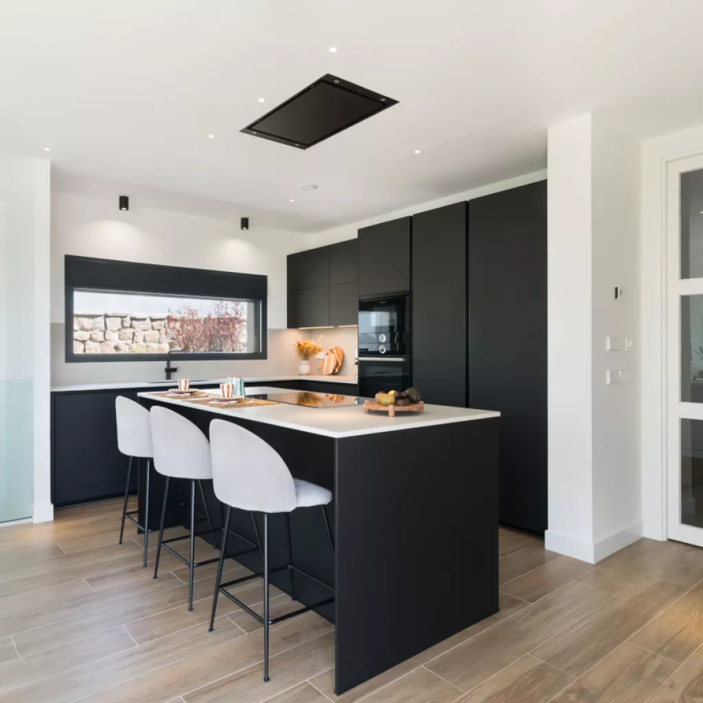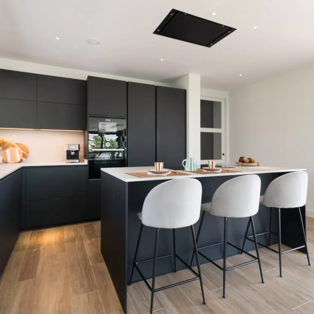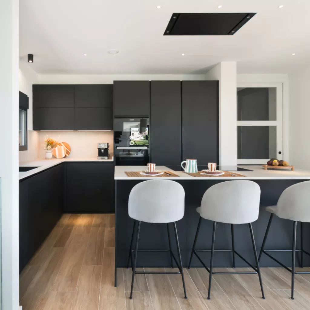 Para finalizar, cuenta con una campana extractora de techo justo encima de la isla, también en color negro para seguir la linea de color. Una forma muy elegante de ocultarla.