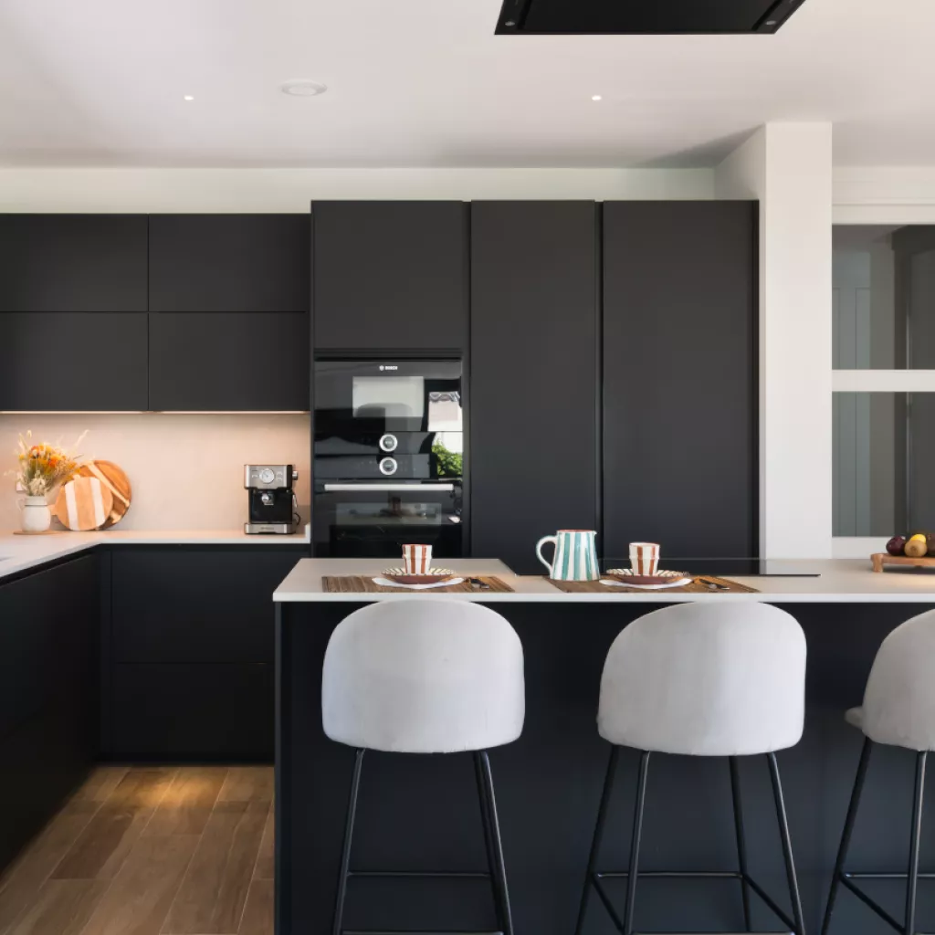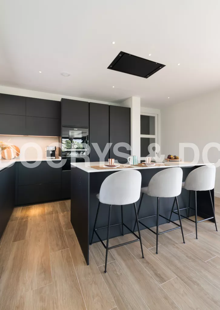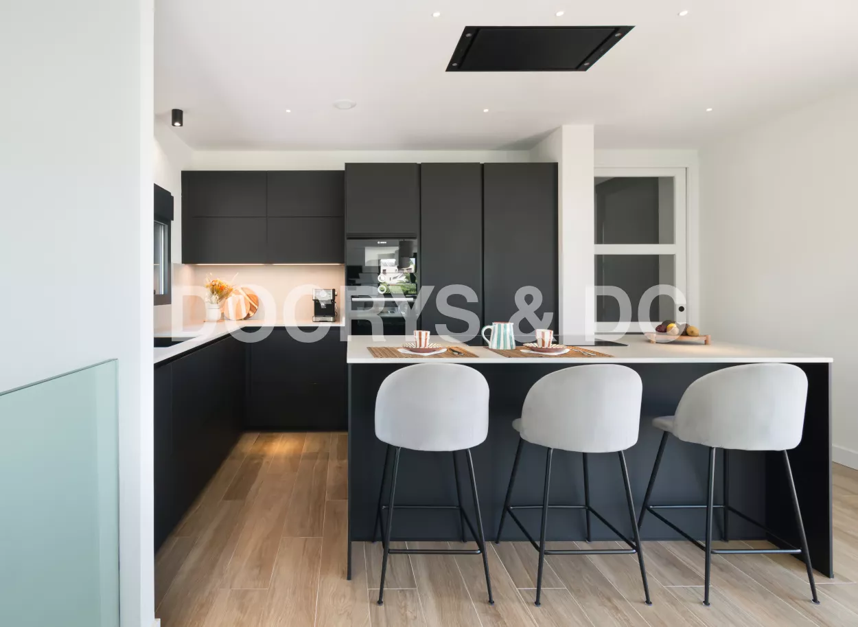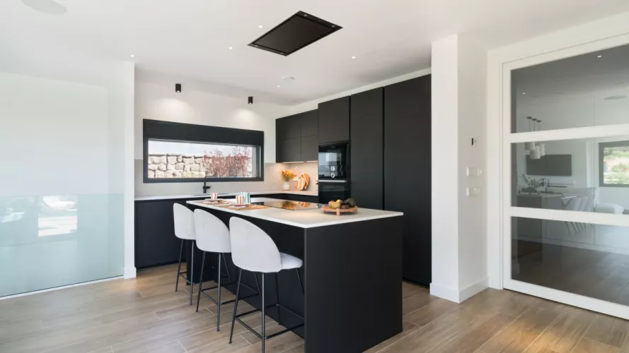 Para finalizar, cuenta con una campana extractora de techo justo encima de la isla, también en color negro para seguir la linea de color. Una forma muy elegante de ocultarla.