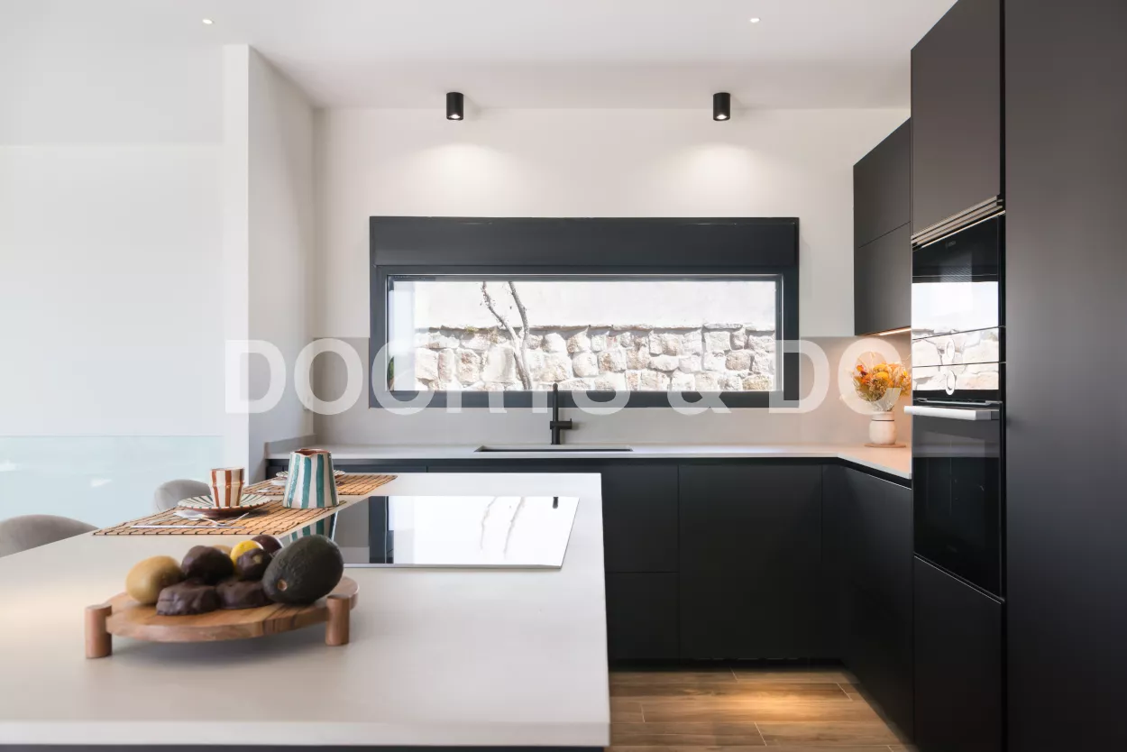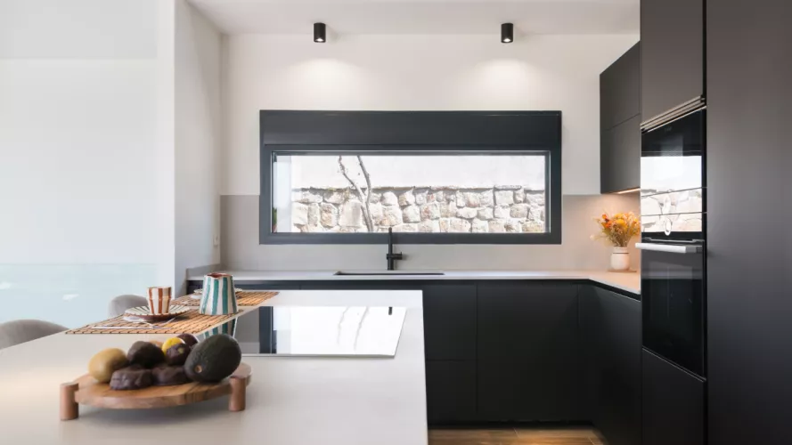 Esta cuenta con una encimera Dekton modelo argentium craftizen de acabado liso que replica el estuco de cal gris con un paleteado dinámico. También goza de muebles push para continuar con el aspecto limpio que se pretende conseguir evitando los tiradores, eliminando así el ruido visual.
