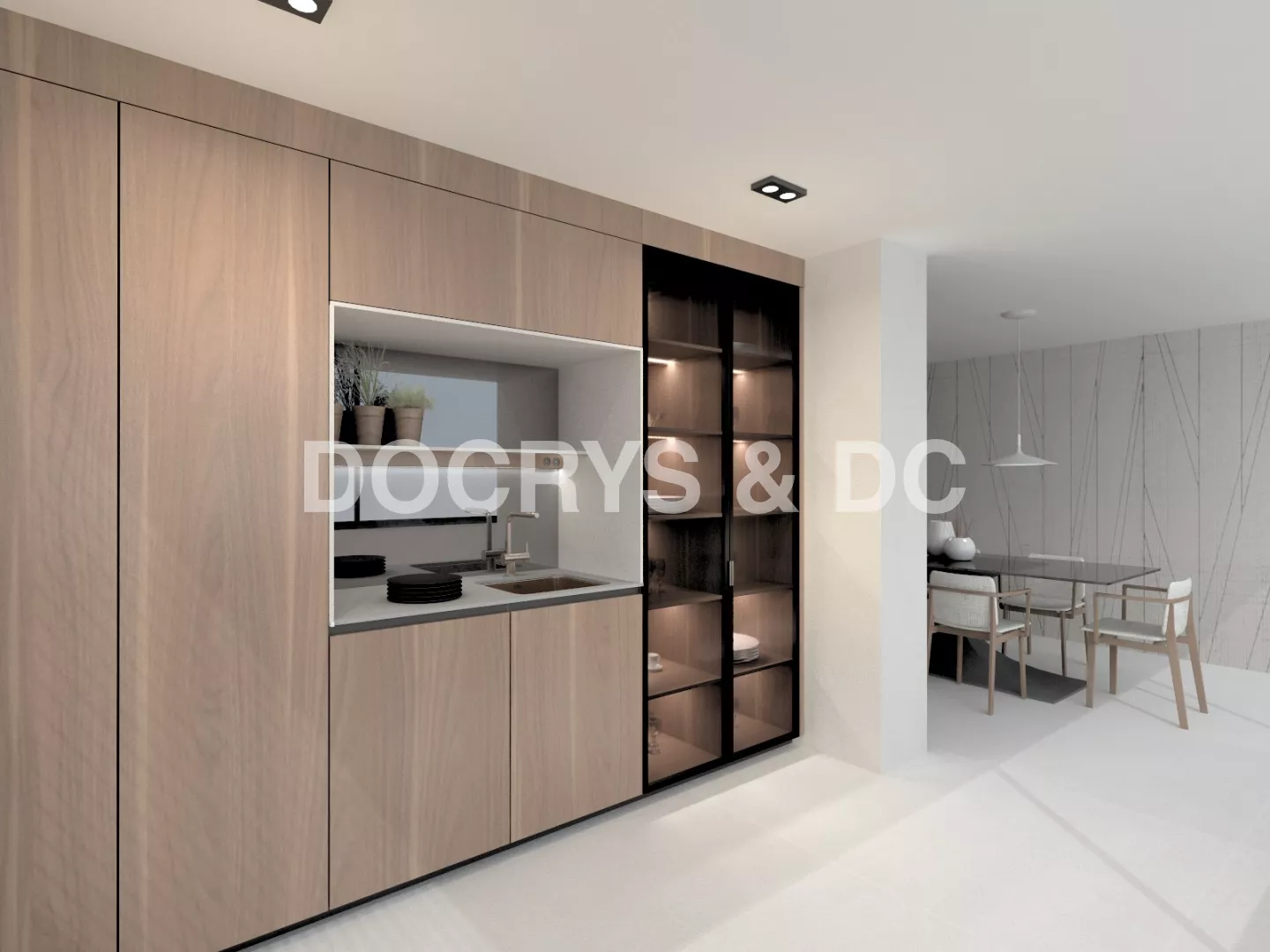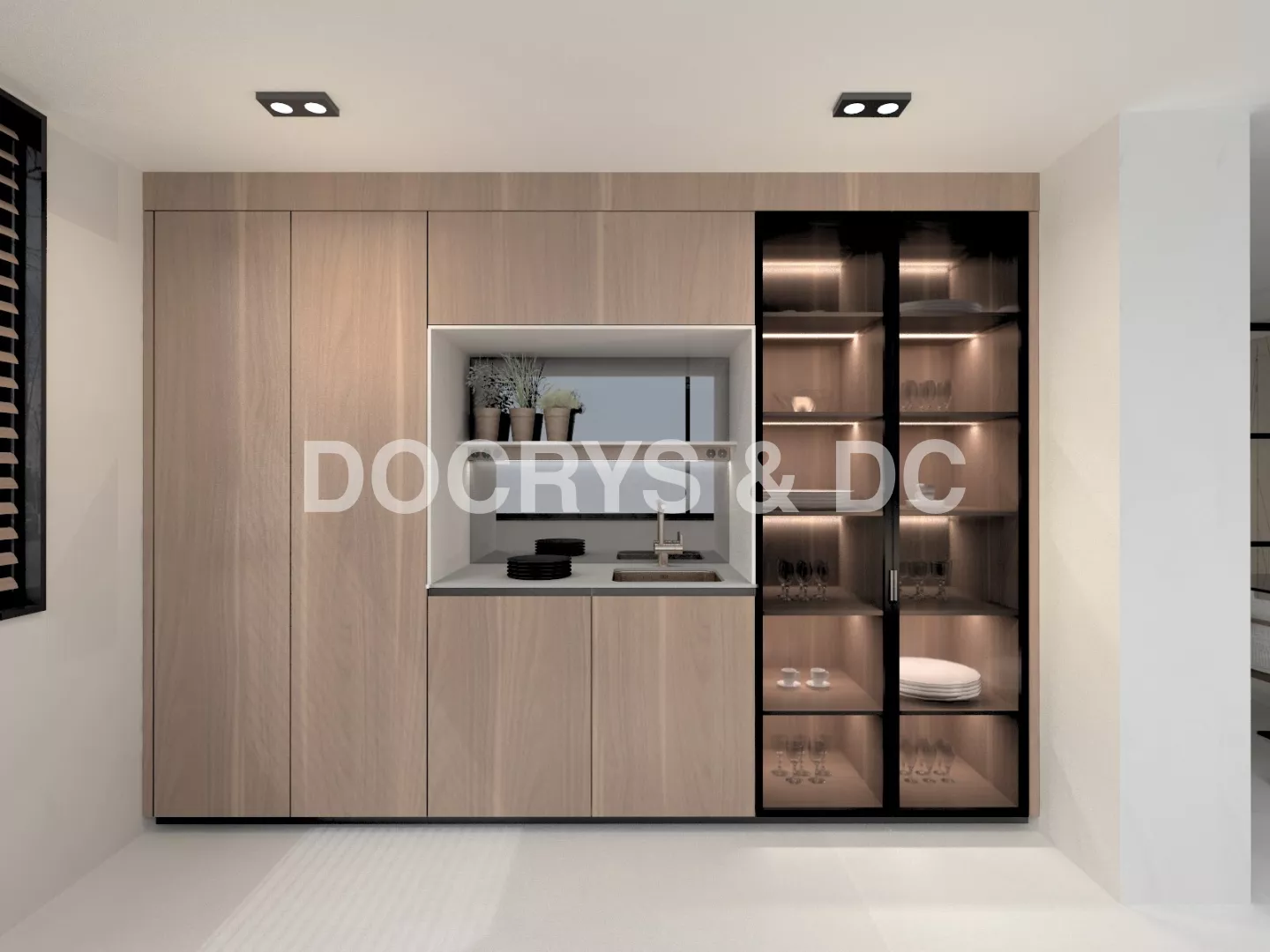 El diseño de esta cocina moderna cuenta con un frente compuesto por varias columnas y muebles bajos, donde se ubican los electrodomésticos y la zona de aguas.