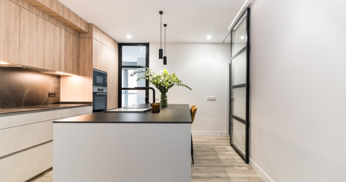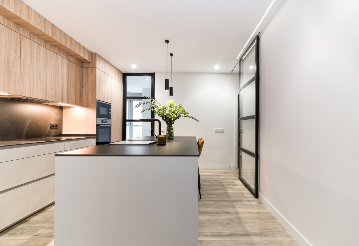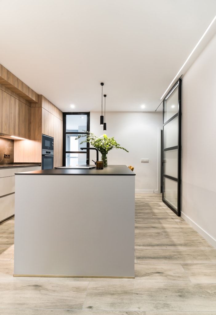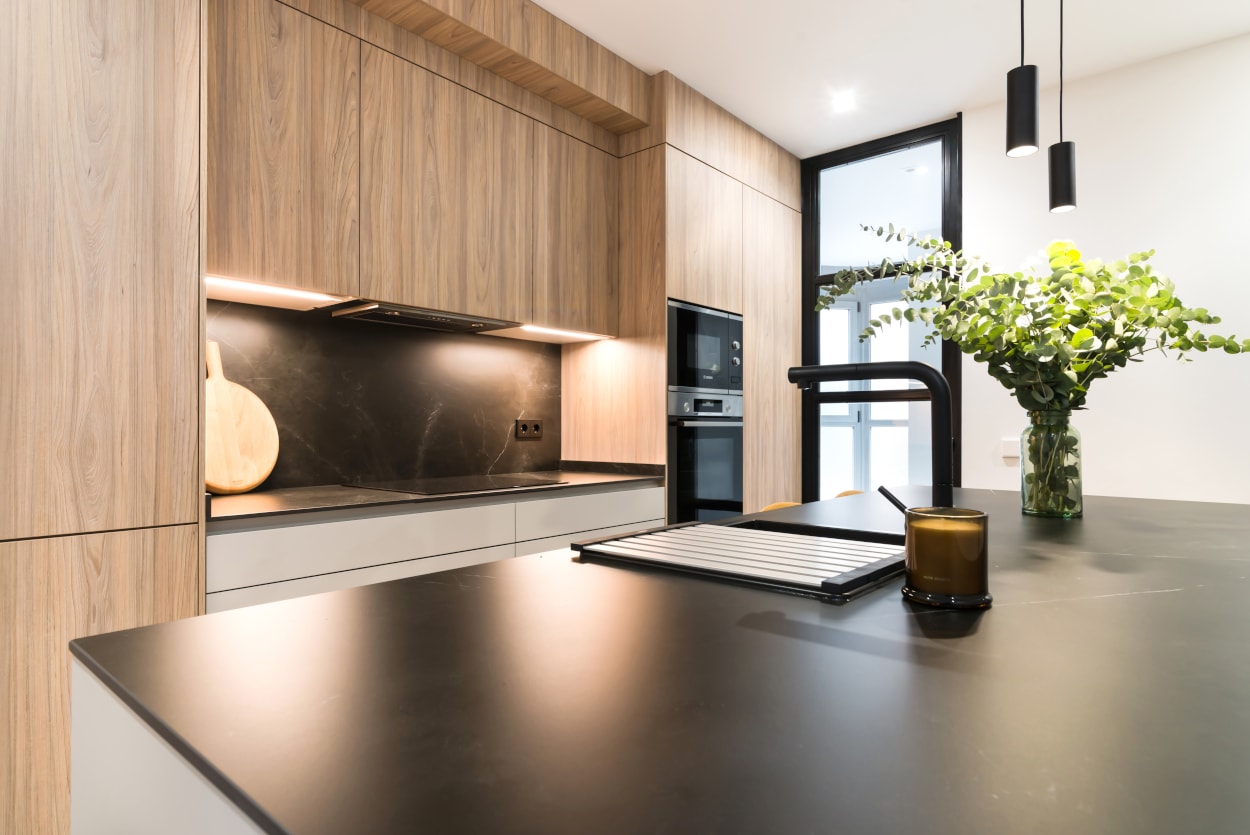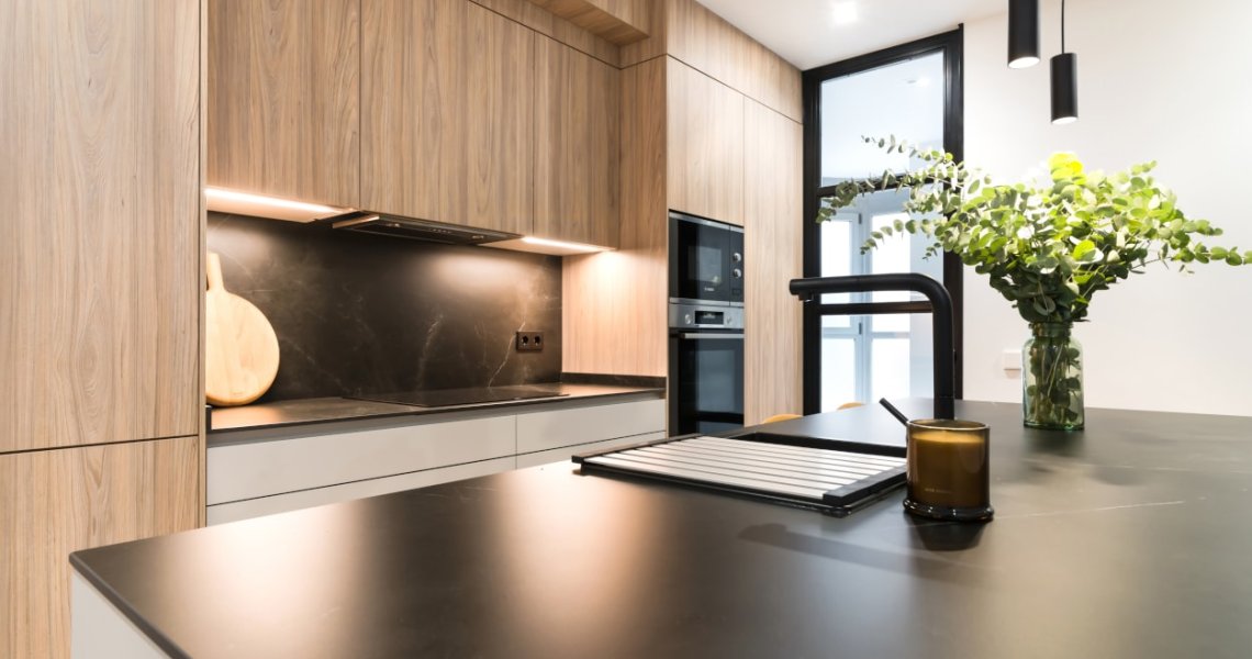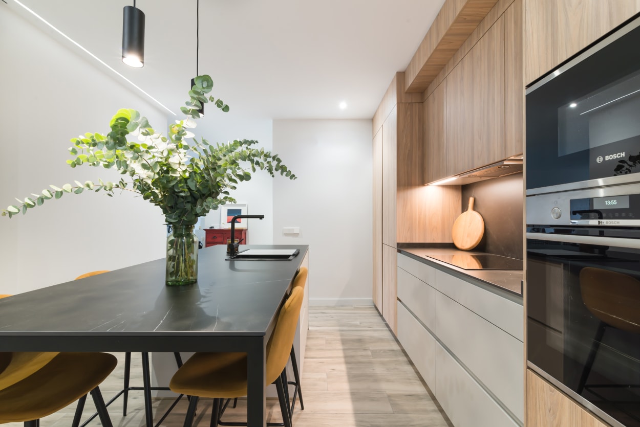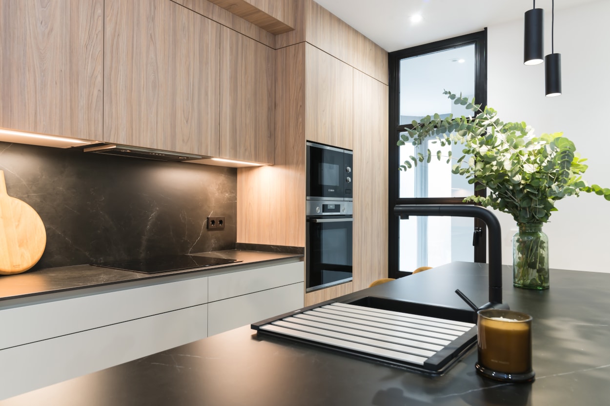 La combinación del color de los muebles y la encimera, generan un espacio elegante, moderno y de diseño, siendo el núcleo principal de la vivienda.