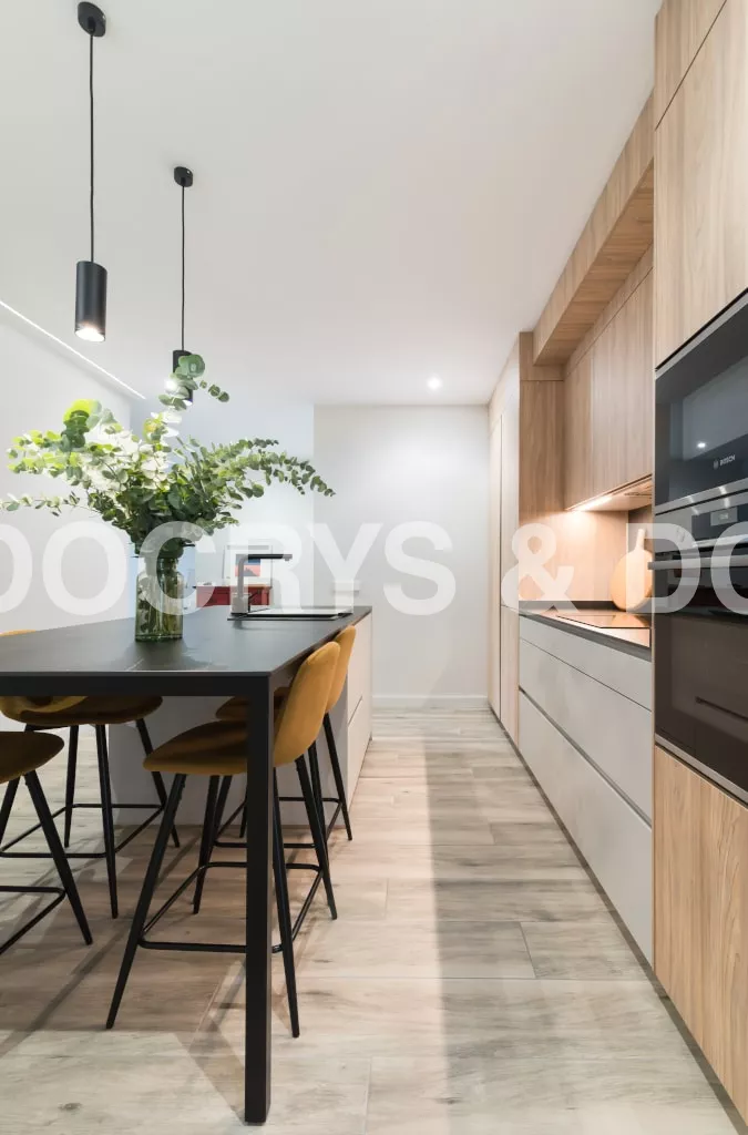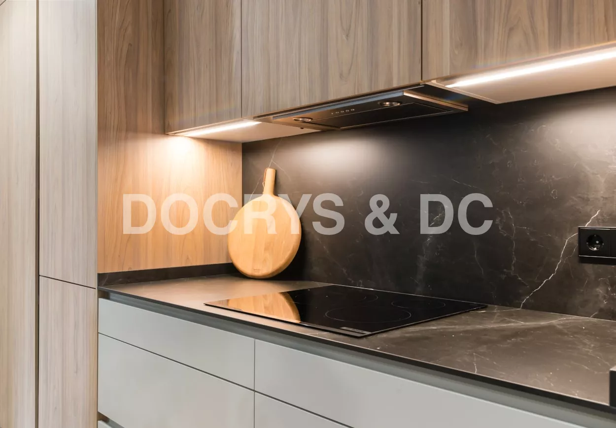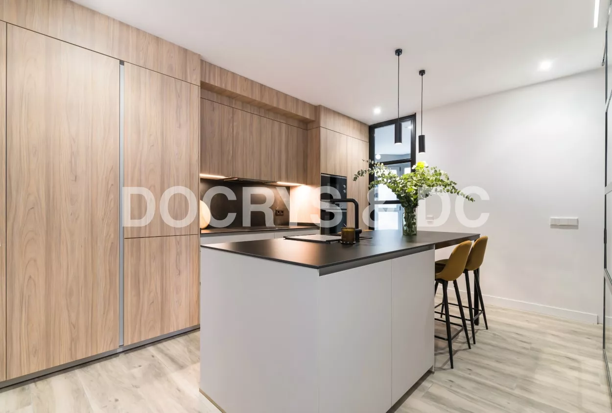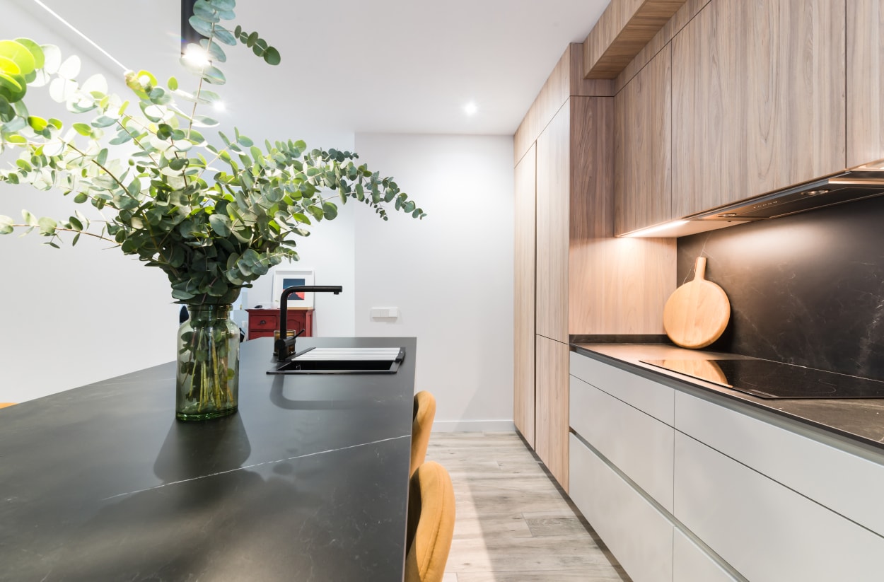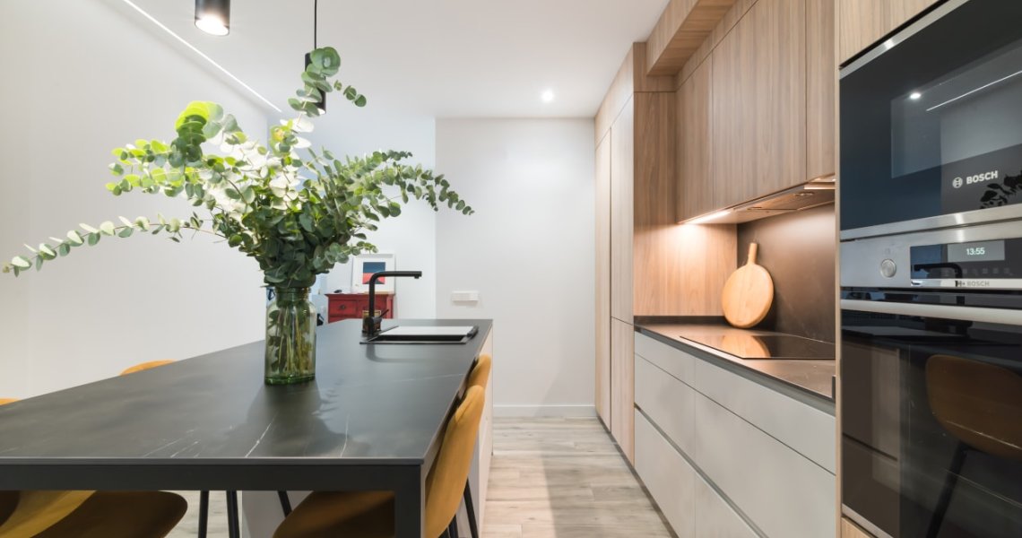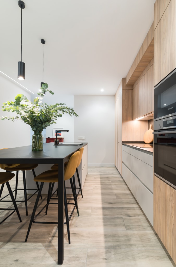 El diseño de esta cocina en color gris bruma y olmo claro, se fusiona con la decoración del resto de la vivienda, creando un abierto elegante y de diseño.
