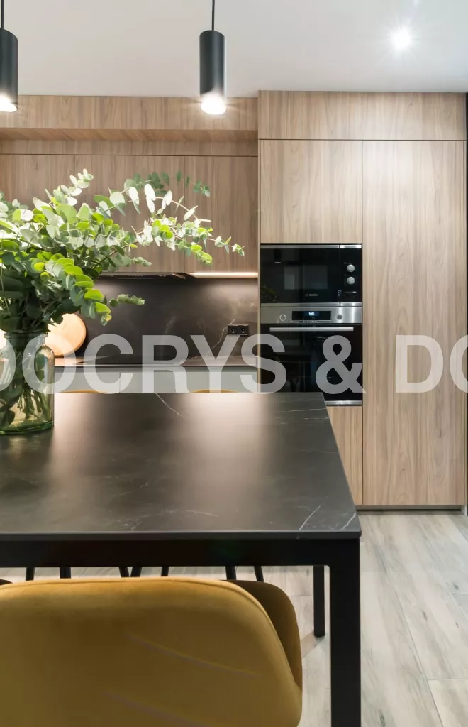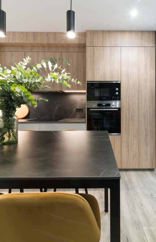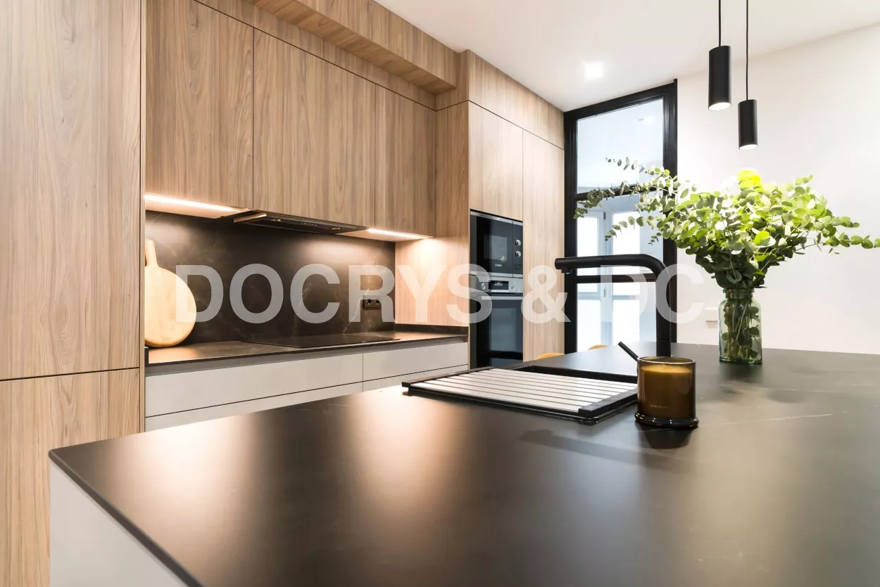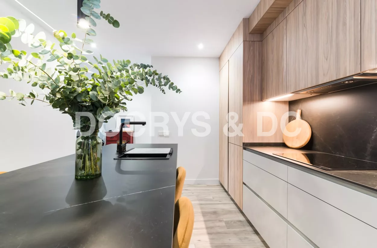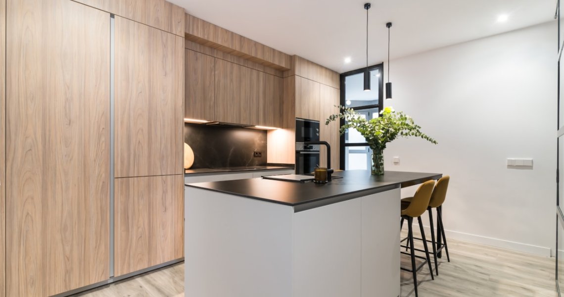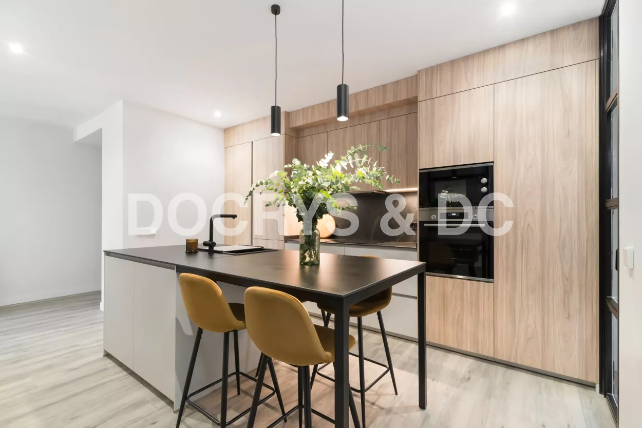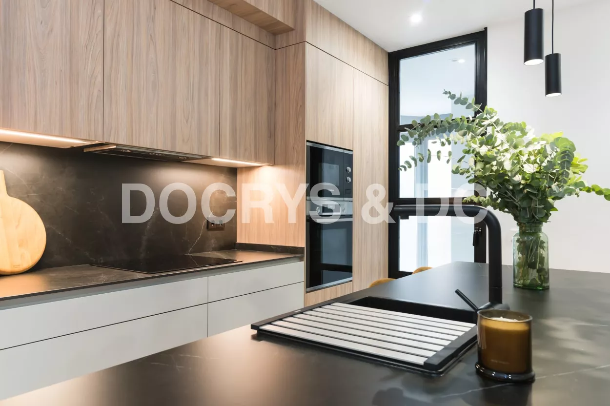 El diseño de esta cocina en color gris bruma y olmo claro, se fusiona con la decoración del resto de la vivienda, creando un abierto elegante y de diseño.