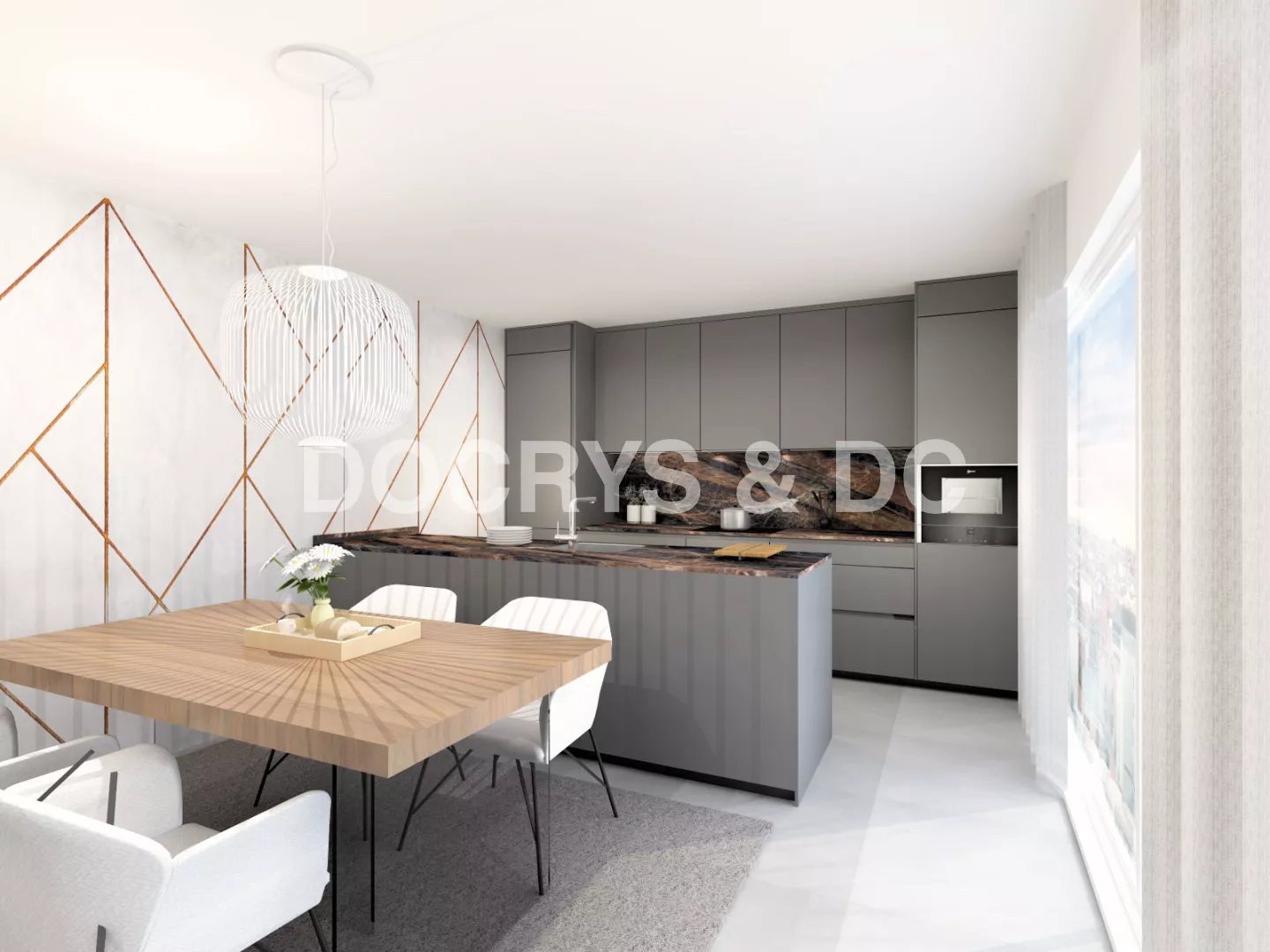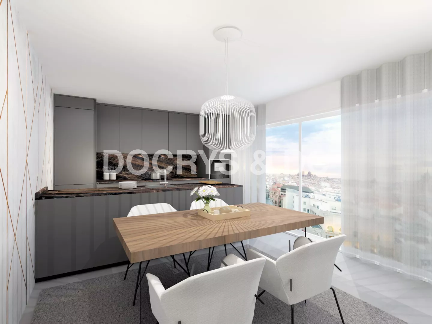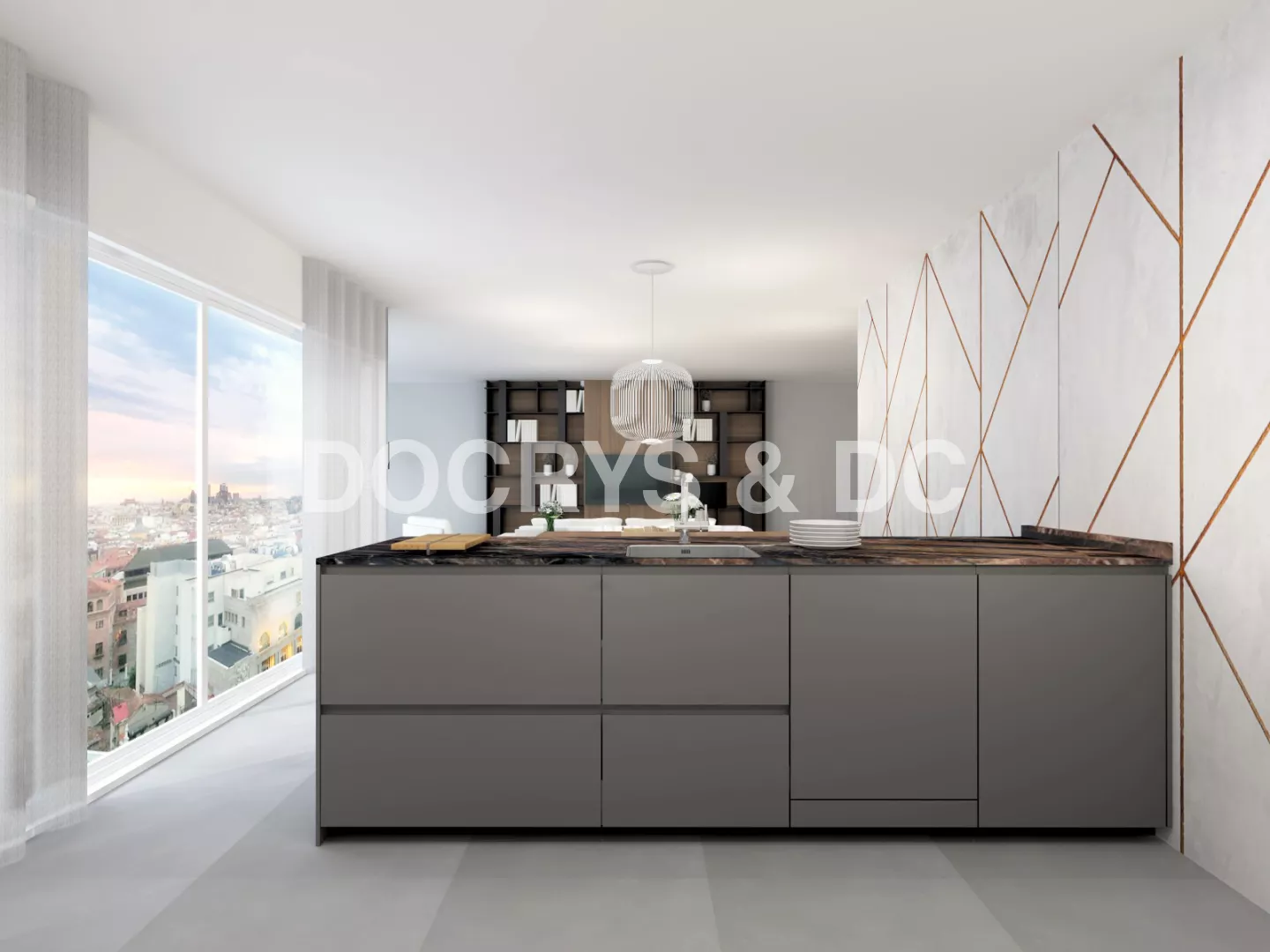 Cocina Santos de color Gris antracita con material laminado en seda mate y antihuellas. El diseño de esta cocina moderna cuenta con un frente donde se ubica la zona de cocción y con una isla para zona de aguas. Tambien hemos puesta una pequeña zona de office con una mesa rectangular de madera e iluminación de foscarini. En este diseño de cocina Santos, hemos querido jugar con los colores, poniendo un papel pintado de Glamora.