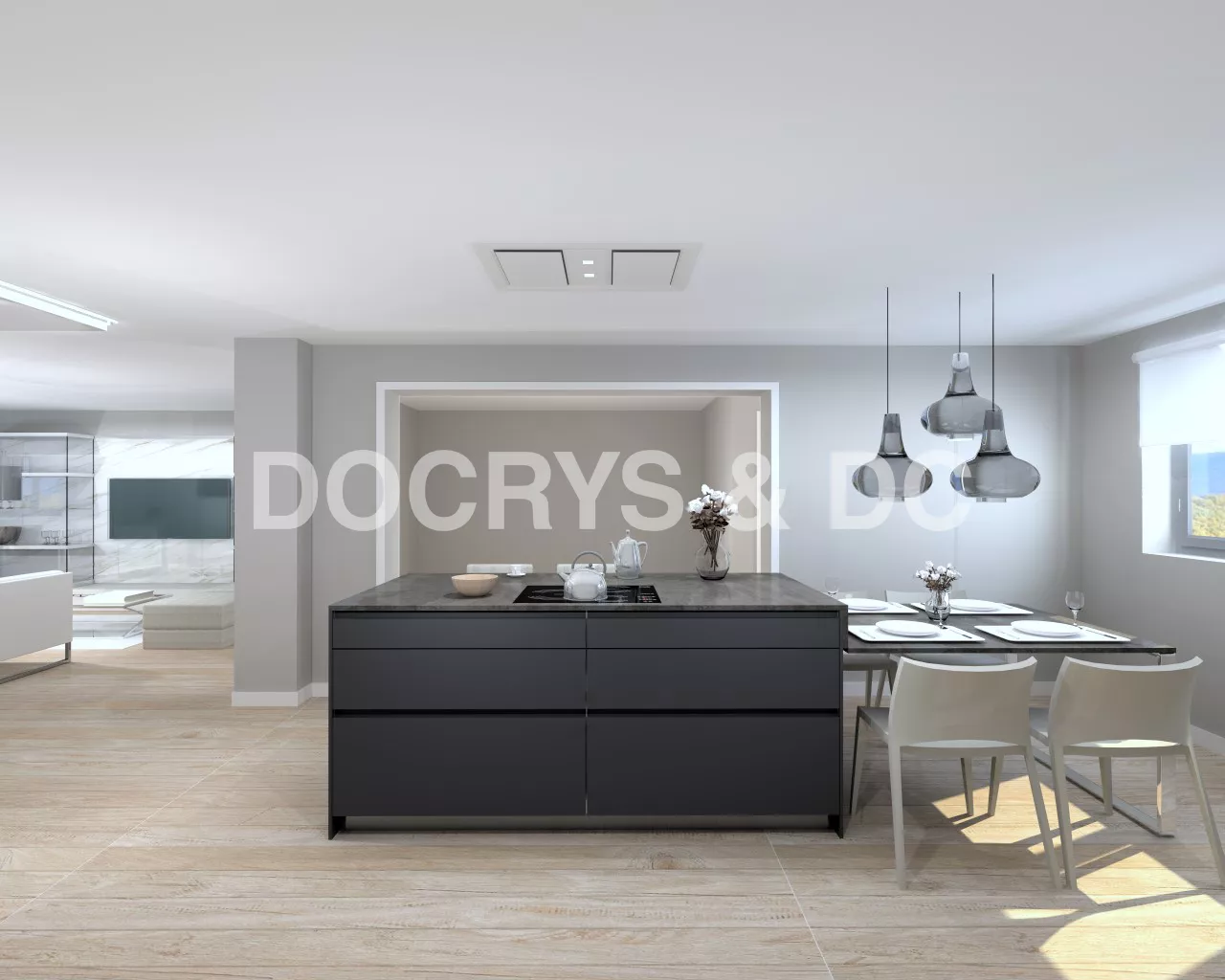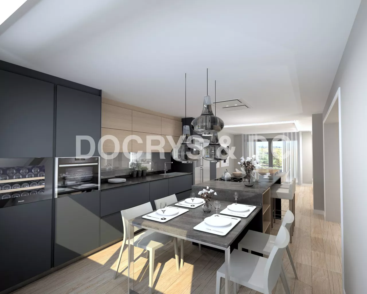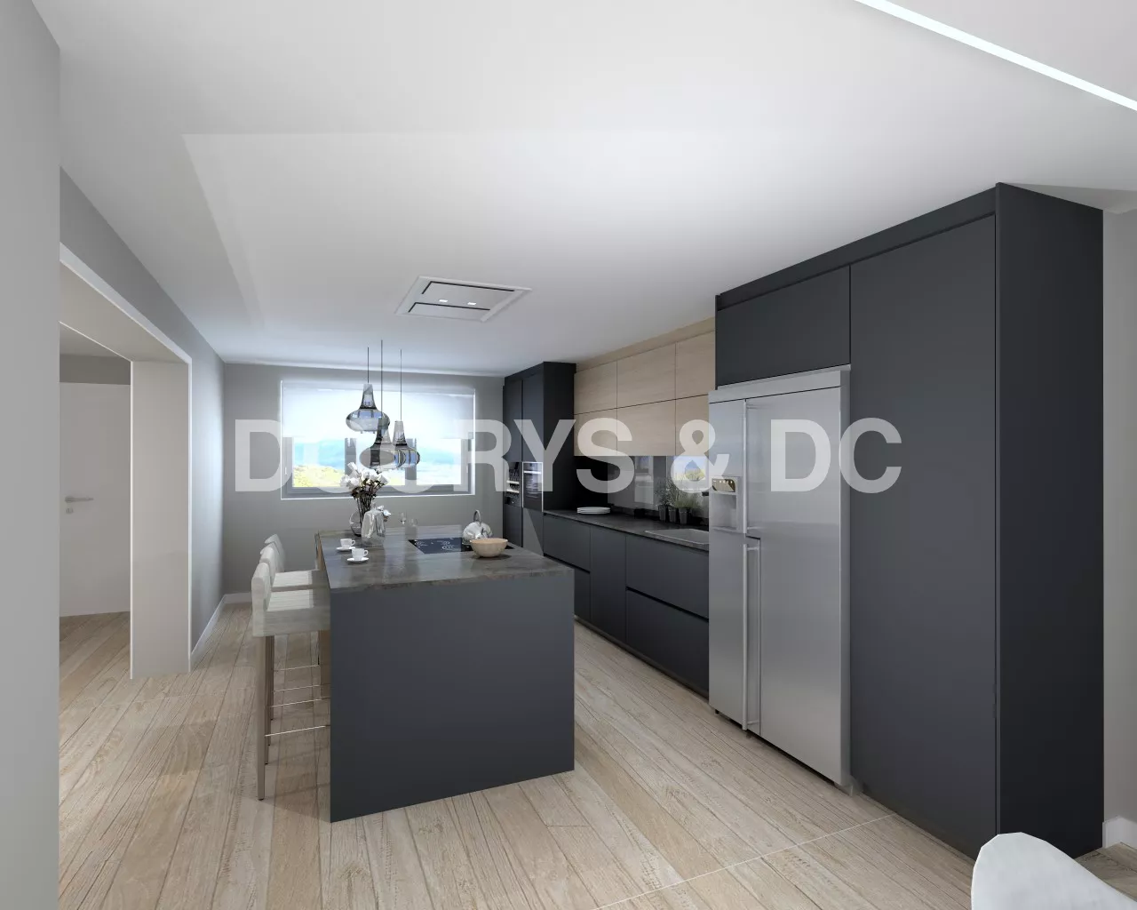 Cocina Santos: plataforma D. Laminado antihuellas negro con altos laminado olmo claro.