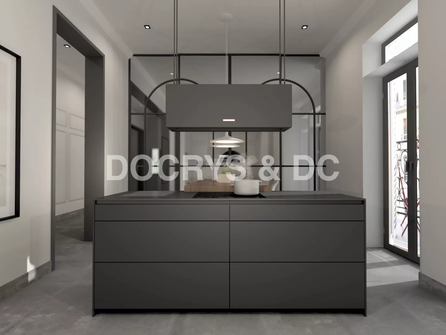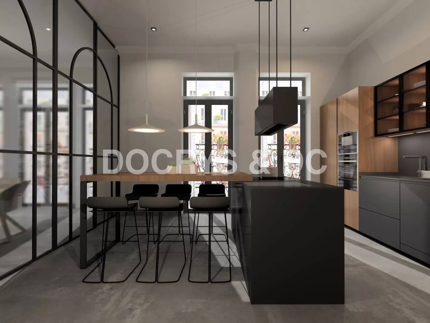 Cocina Santos en color Negro seda lah y nogal con material estratificado. Encimera de Dekton, color Sirius, acabado texturizado.