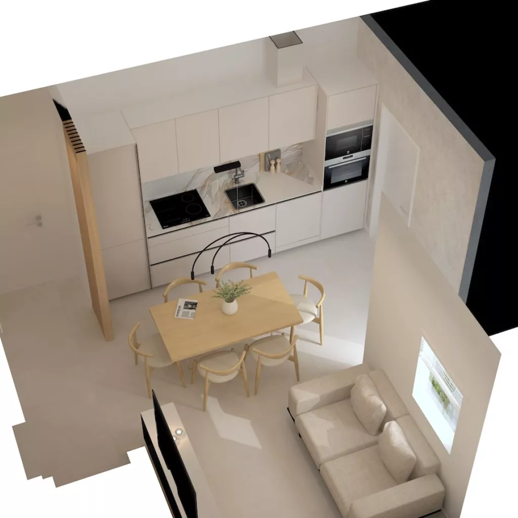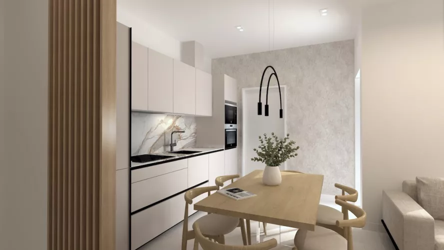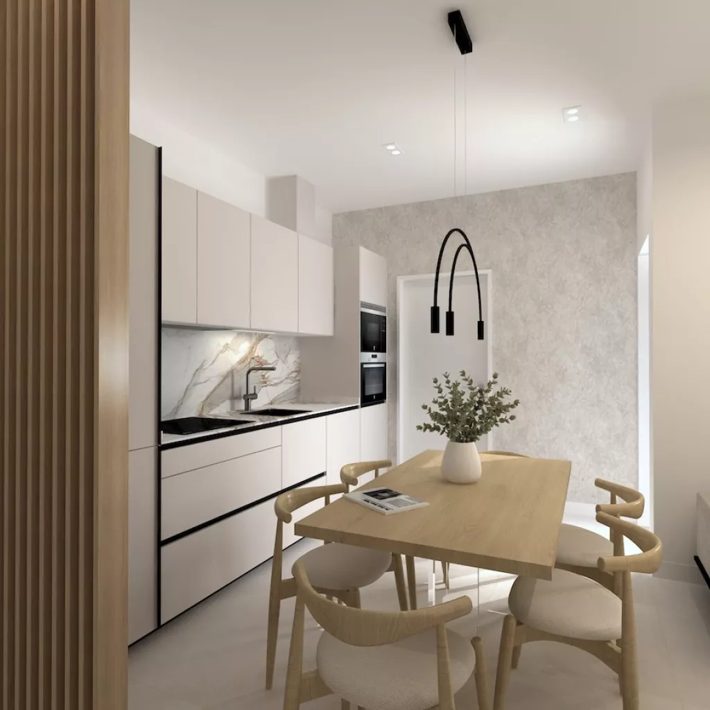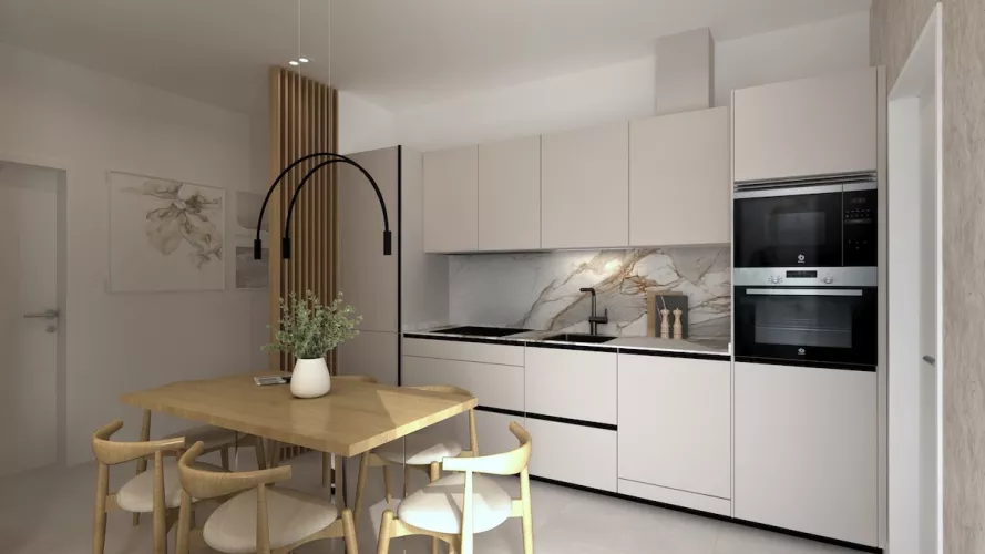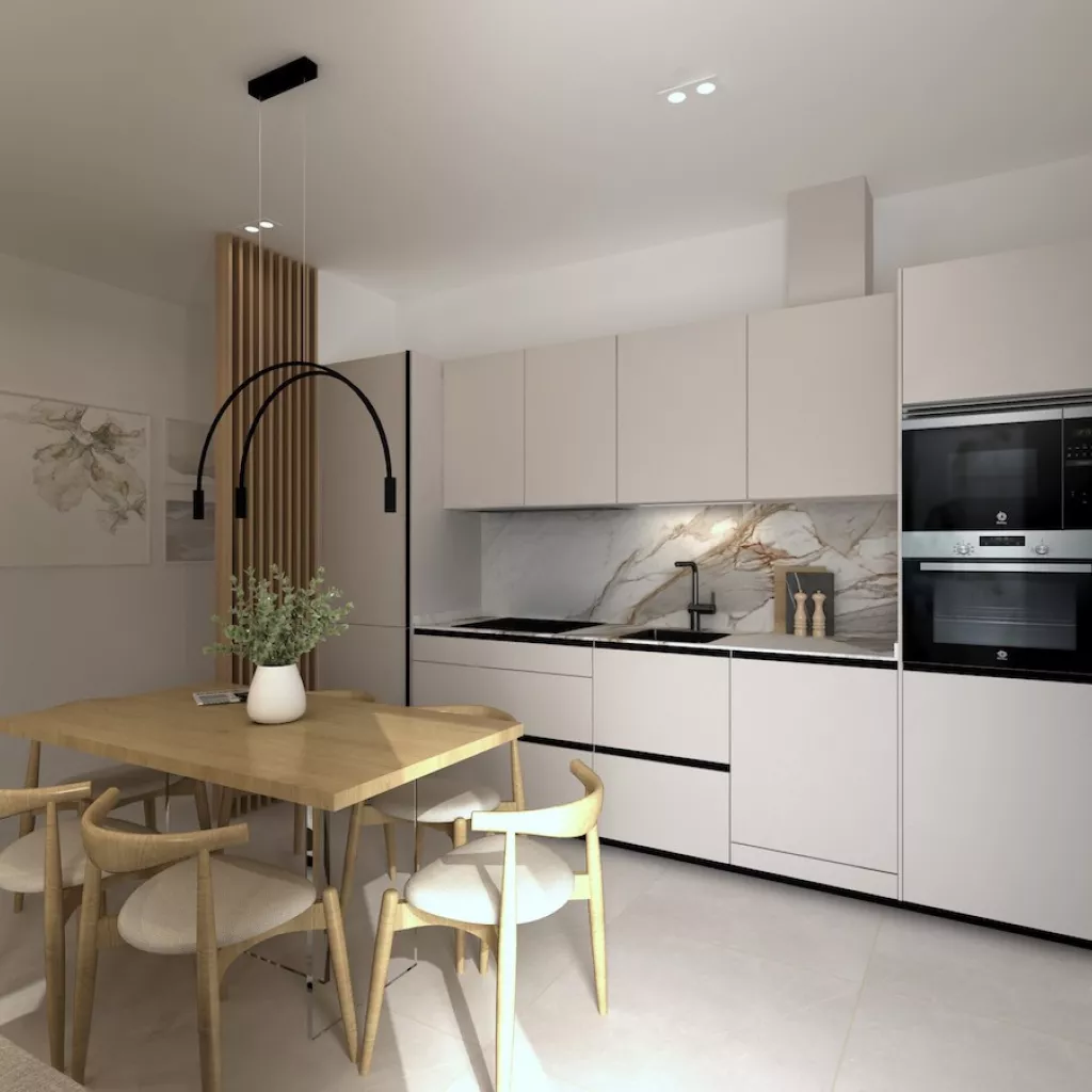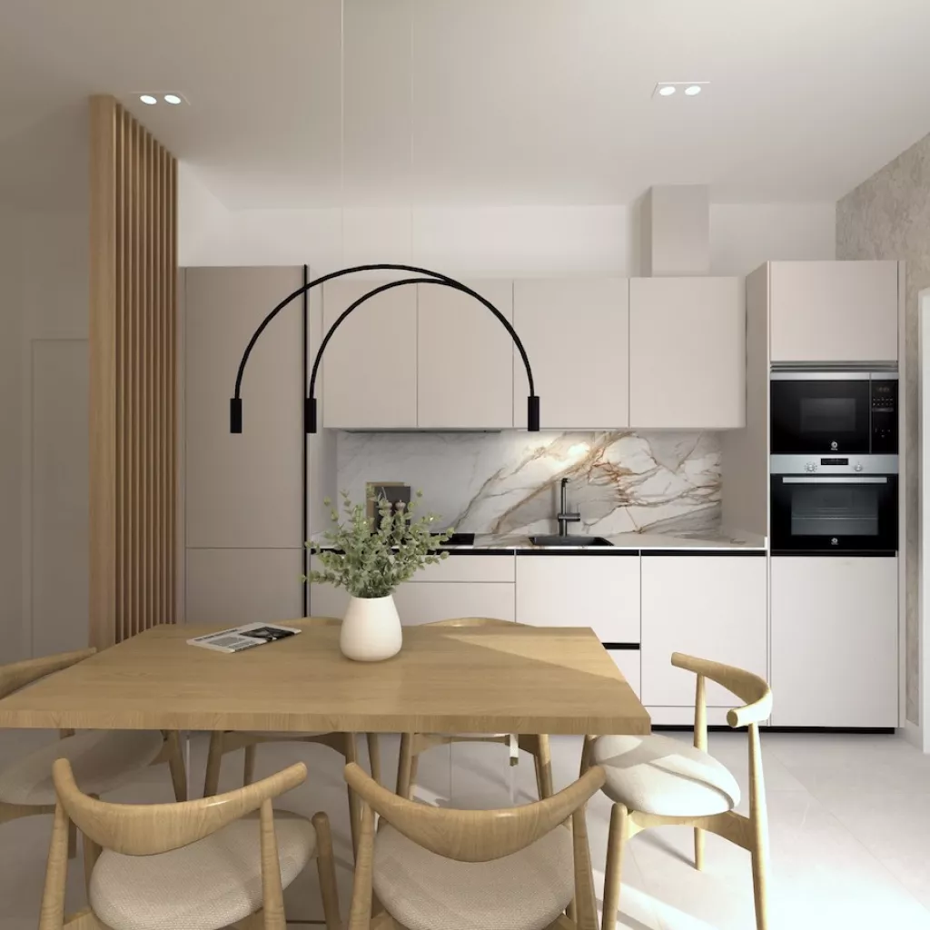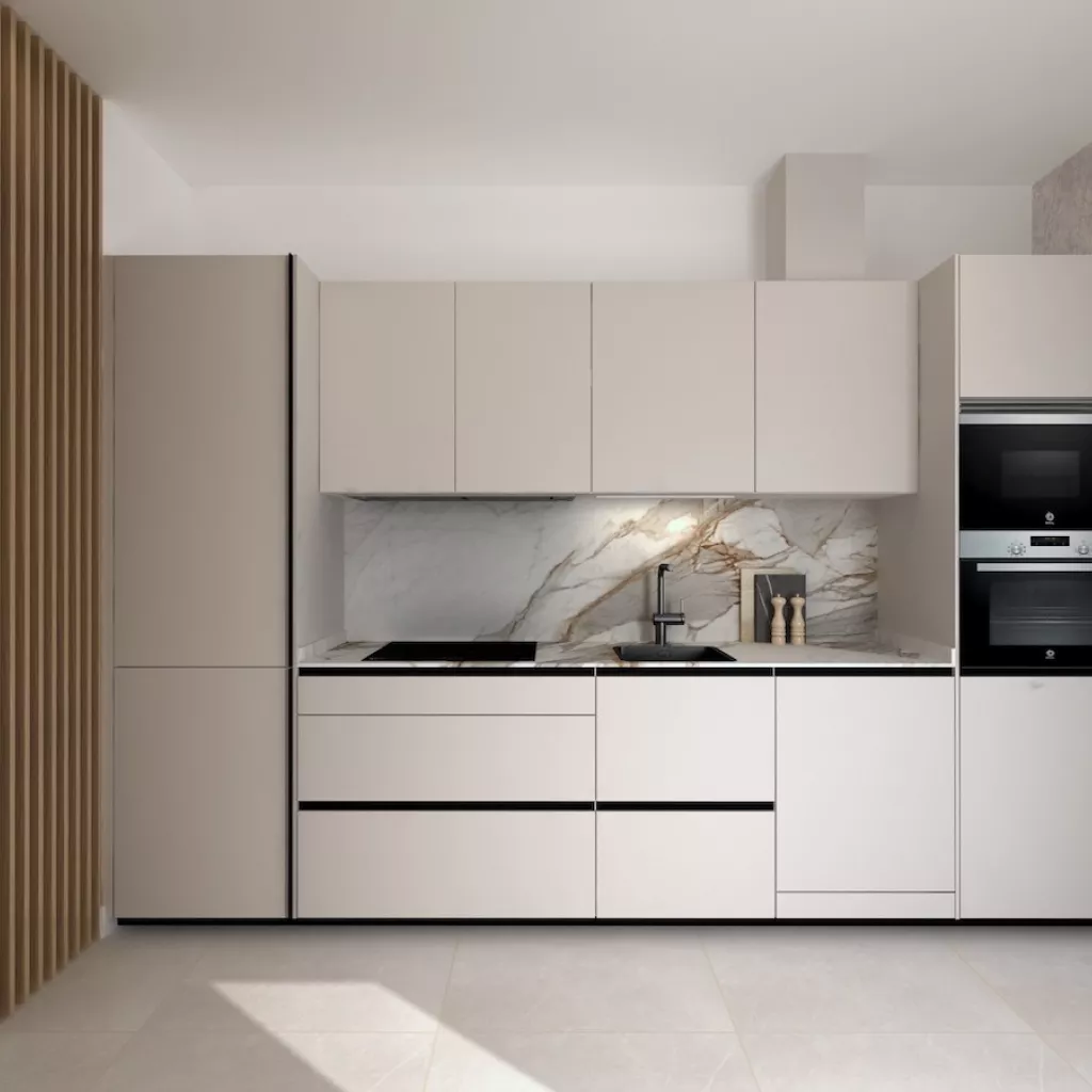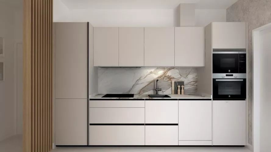 Proyecto de cocina pequeña de un solo frente en color cashmere que ofrece una combinación perfecta de elegancia y funcionalidad. La suave tonalidad del color cashmere crea una atmósfera cálida y acogedora y combinado con la encimera y la trasera de mármol añaden un toque de lujo y sofisticación.