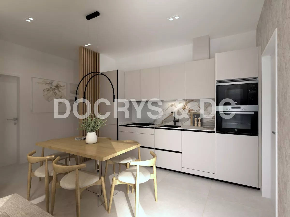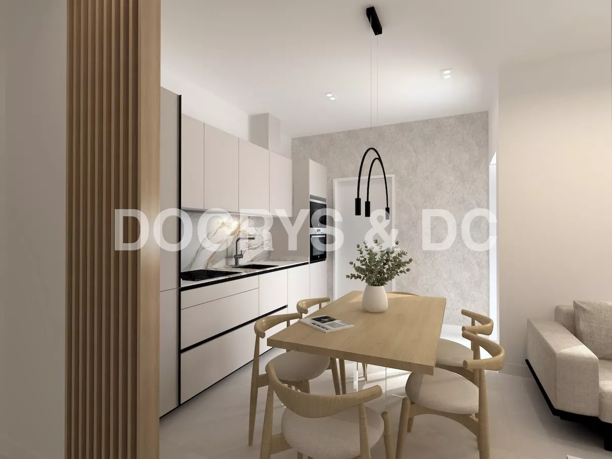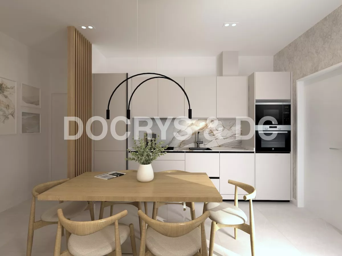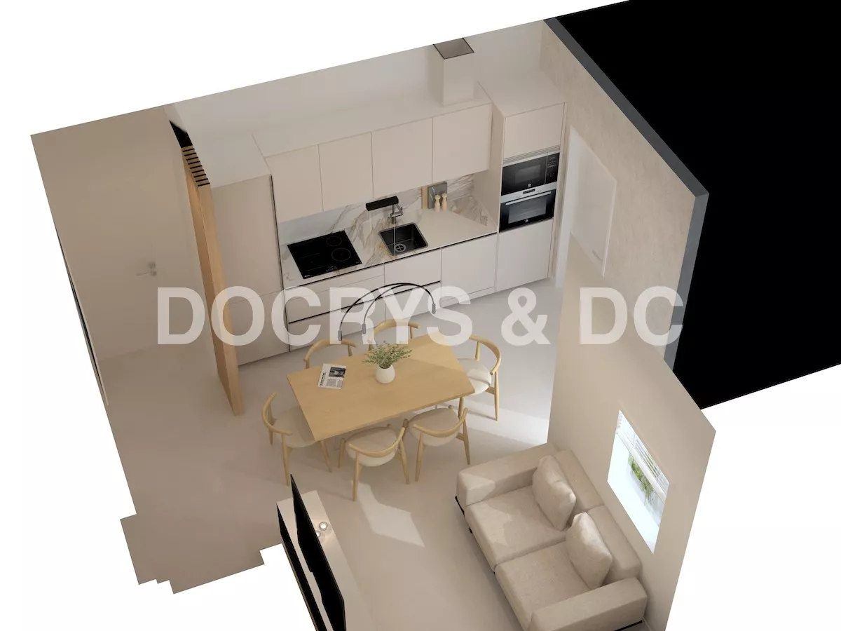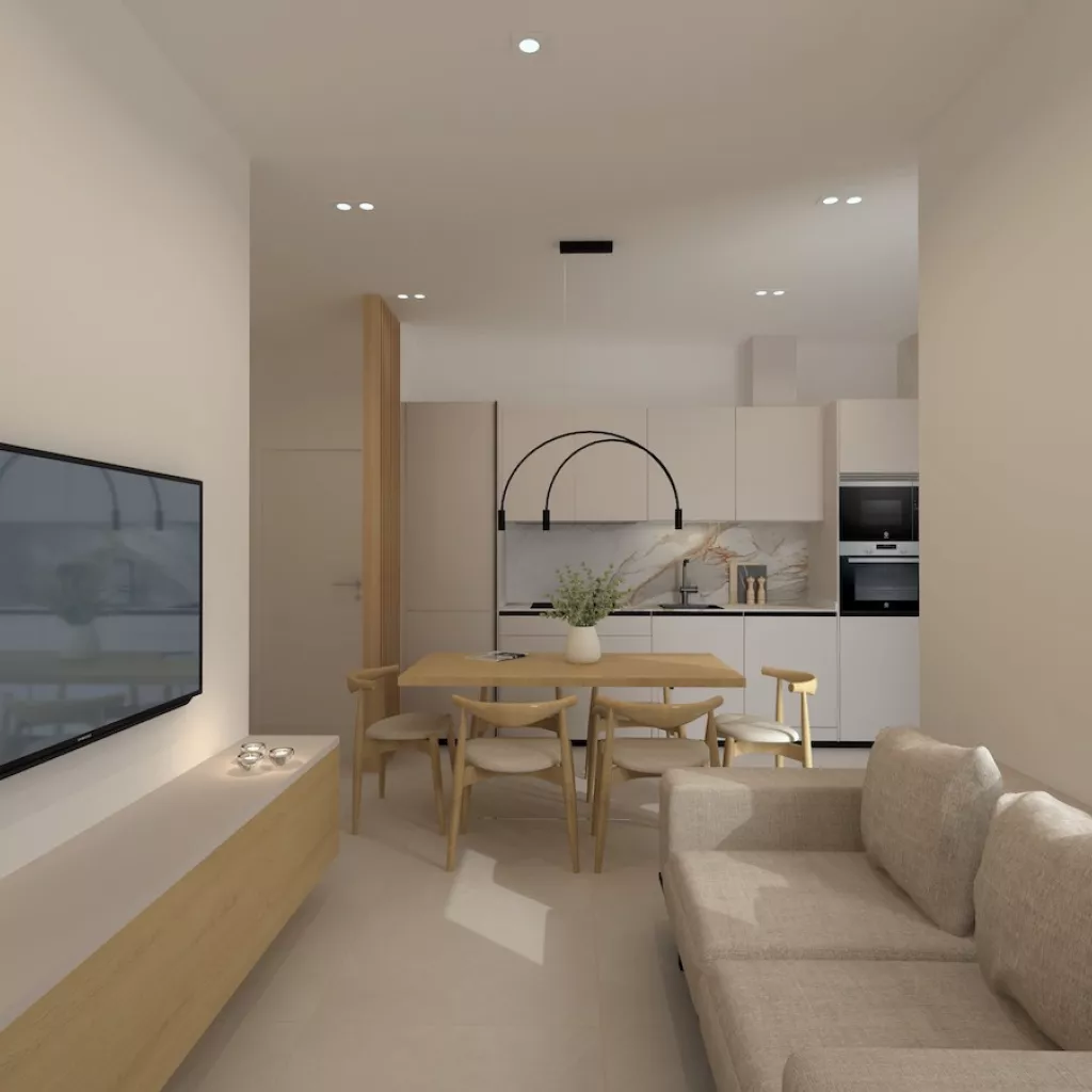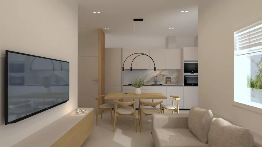 Proyecto de cocina pequeña de un solo frente en color cashmere que ofrece una combinación perfecta de elegancia y funcionalidad. La suave tonalidad del color cashmere crea una atmósfera cálida y acogedora y combinado con la encimera y la trasera de mármol añaden un toque de lujo y sofisticación.